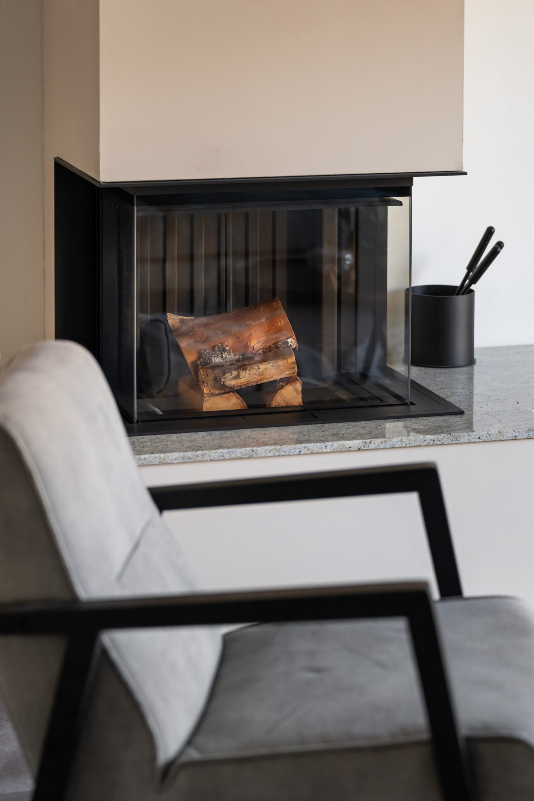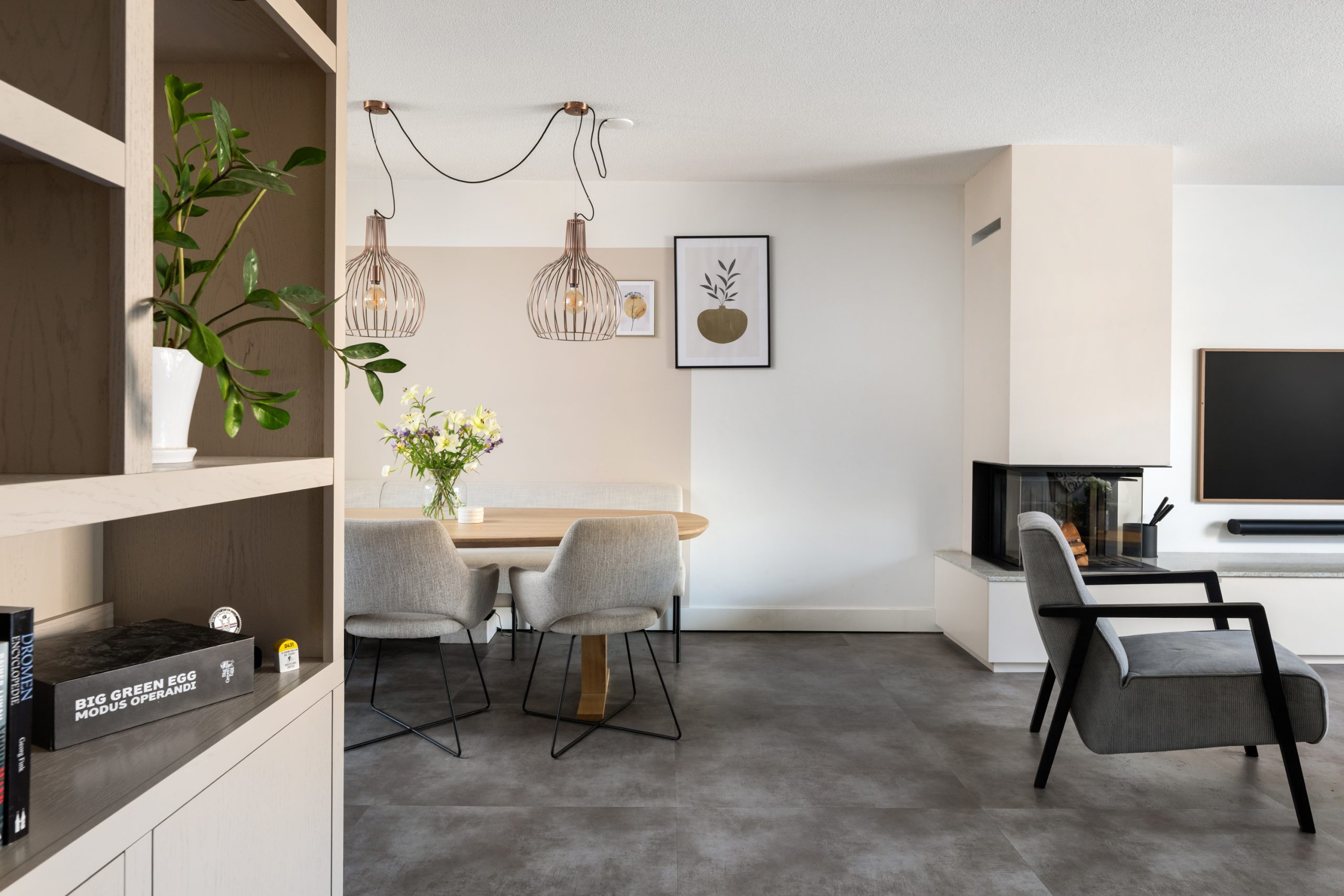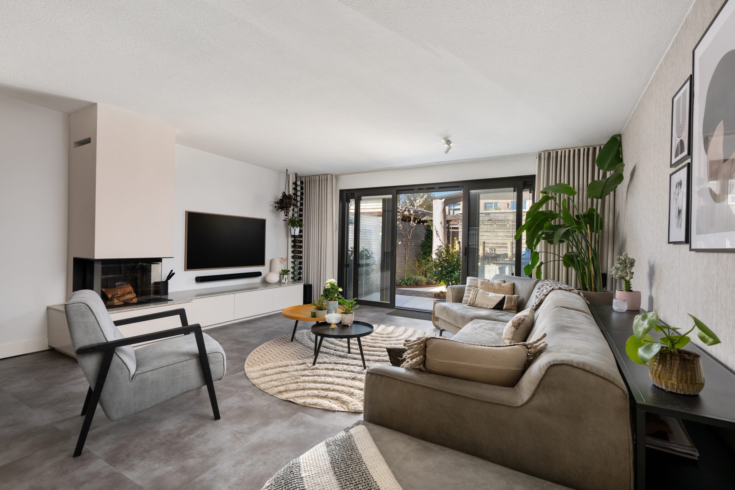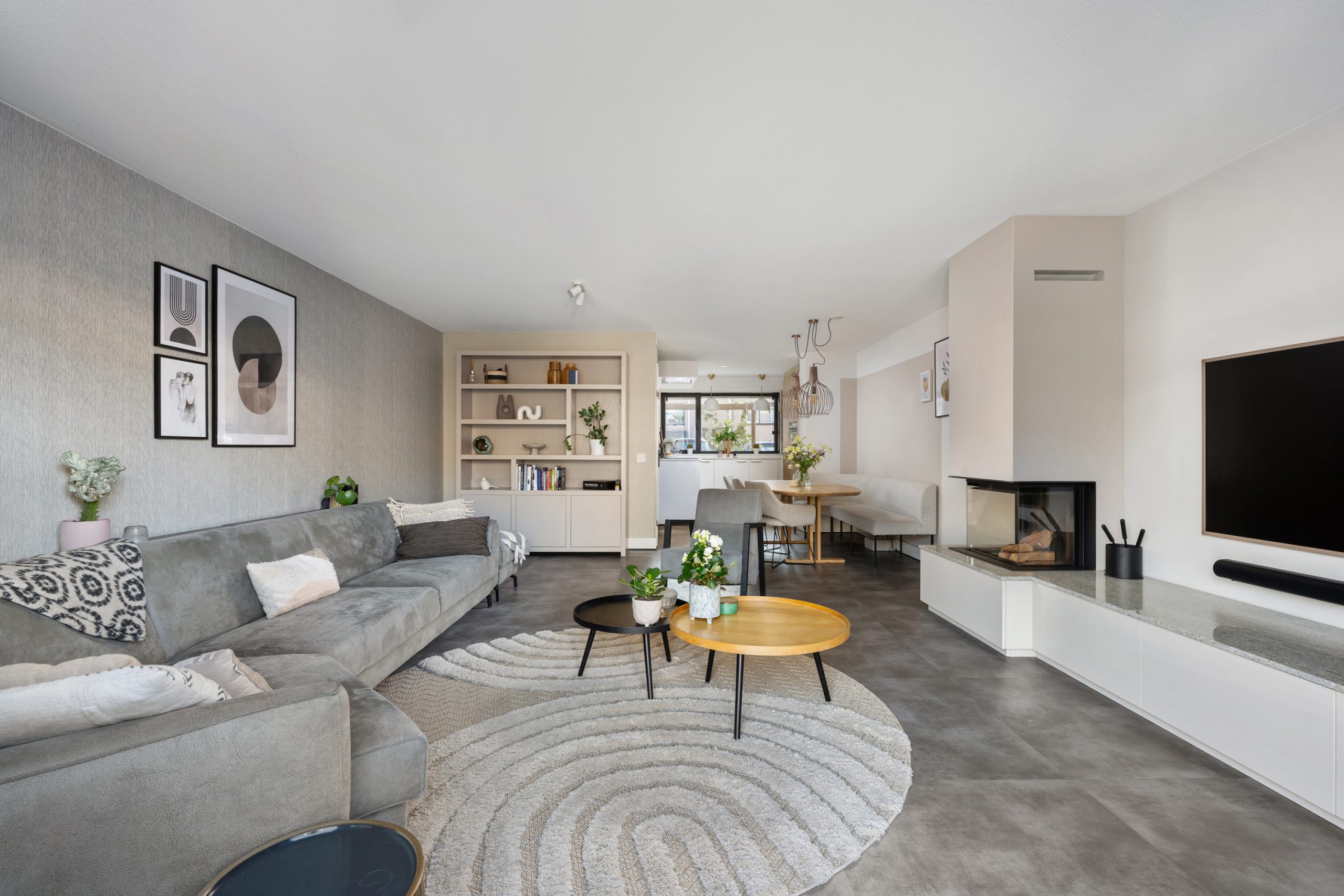 De gehele begane grond is voorzien van een fraaie pvc-vloer met vloerverwarming, een praktische trapkast, een gezellige open haard en aluminium kozijnen.