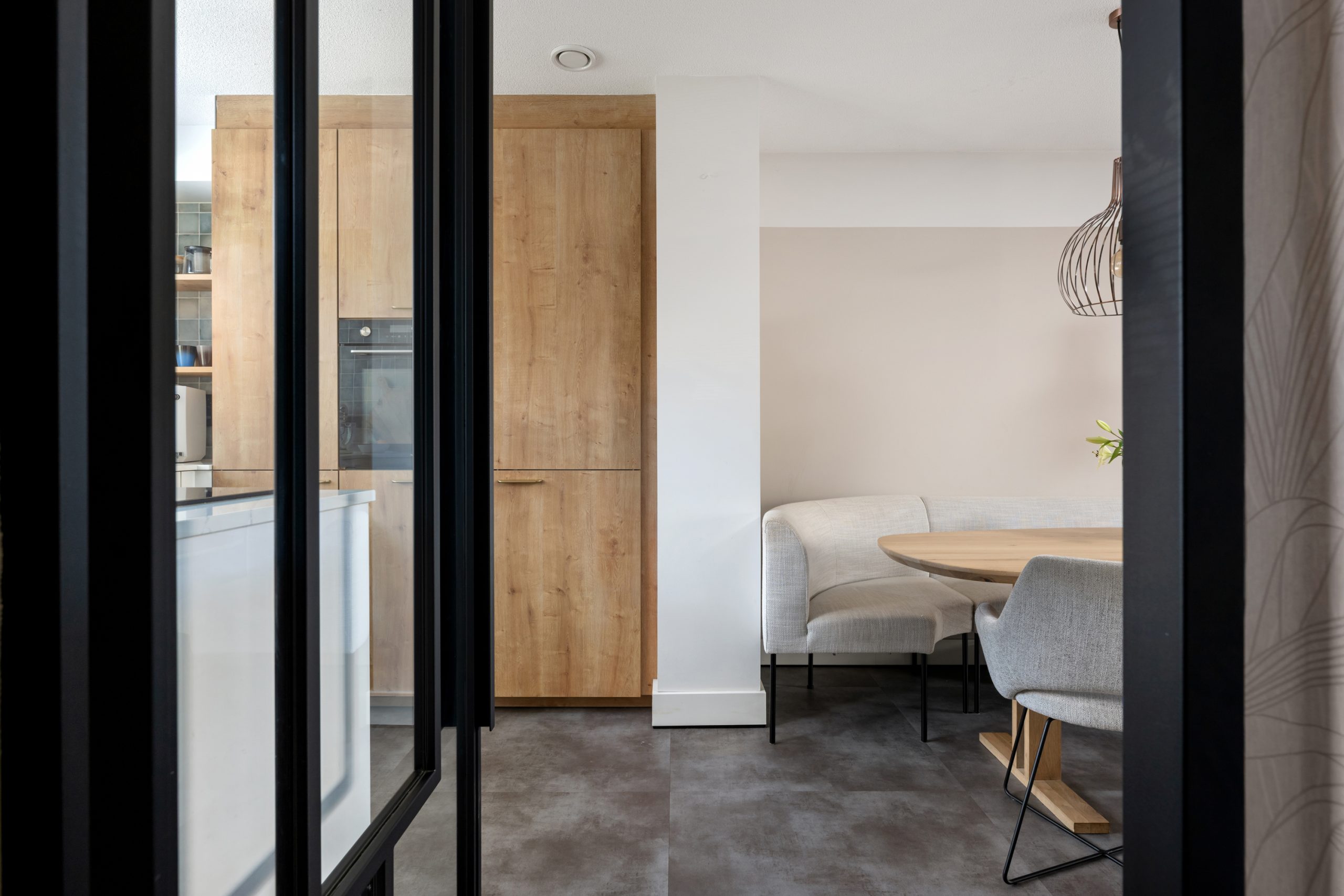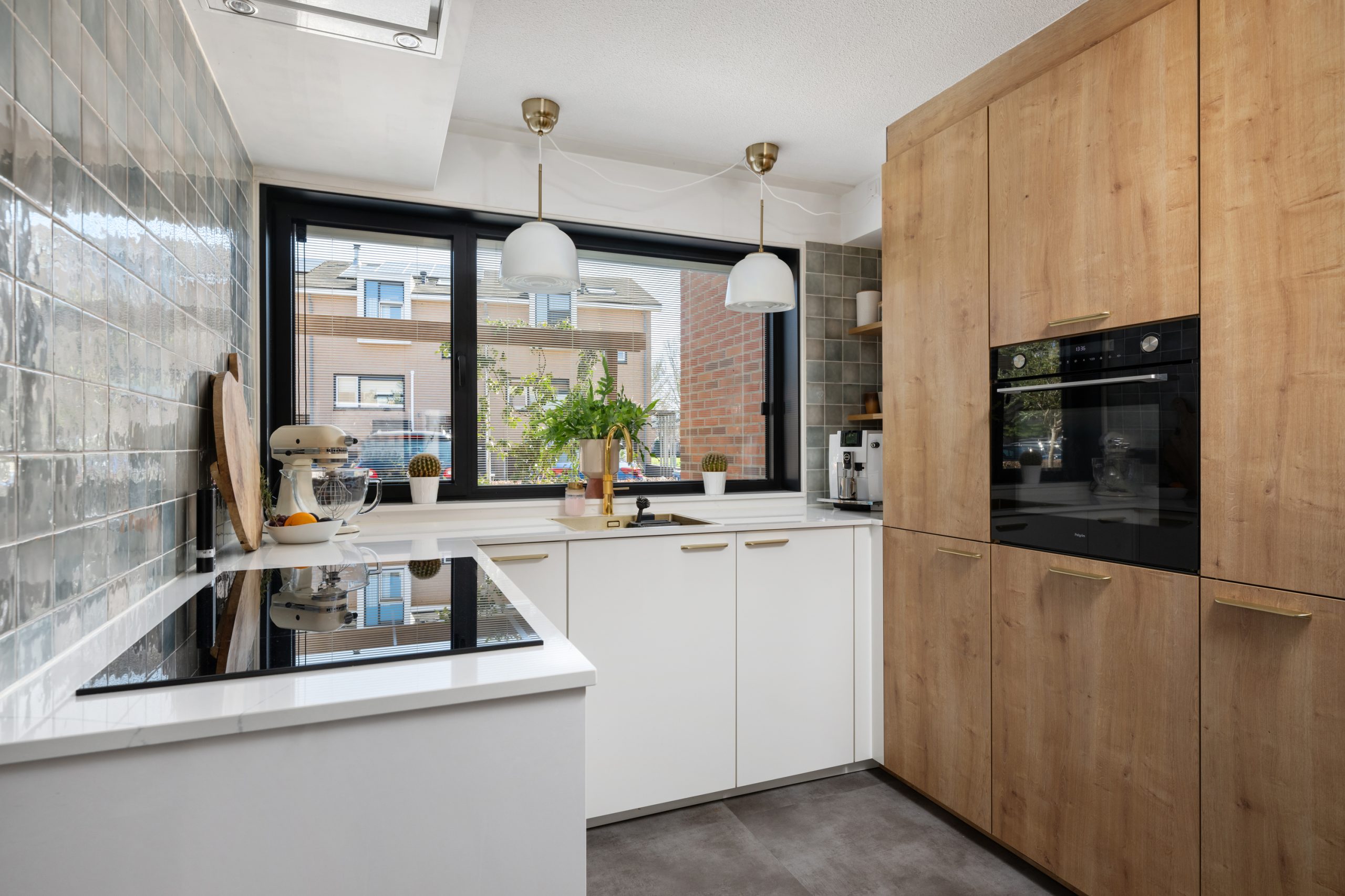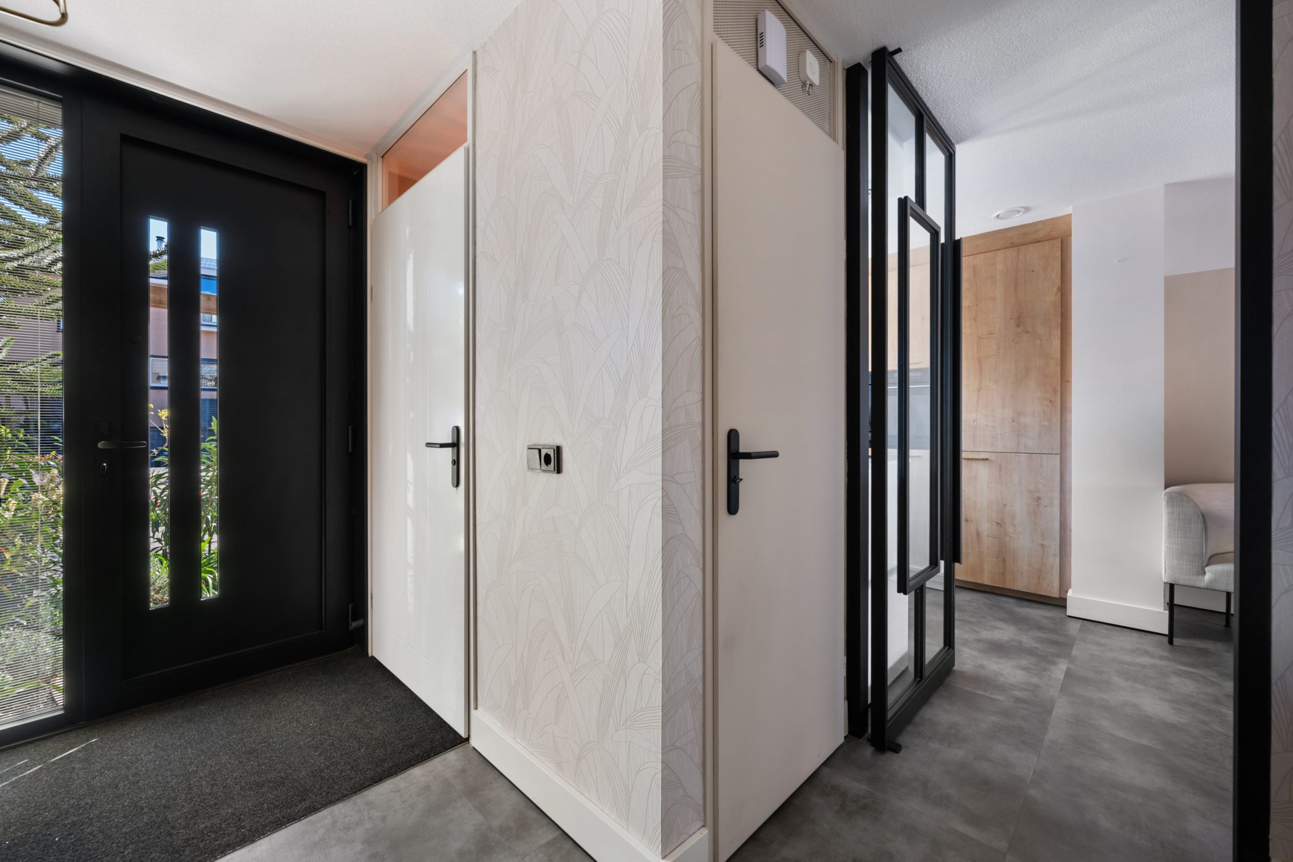 Entree met hal, meterkast, modern toilet en trapopgang. Via de stijlvolle plafondhoge stalen taatsdeur stap je de lichte en sfeervolle woonkamer binnen. Aan de voorzijde bevindt zich de luxe open keuken, uitgerust met hoogwaardige inbouwapparatuur zoals een grote koelkast, vaatwasser, inductiekookplaat, combi-oven en Quooker.