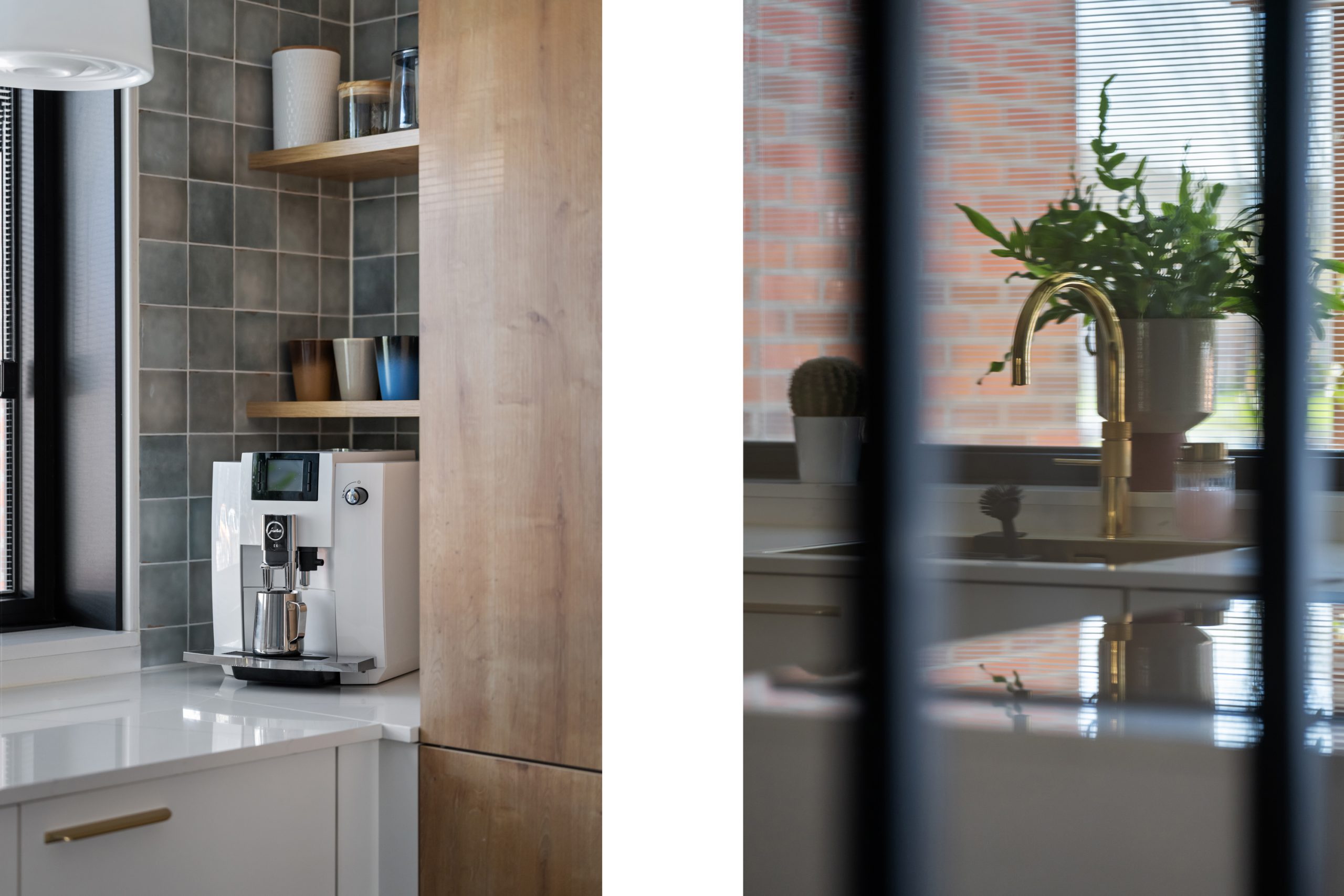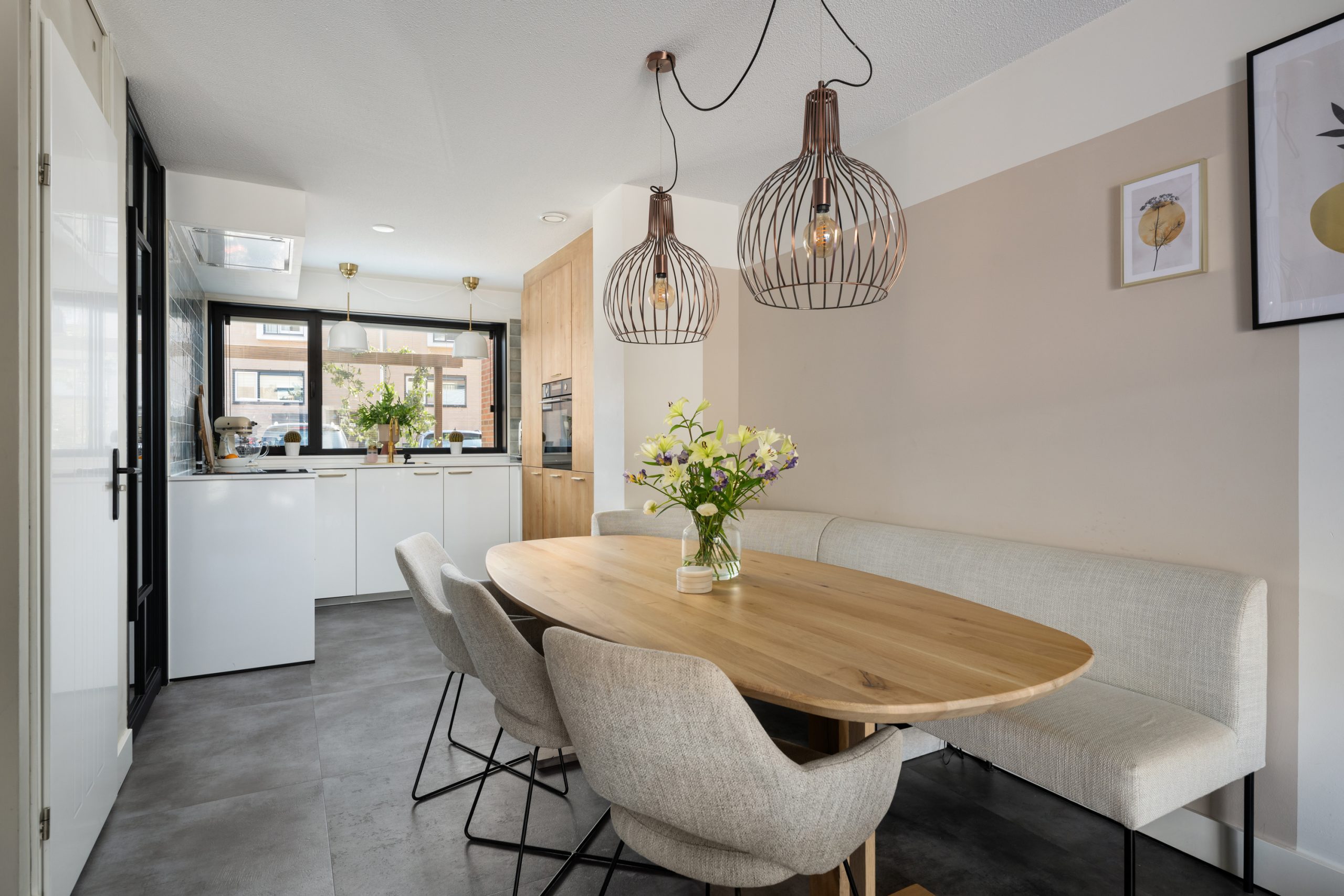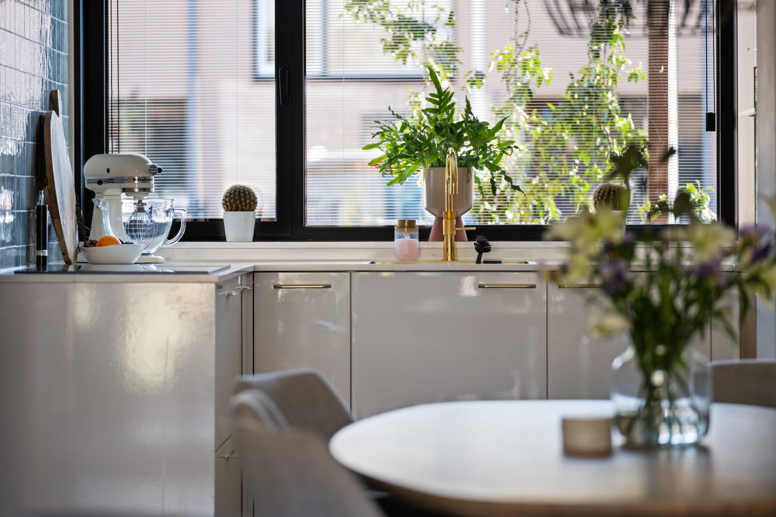 Entree met hal, meterkast, modern toilet en trapopgang. Via de stijlvolle plafondhoge stalen taatsdeur stap je de lichte en sfeervolle woonkamer binnen. Aan de voorzijde bevindt zich de luxe open keuken, uitgerust met hoogwaardige inbouwapparatuur zoals een grote koelkast, vaatwasser, inductiekookplaat, combi-oven en Quooker.