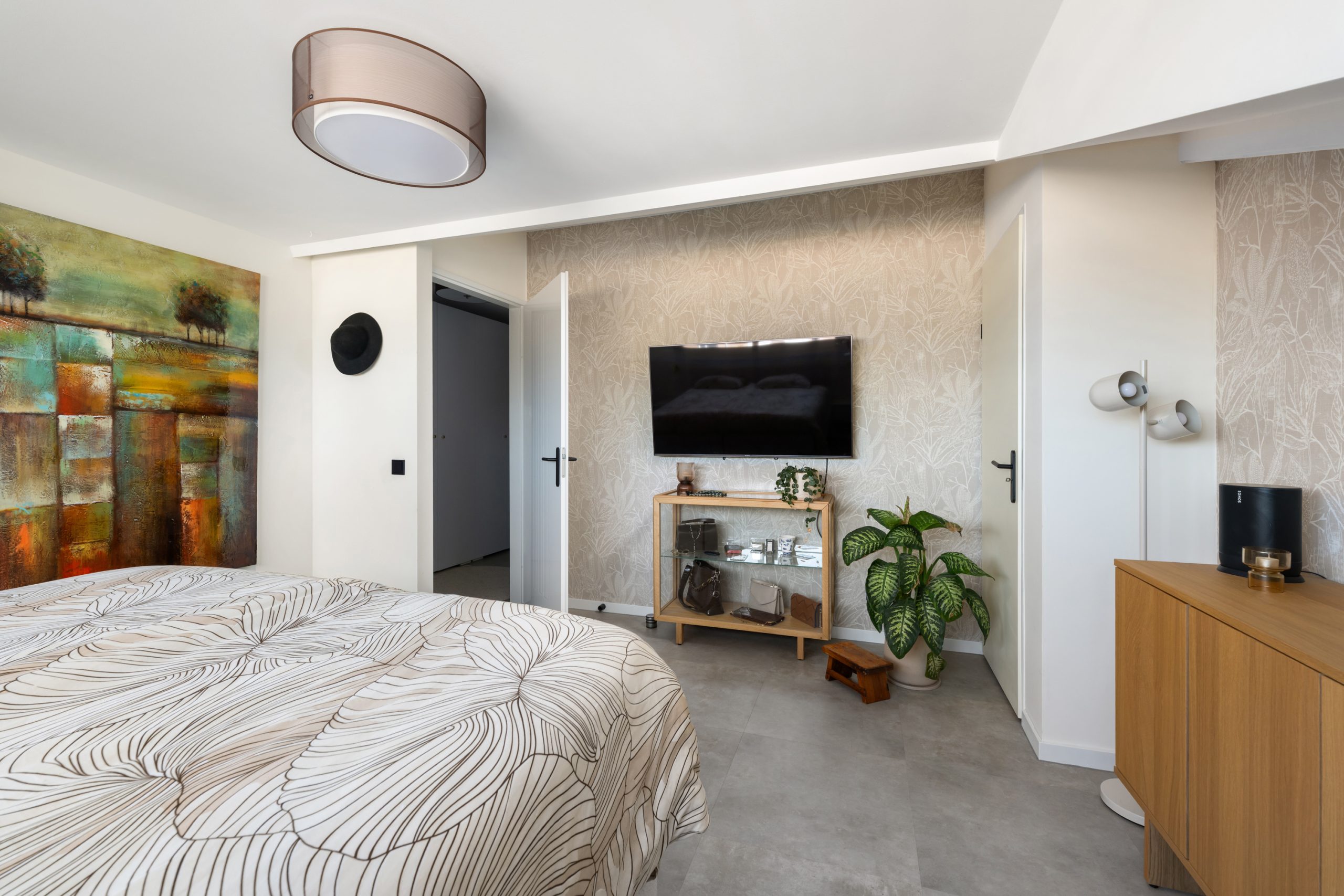 Slaapkamer 1, gelegen aan de voorzijde en is voorzien van vaste schuifkasten en een elektrisch rolluik.