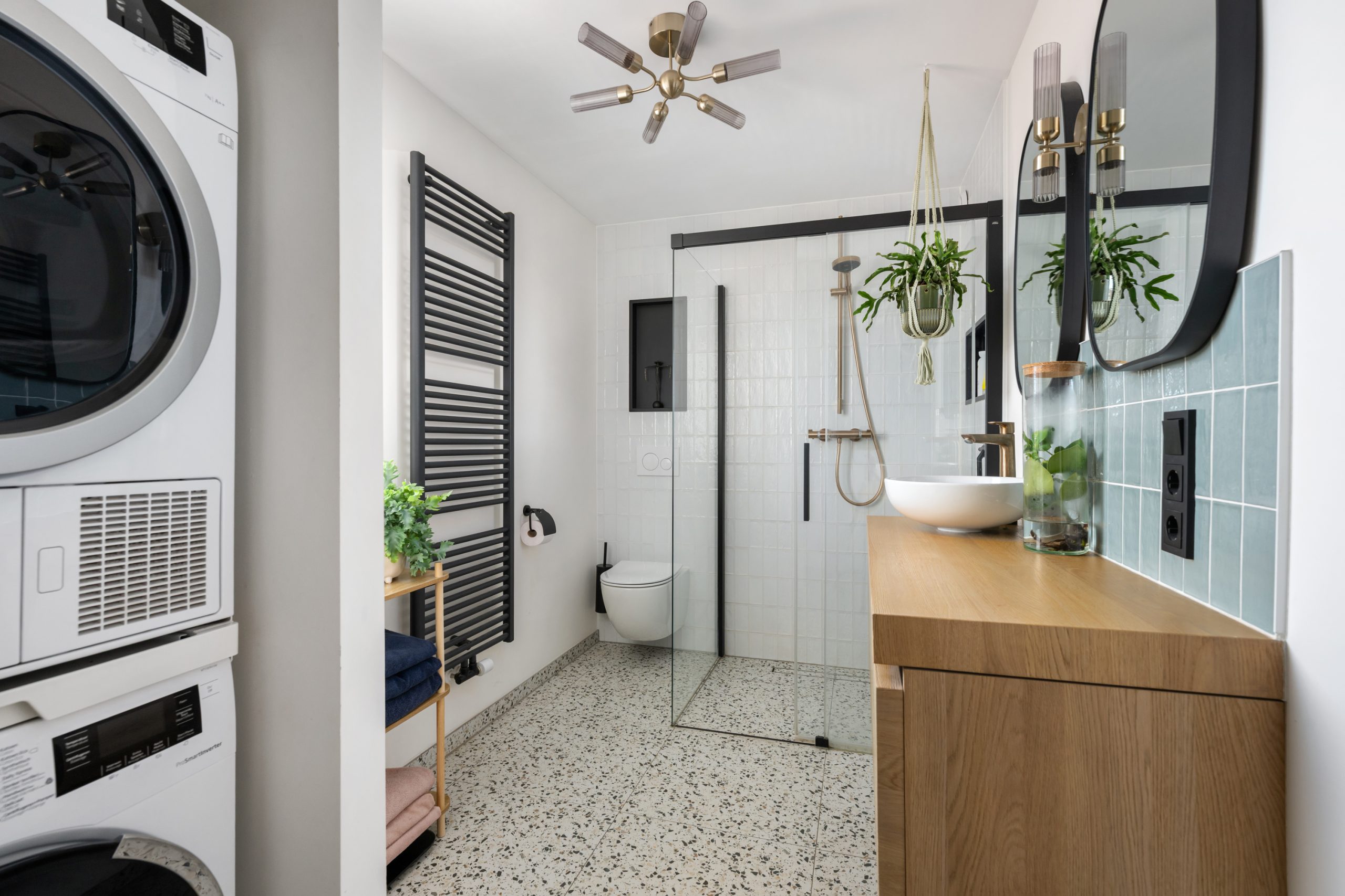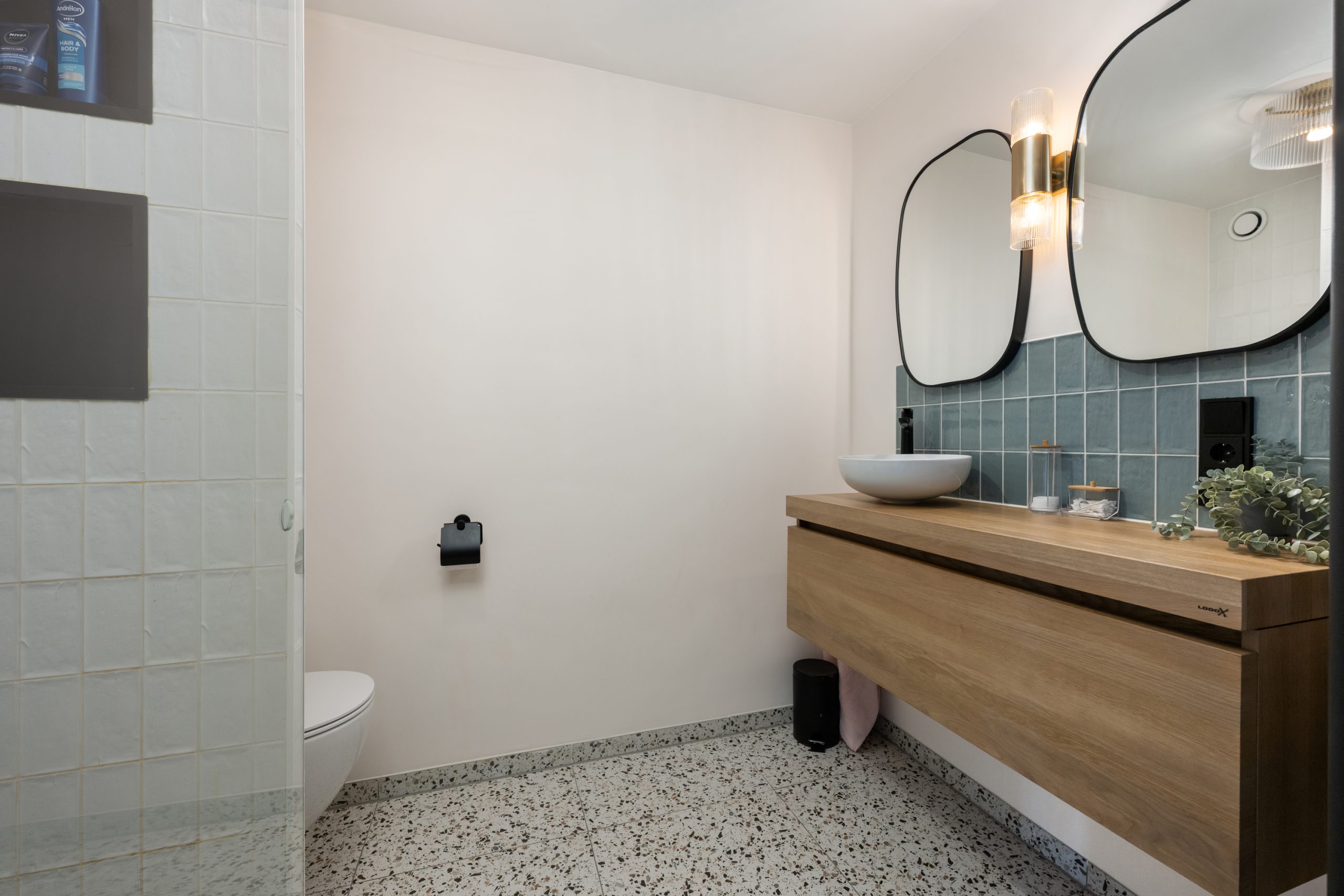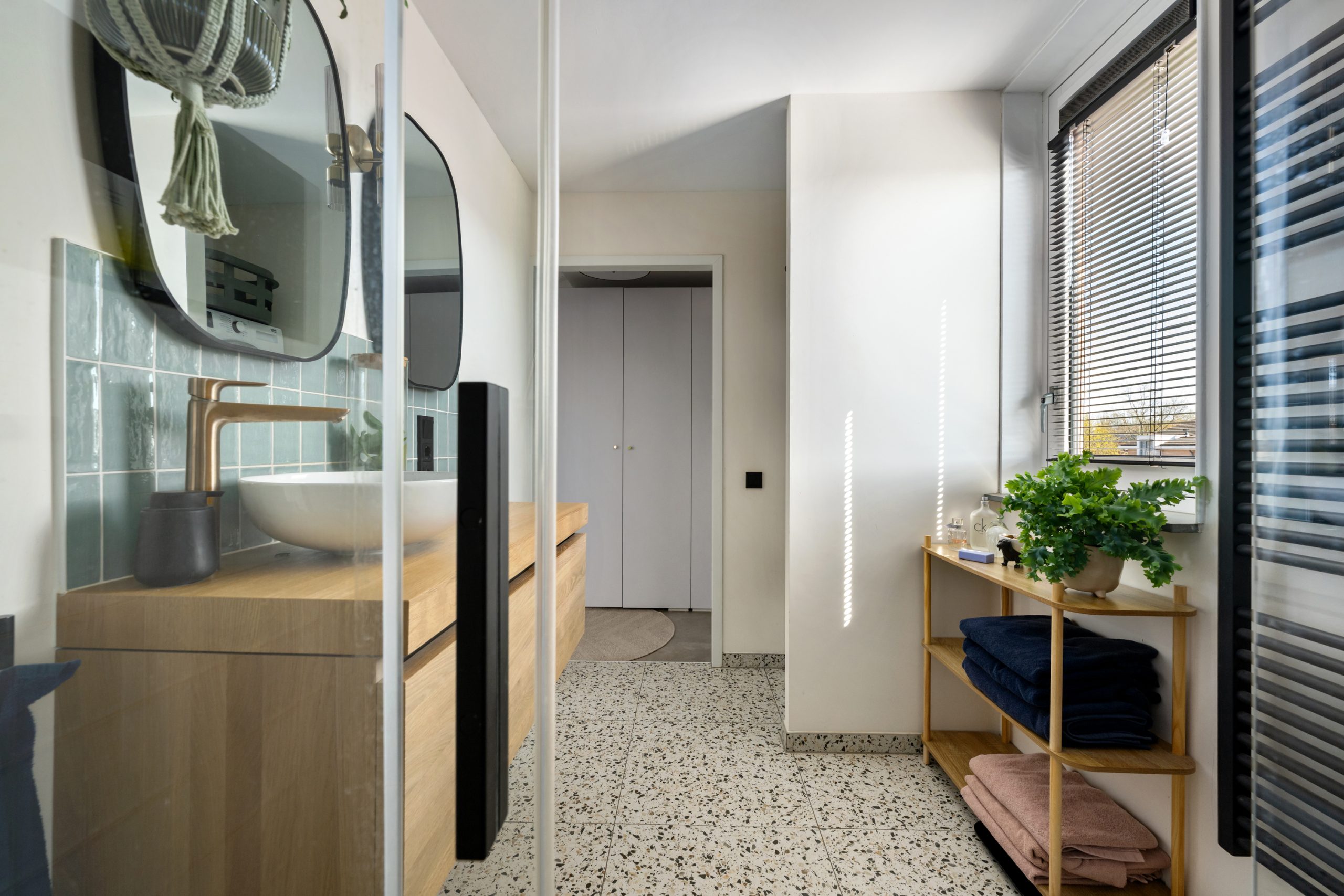 De tweede badkamer is gelegen aan de voorzijde en is uitgerust met een douche, wastafel, toilet, handdoekradiator. Tevens bevinden zich hier de aansluitingen voor de wasmachine en droger.