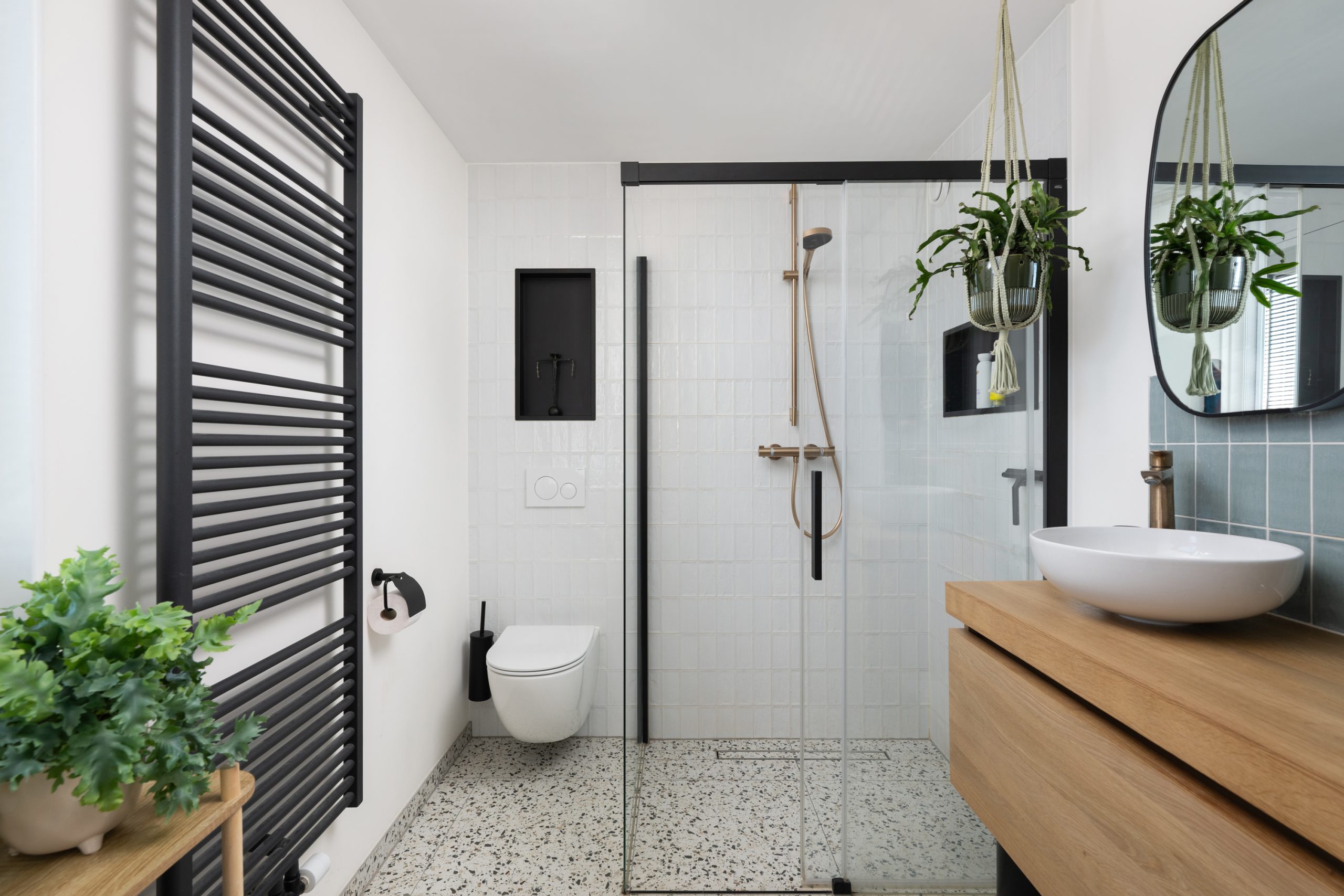 De moderne badkamer is compleet uitgevoerd met een douche, toilet, wastafel en handdoekradiator.