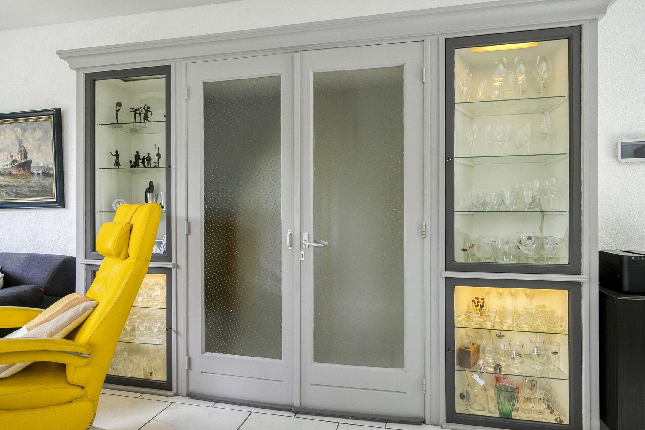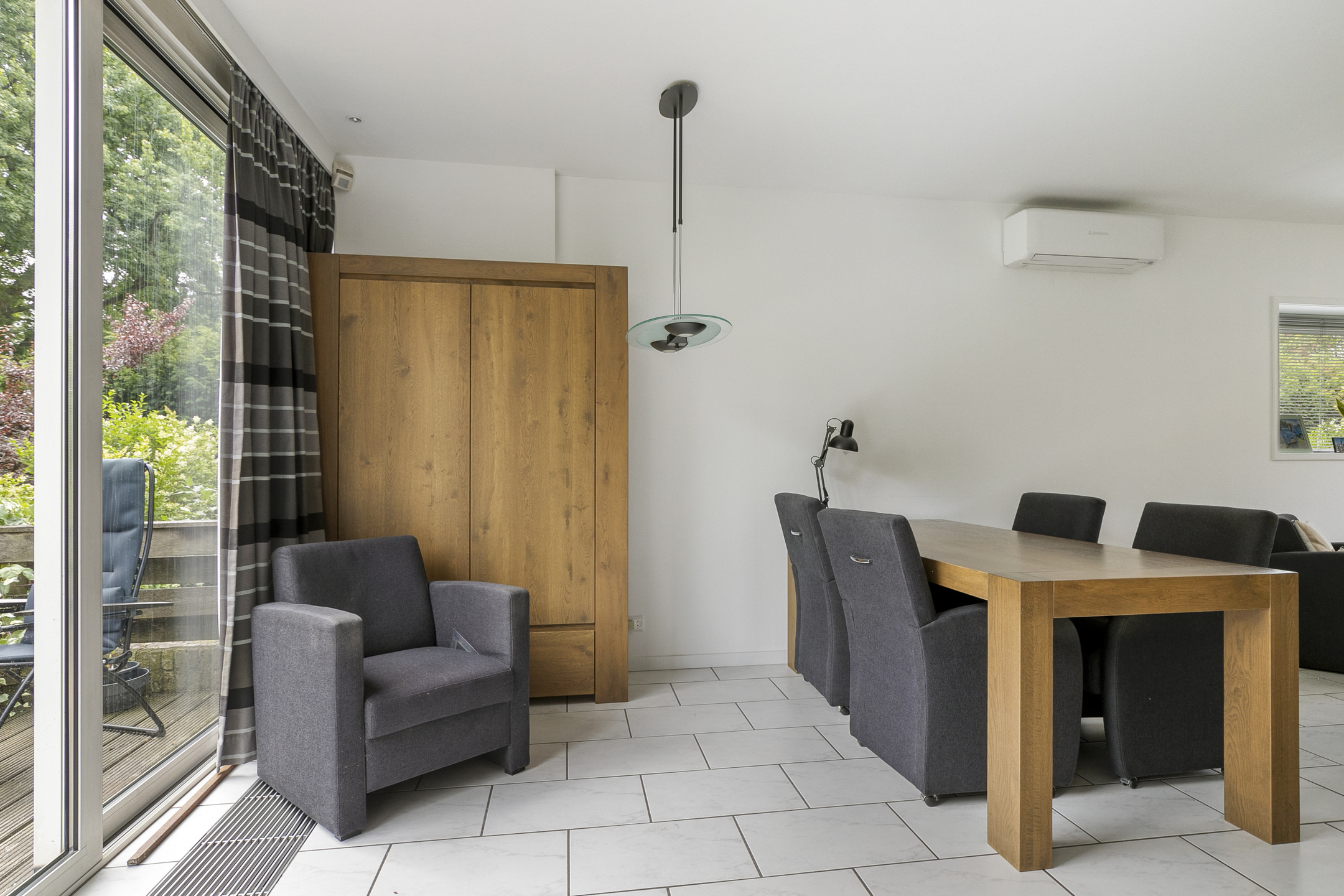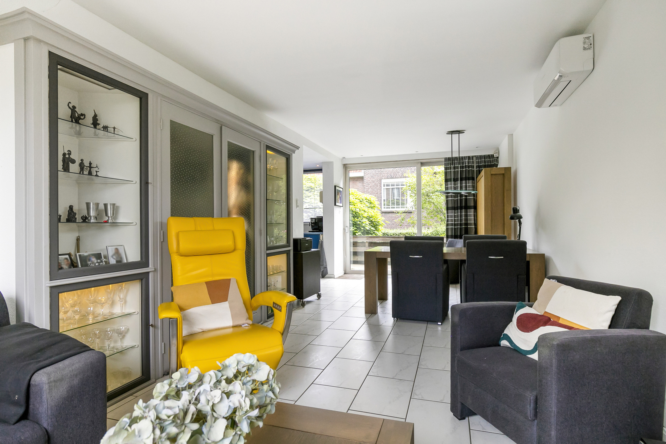 De woonkamer aan de voorzijde is voorzien van originele vaste kasten en een airco-unit die zowel kan koelen als verwarmen. De vloer is afgewerkt met plavuizen voorzien van vloerverwarming, wat zorgt voor extra comfort.