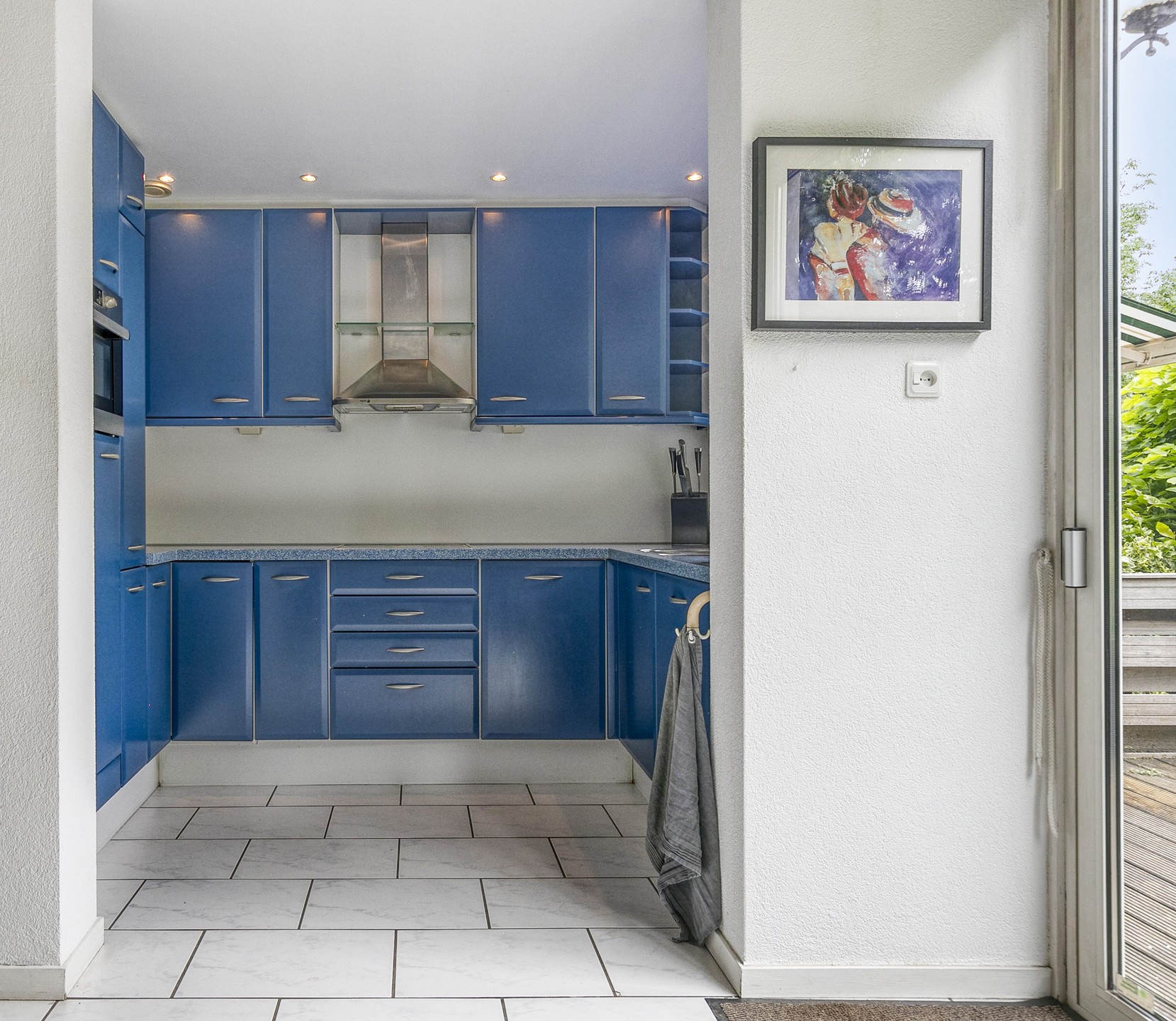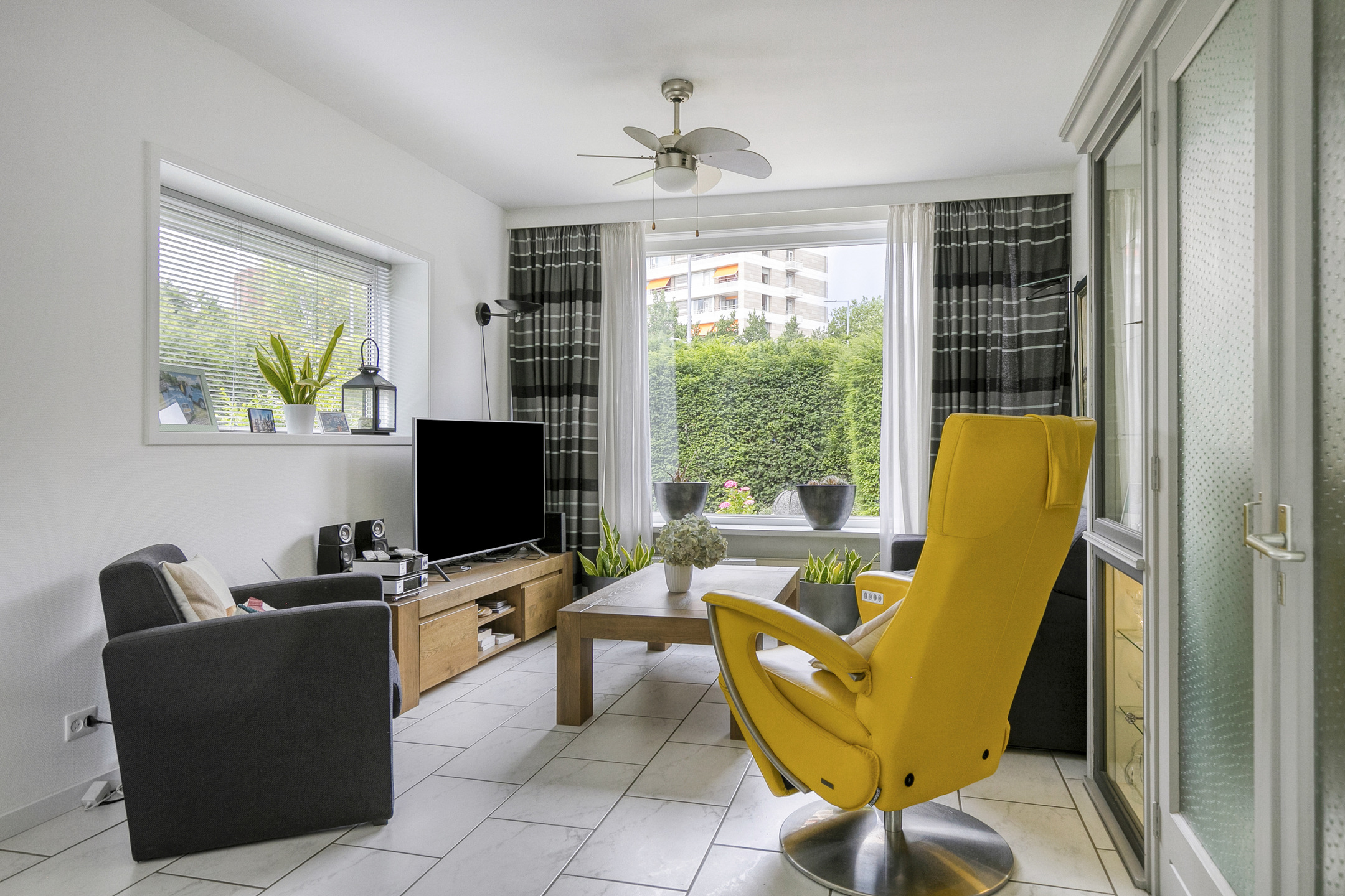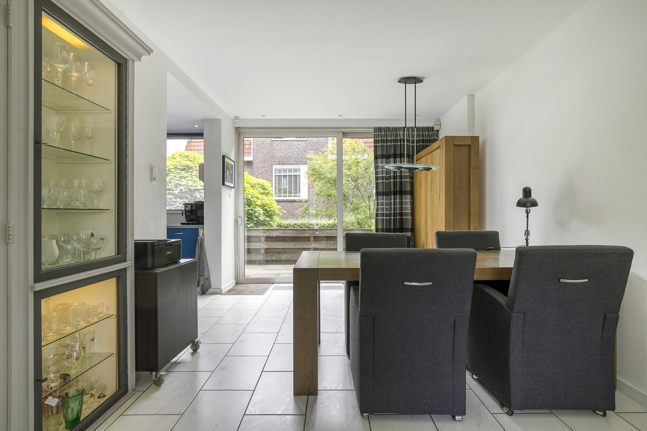 De woonkamer aan de voorzijde is voorzien van originele vaste kasten en een airco-unit die zowel kan koelen als verwarmen. De vloer is afgewerkt met plavuizen voorzien van vloerverwarming, wat zorgt voor extra comfort.