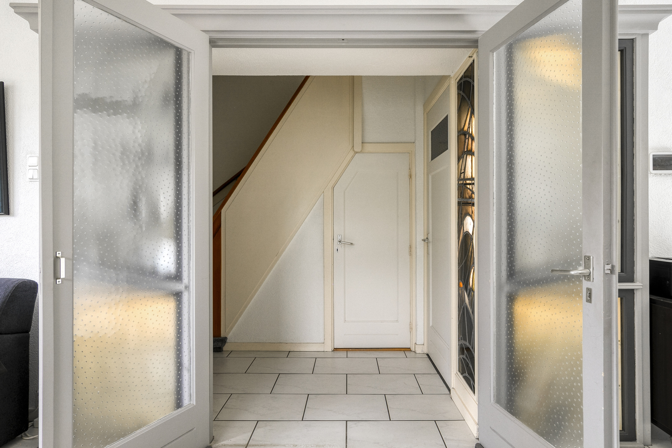 Entree, hal met toegang tot het toilet, het souterrain, de trap naar de eerste verdieping en de woonkamer.
