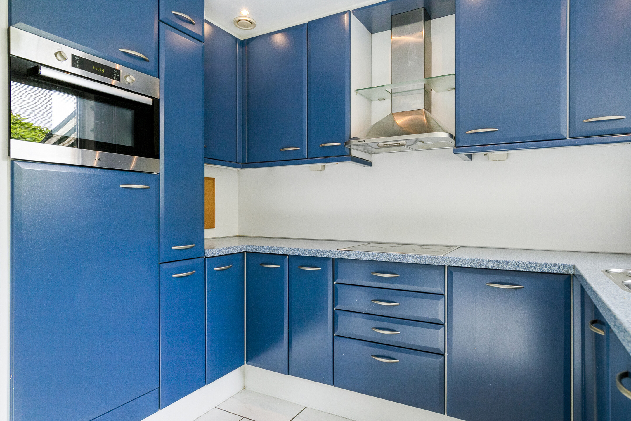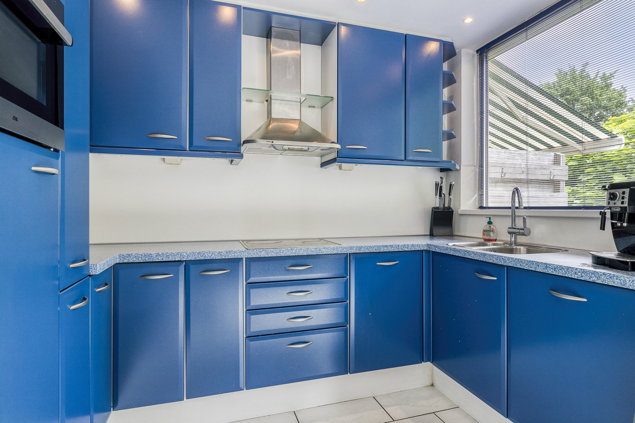 Aan de achterzijde bevindt zich de open keuken, compleet uitgerust met een vaatwasser, combi-magnetron, koelkast, keramische kookplaat, afzuigkap en een spoelbak met mengkraan.