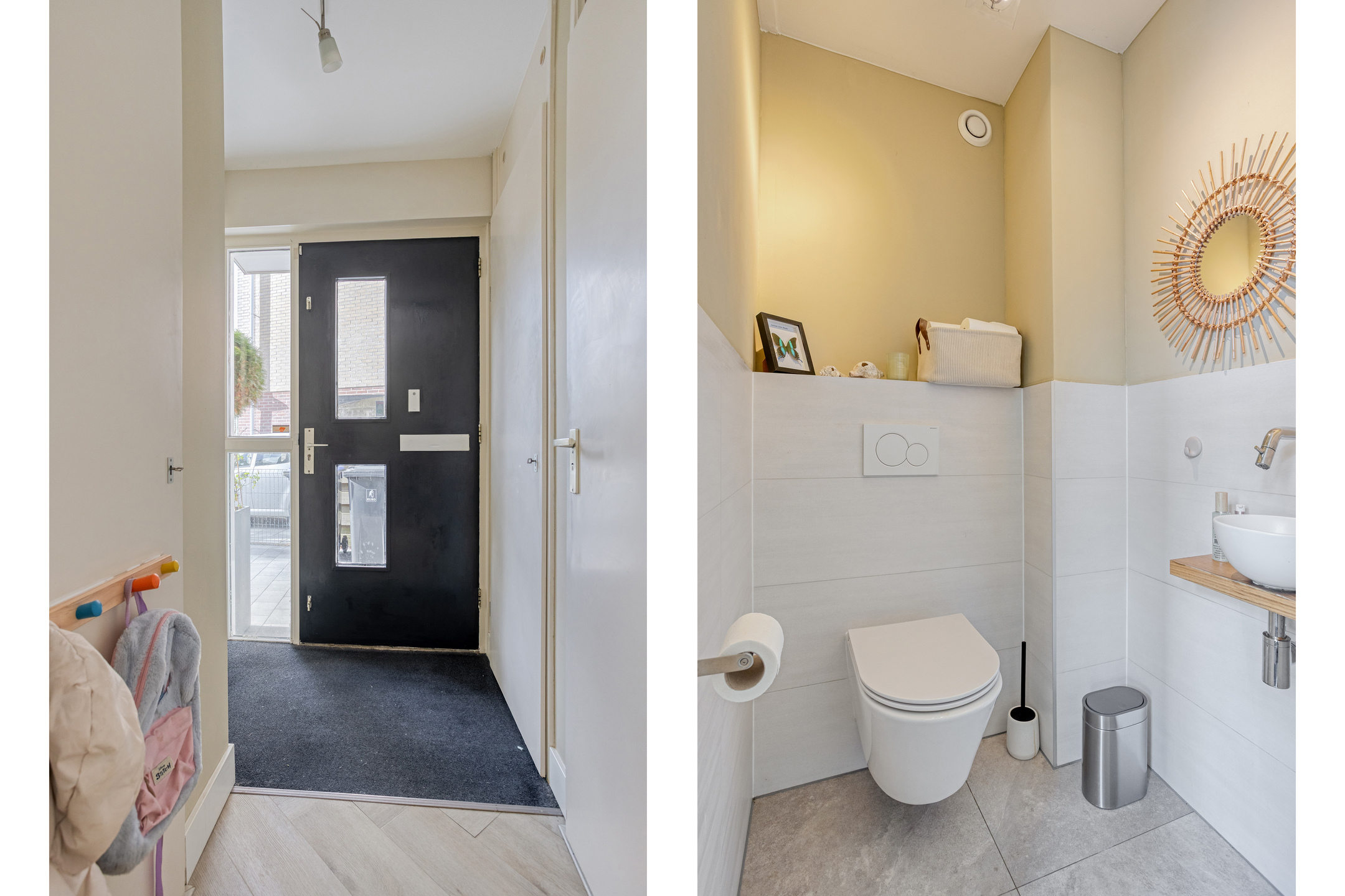 Hal/entree met meterkast, trapkast/garderobe en toiletruimte.