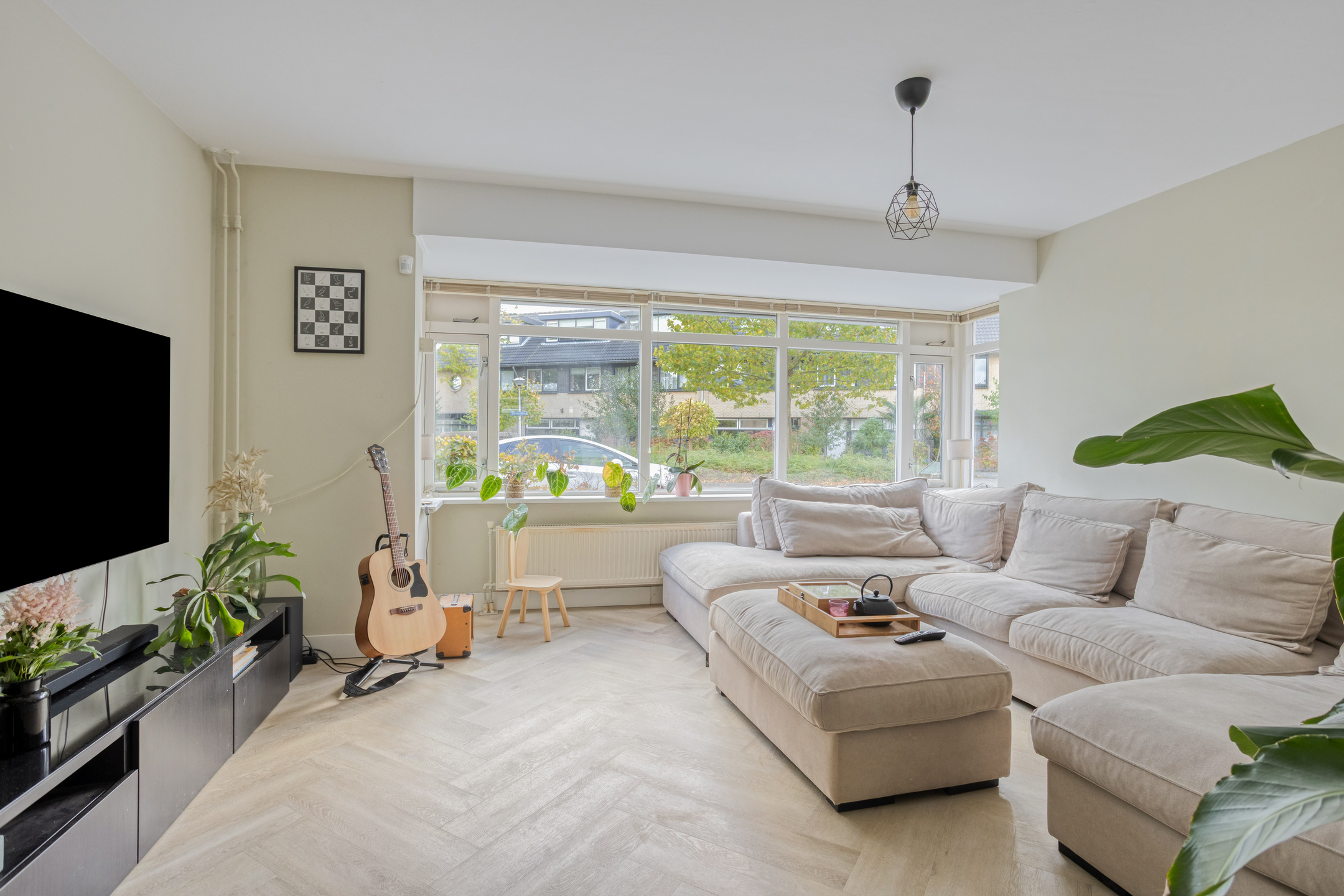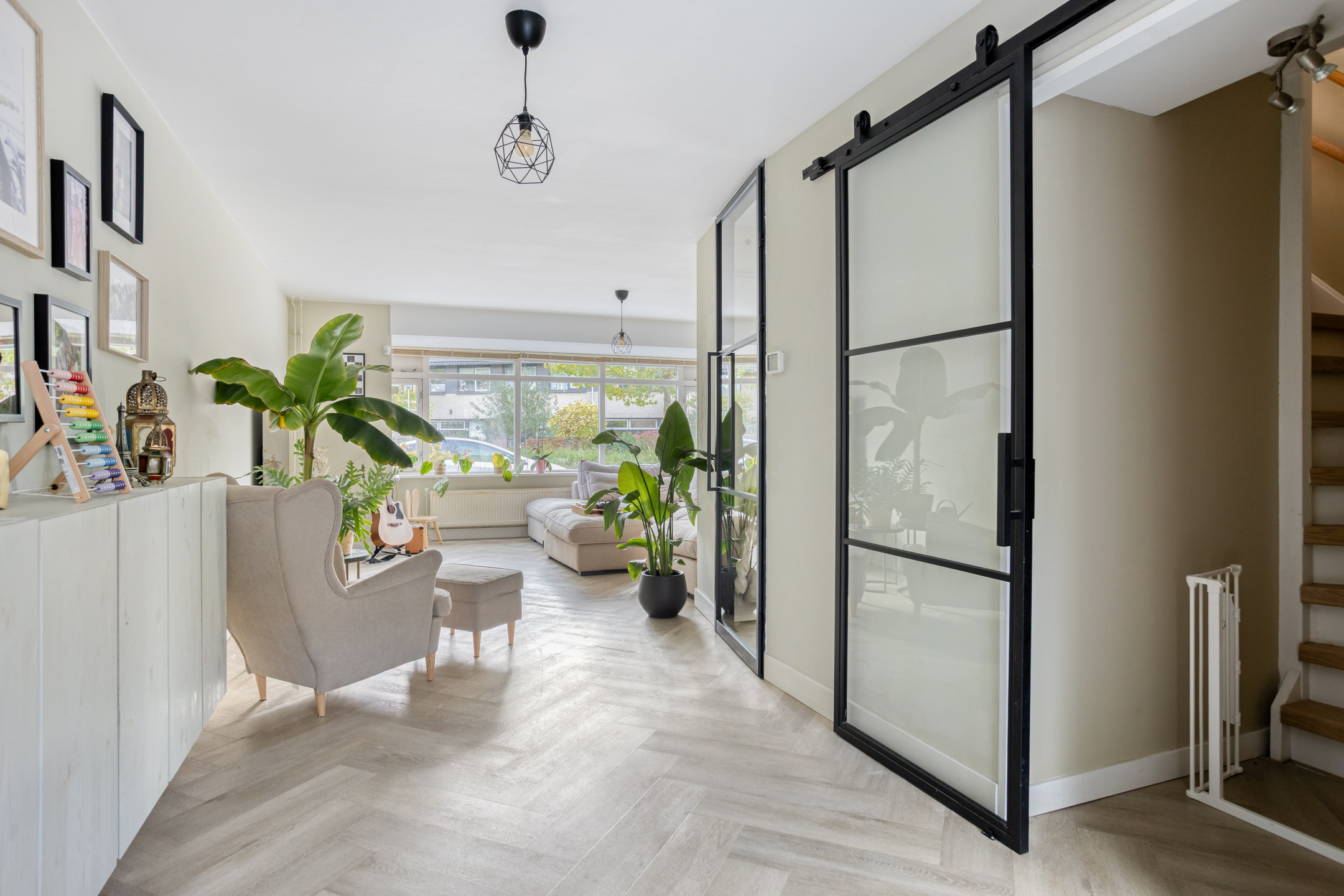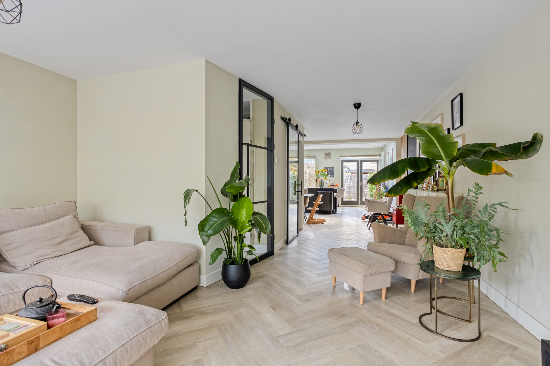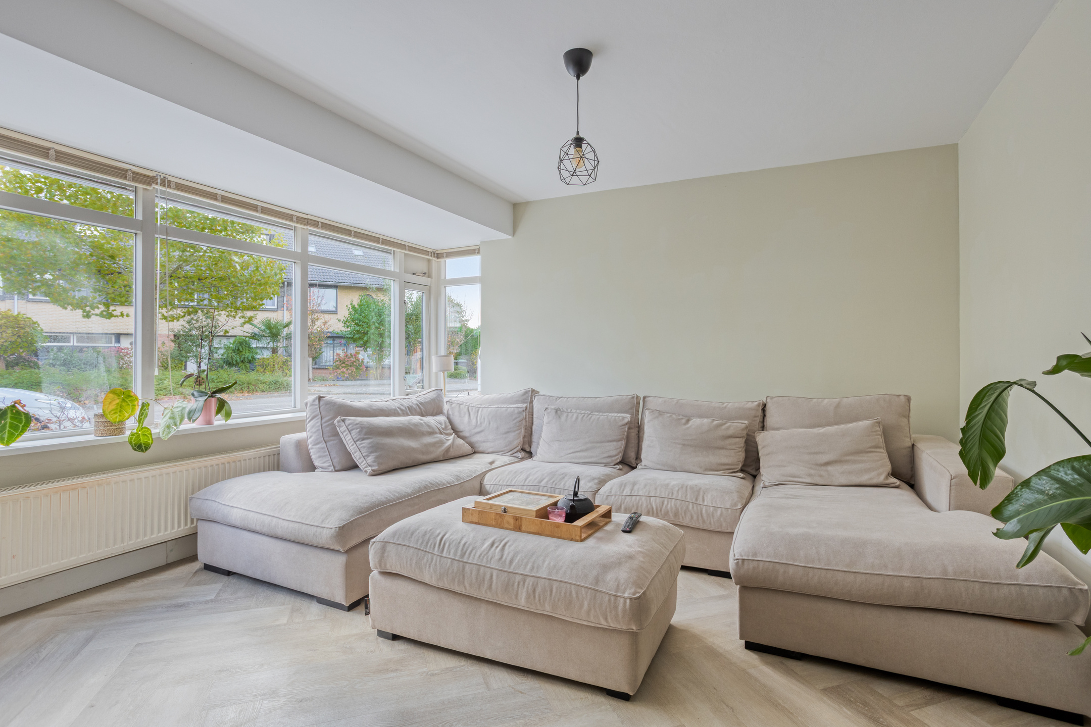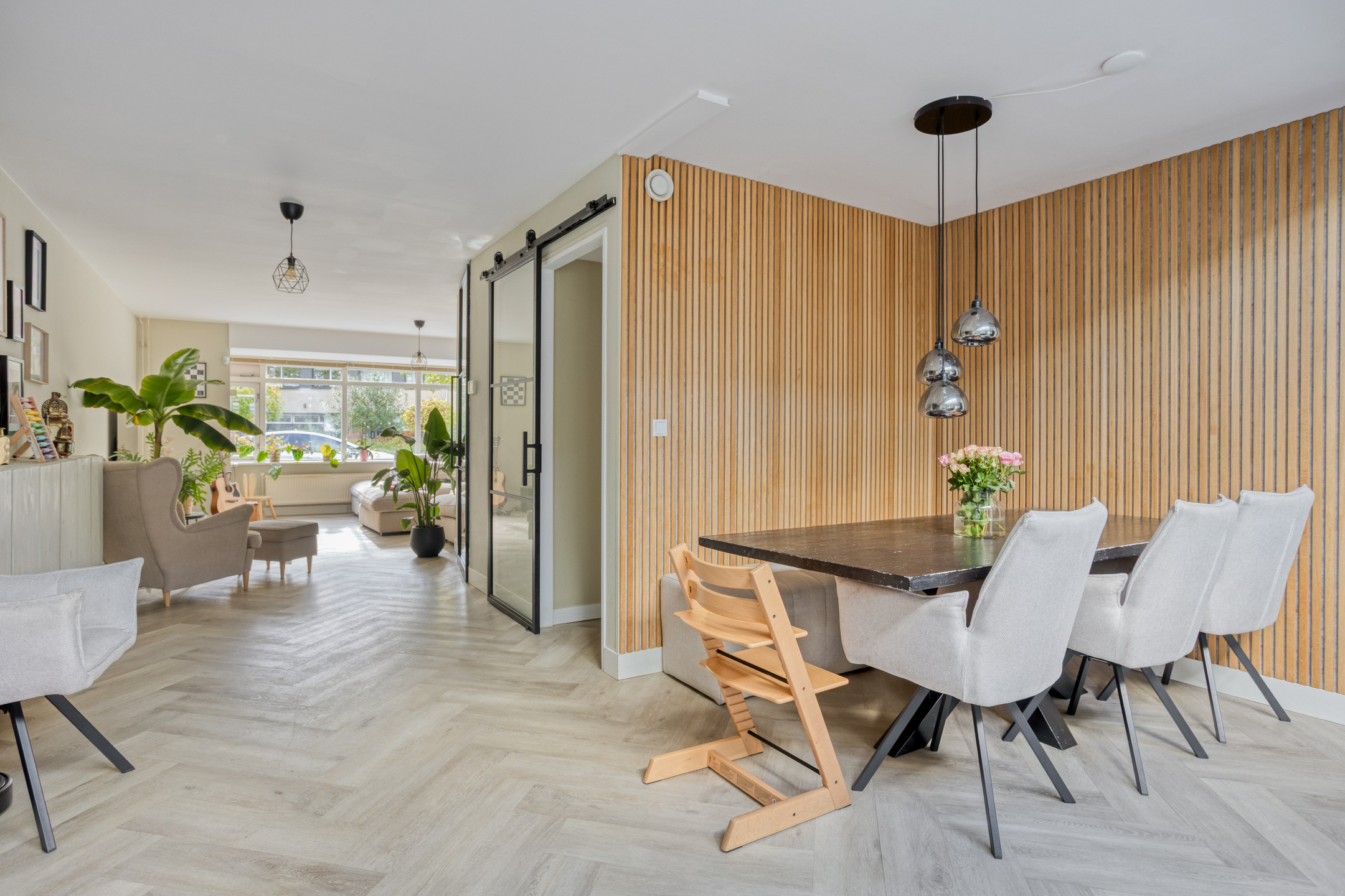 De lichte, royale woonkamer heeft aan de voorzijde een sfeervolle erker en is voorzien van een fraaie visgraat pvc-vloer. Aan de achterzijde is een gezellige eethoek gecreëerd met voldoende ruimte voor een grote eettafel.