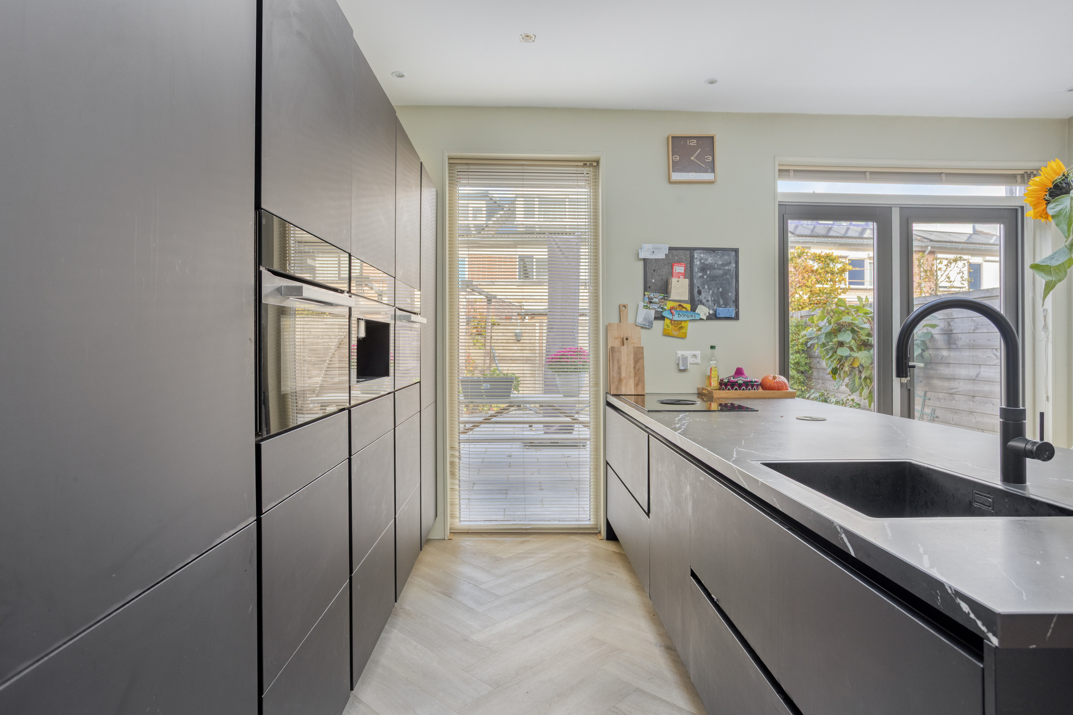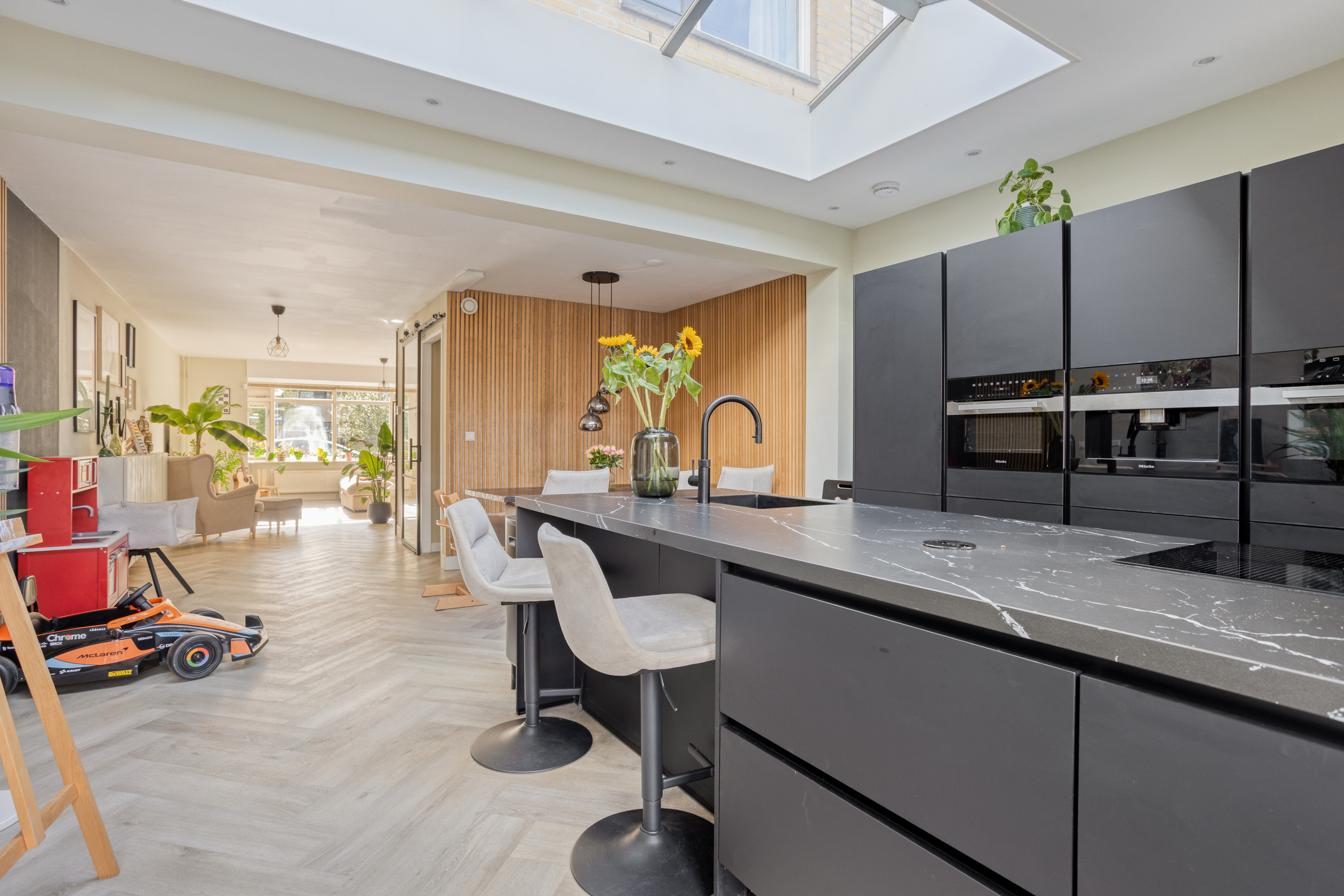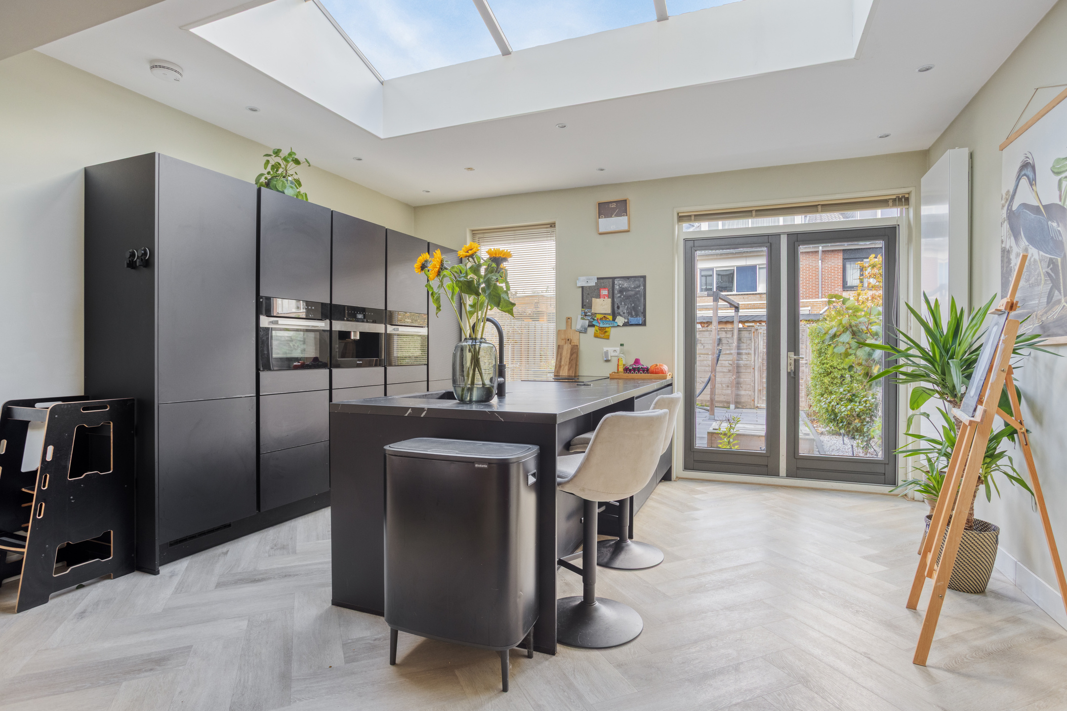 De moderne keuken met kookeiland bevindt zich aan de achterzijde van de woning en is een echte blikvanger. Dankzij de grote lichtkoepel valt er extra veel daglicht binnen, wat zorgt voor een heerlijk lichte en open sfeer. De keuken is bovendien uitgerust met diverse inbouwapparatuur, waaronder een inductiekookplaat met Bora-afzuigsysteem, oven, combi-oven, inbouwkoffiezetapparaat, vriezer, koelkast, vaatwasser en een Quooker.