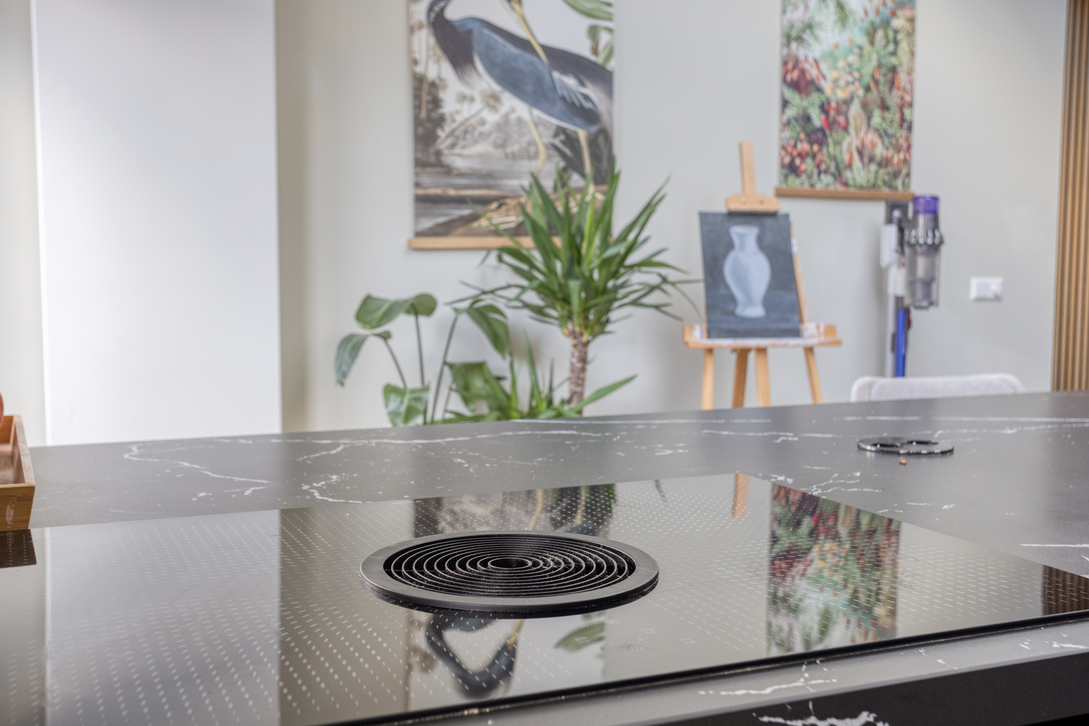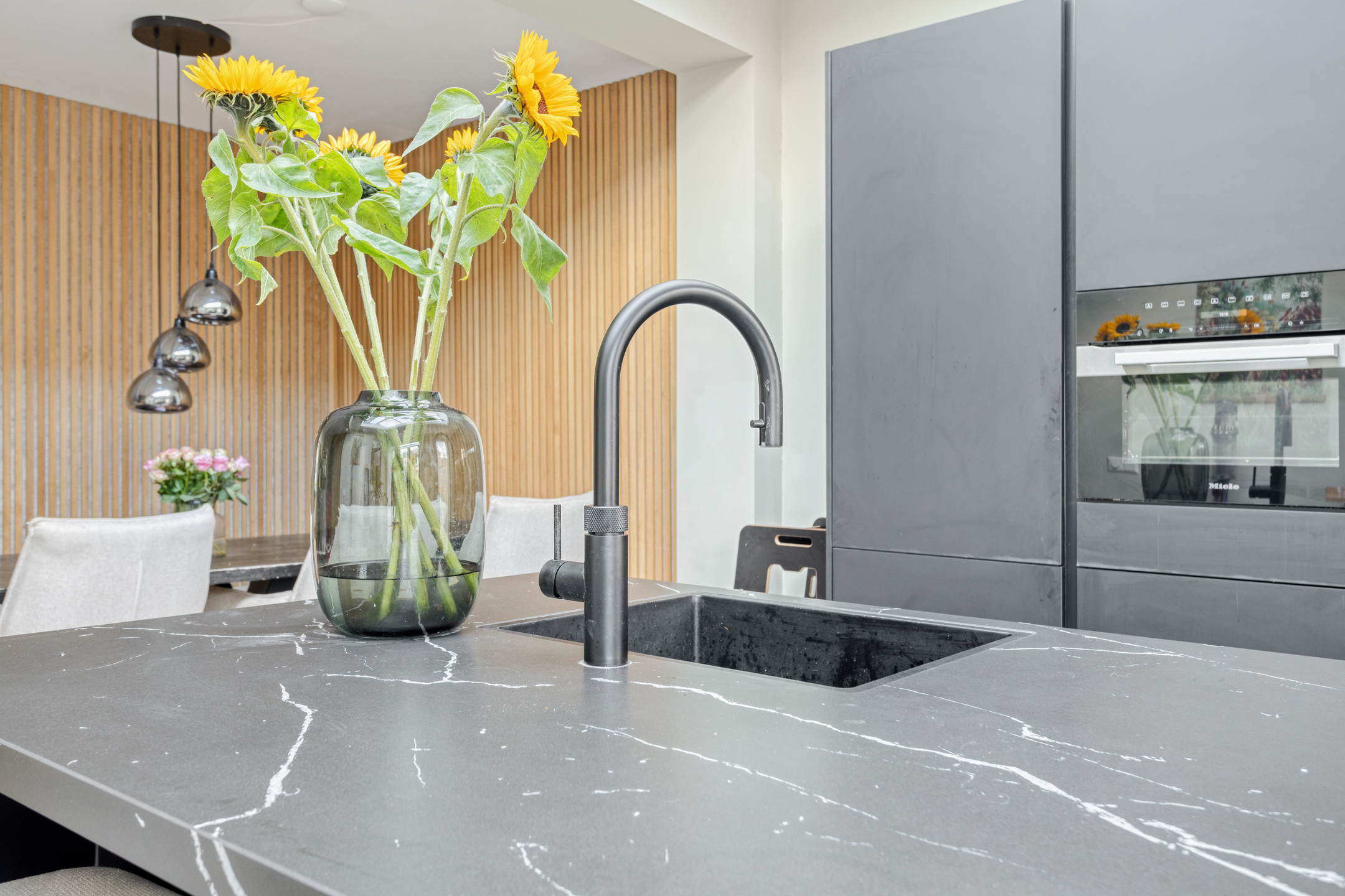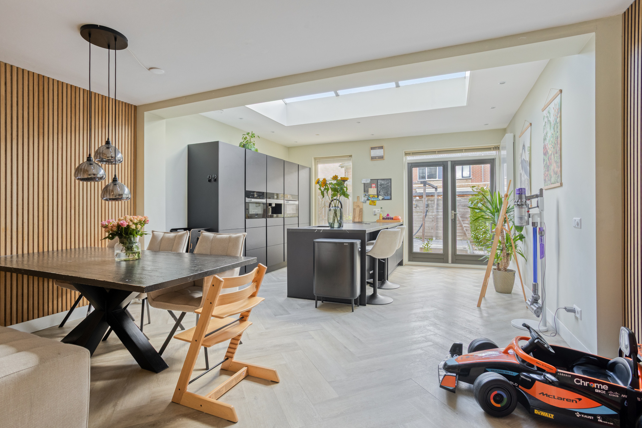 De moderne keuken met kookeiland bevindt zich aan de achterzijde van de woning en is een echte blikvanger. Dankzij de grote lichtkoepel valt er extra veel daglicht binnen, wat zorgt voor een heerlijk lichte en open sfeer. De keuken is bovendien uitgerust met diverse inbouwapparatuur, waaronder een inductiekookplaat met Bora-afzuigsysteem, oven, combi-oven, inbouwkoffiezetapparaat, vriezer, koelkast, vaatwasser en een Quooker.