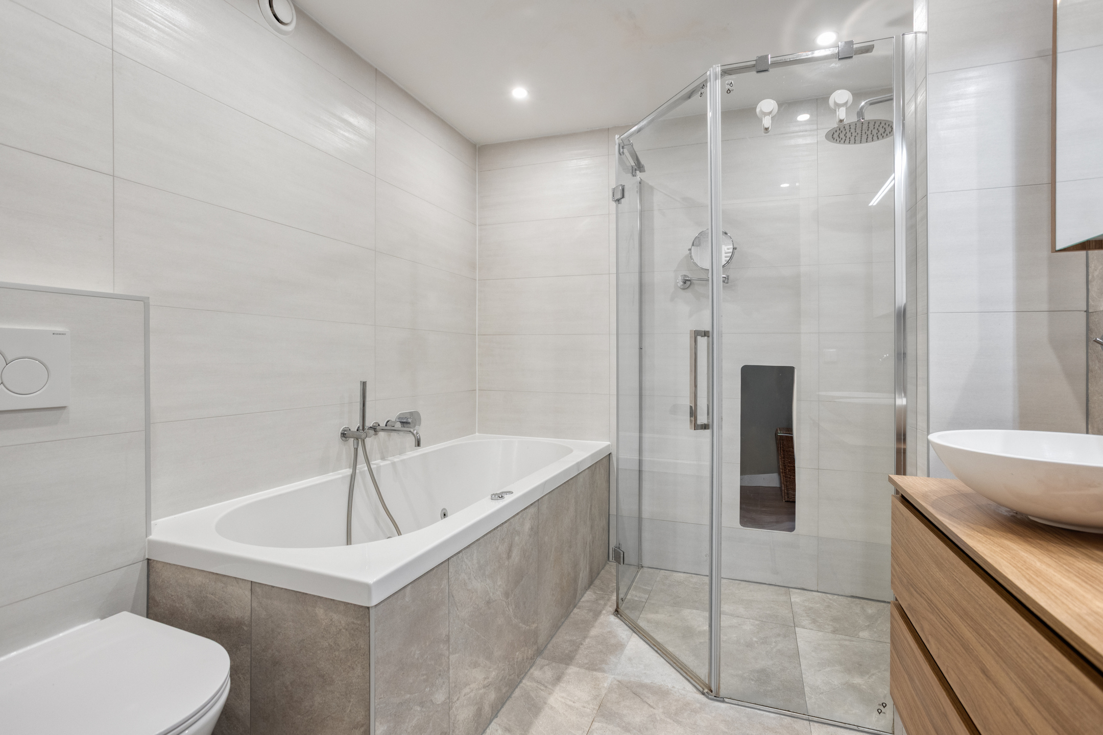 De moderne badkamer is uitgerust met een ligbad, douche, toilet en dubbele wastafel met meubel.