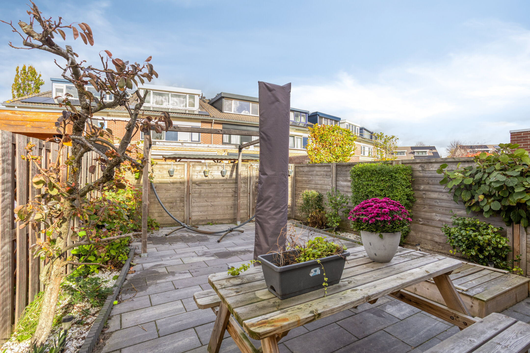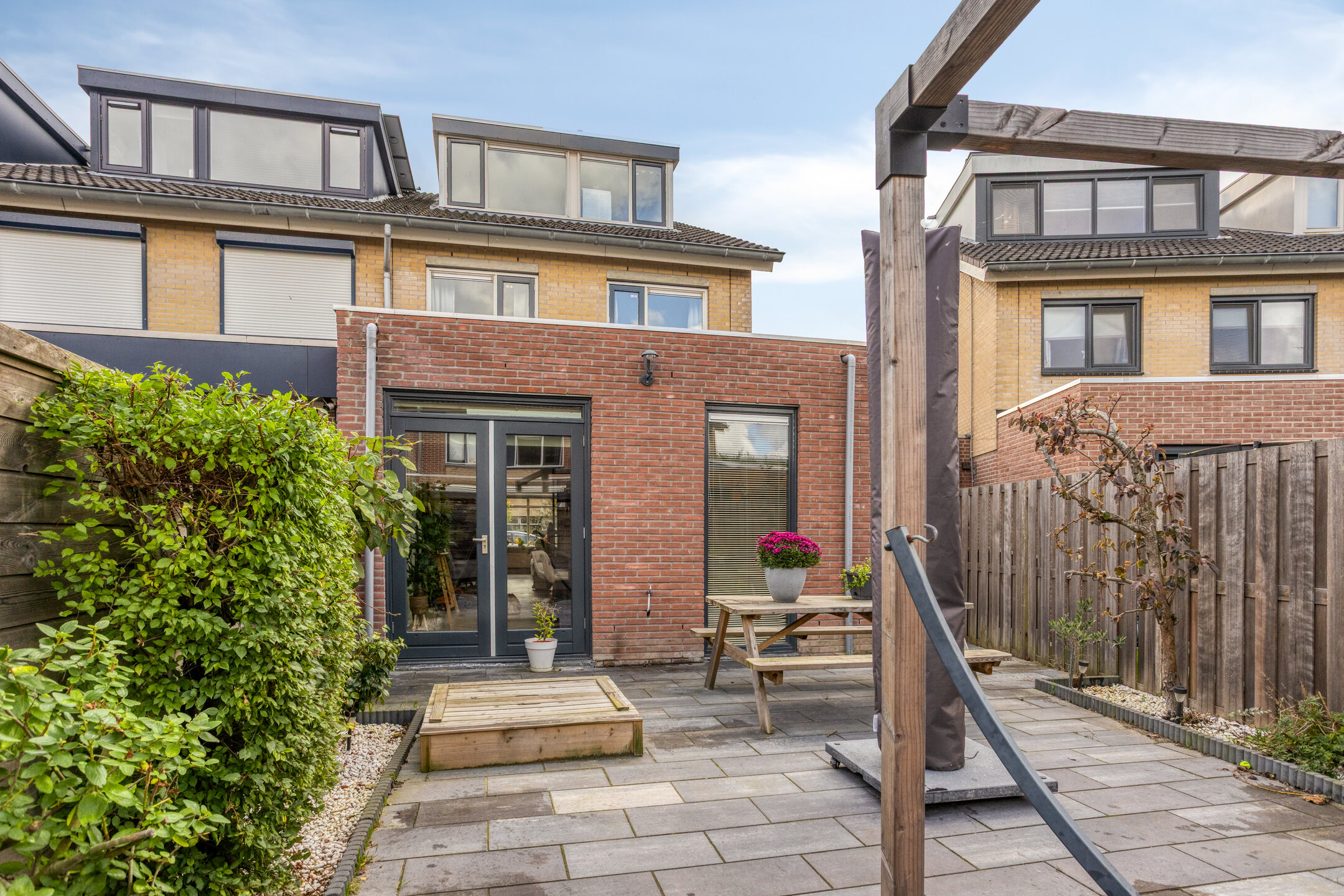 De ruime achtertuin is bereikbaar via openslaande deuren, ligt op het noorden en beschikt over een achterom en een royale berging aan de zijkant van de woning.
