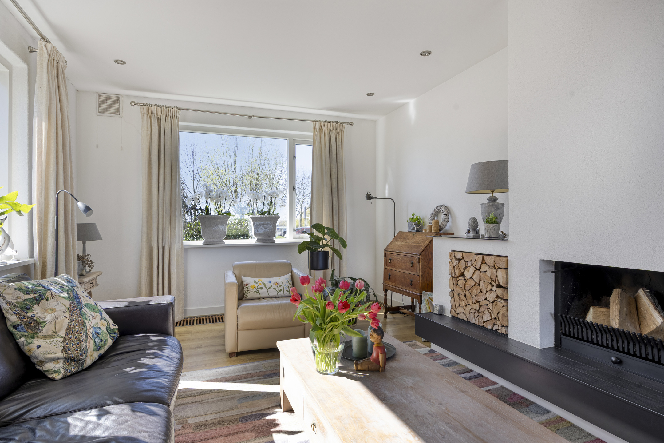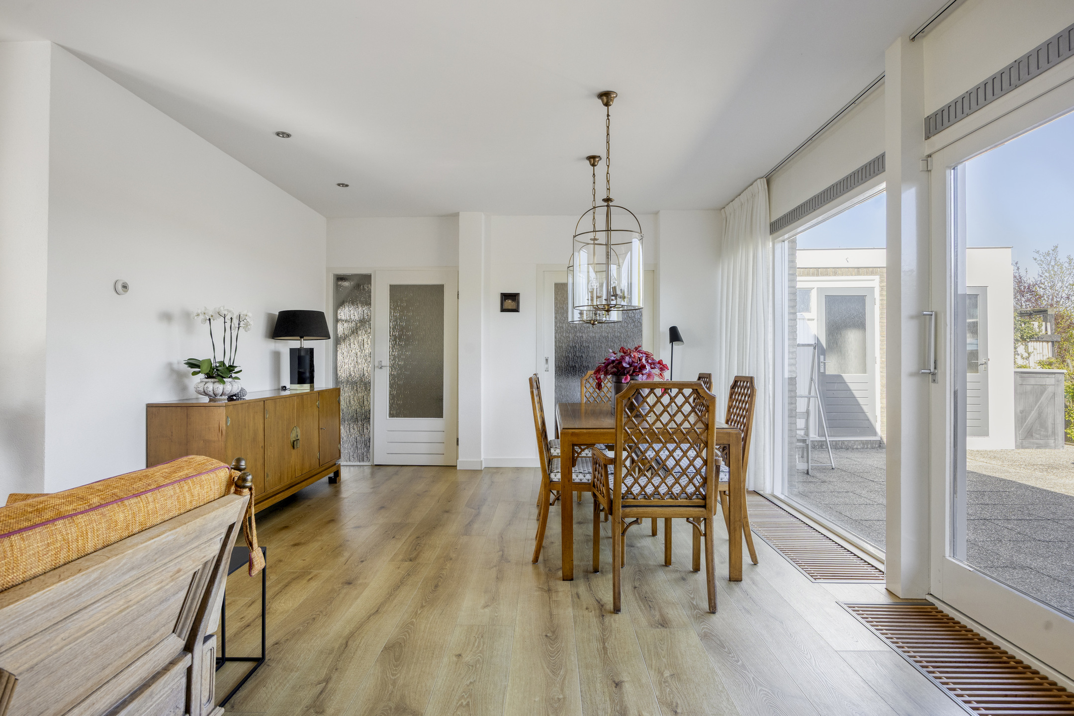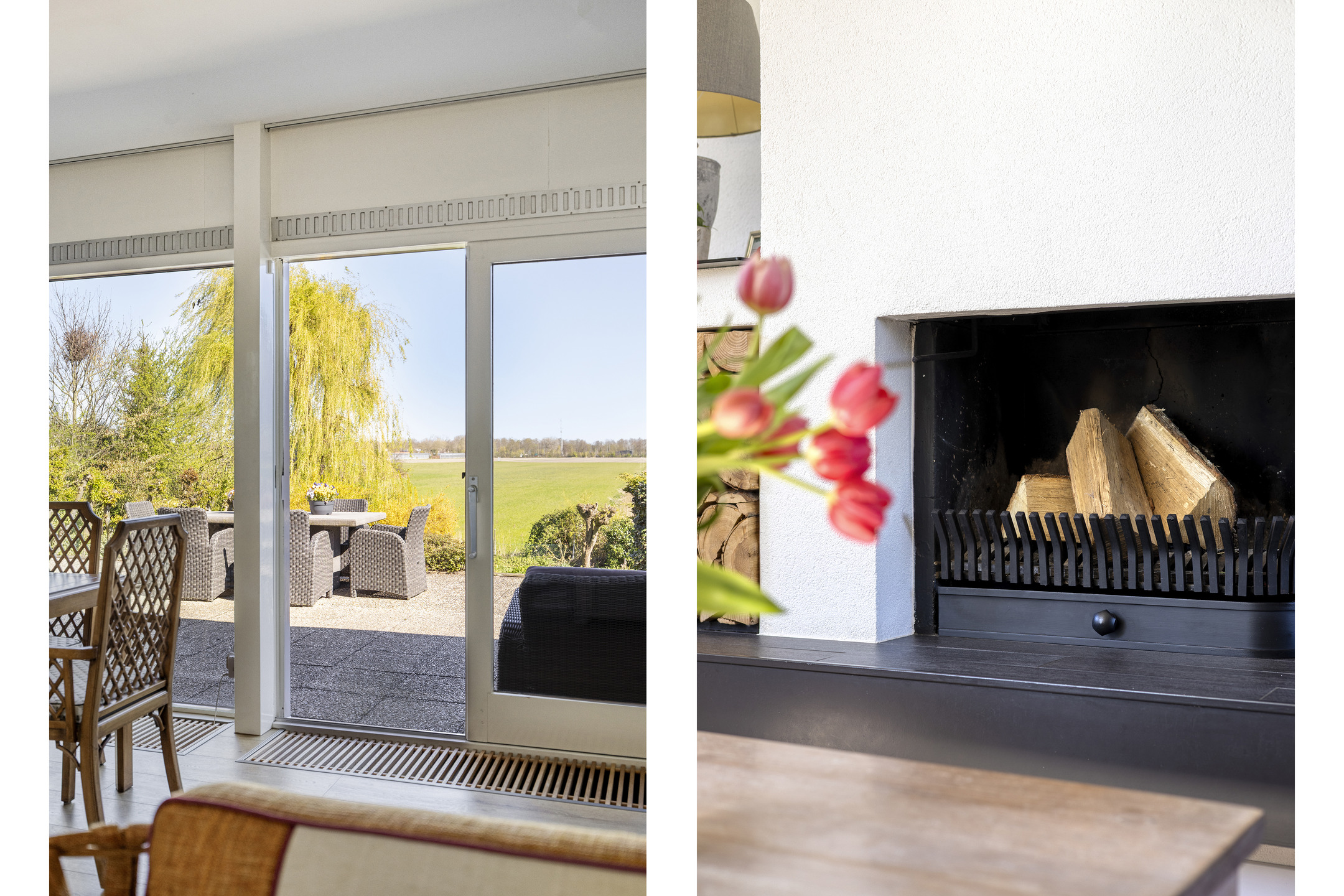 De tuingerichte woonkamer is heerlijk licht dankzij de grote raampartijen en voorzien van een sfeervolle open haard en een nette laminaatvloer. Via de brede schuifpui stap je zo het ruime terras op. Aan comfort is gedacht met een zonnescreen aan de zijkant en een zonnescherm aan de voorzijde.