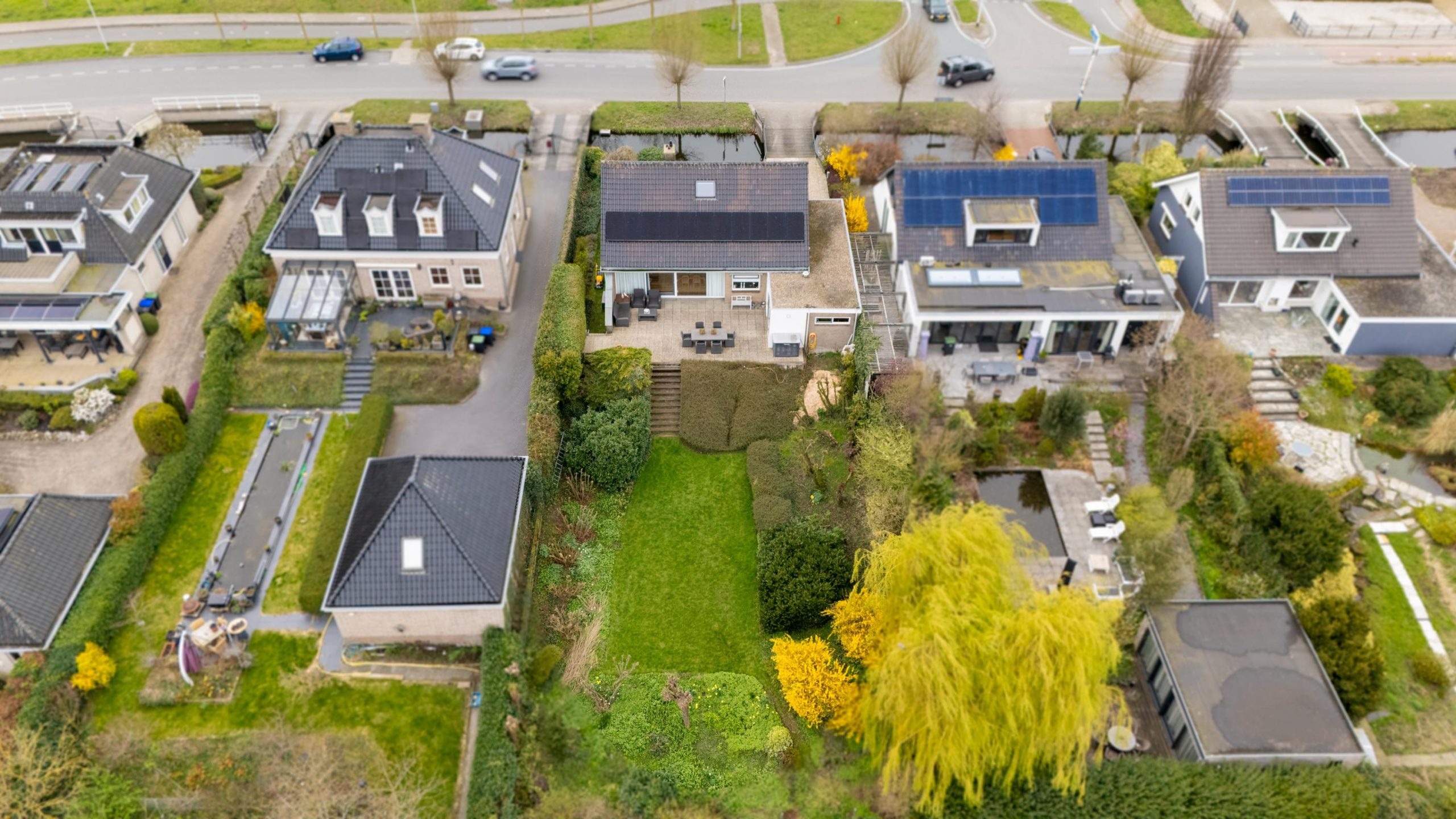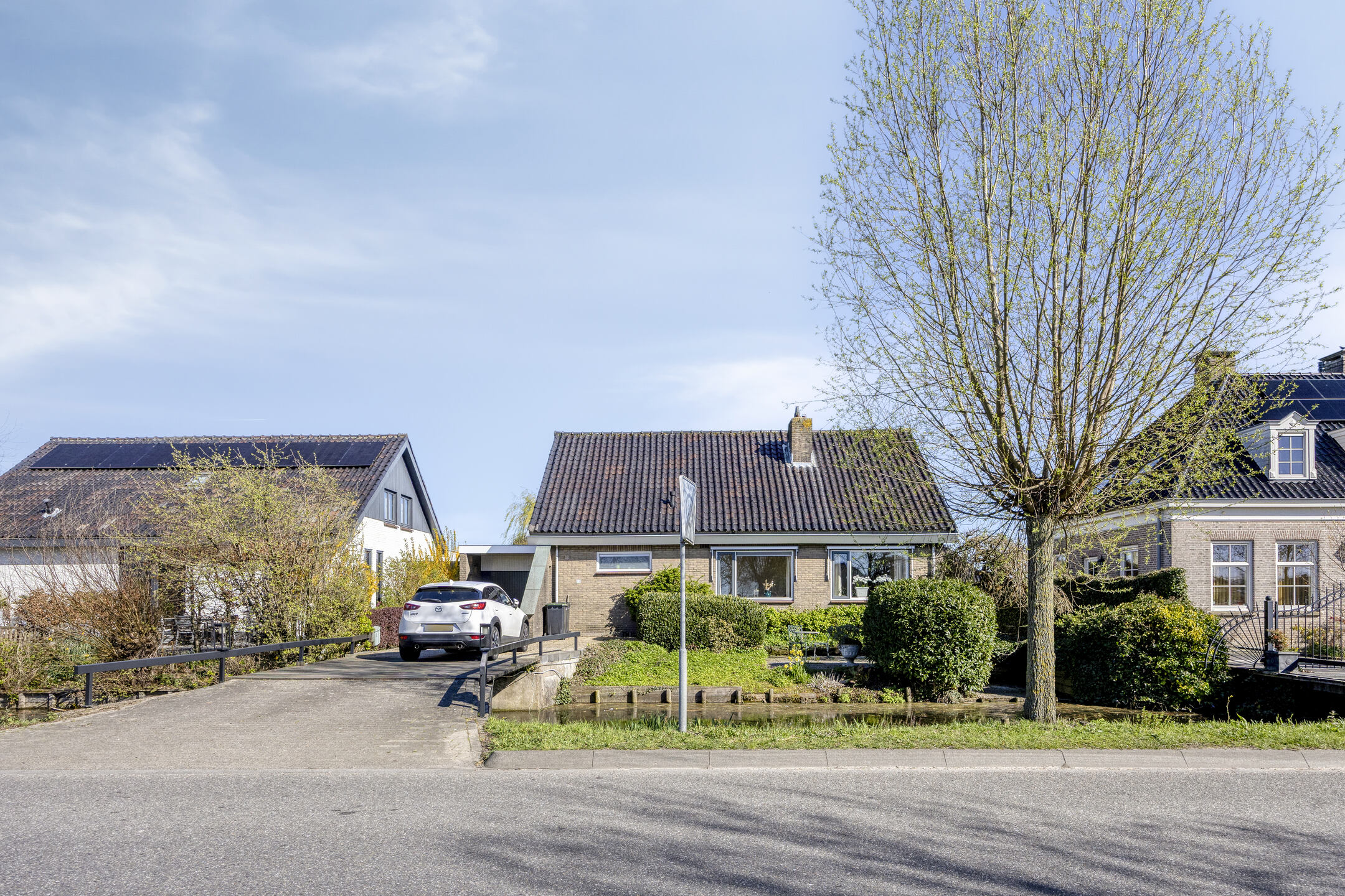 Via het oprijpad over de privébrug bereik je het royale perceel met ruime parkeergelegenheid. Vanuit hier heb je toegang tot zowel de woning als de garage.
