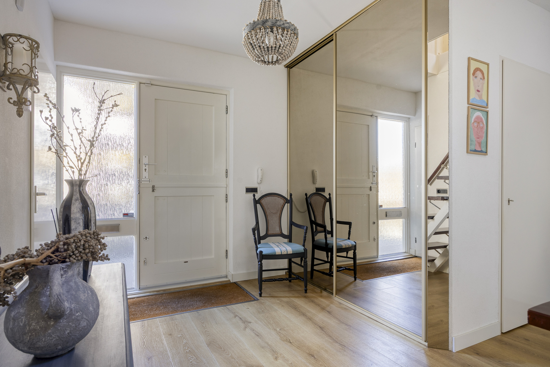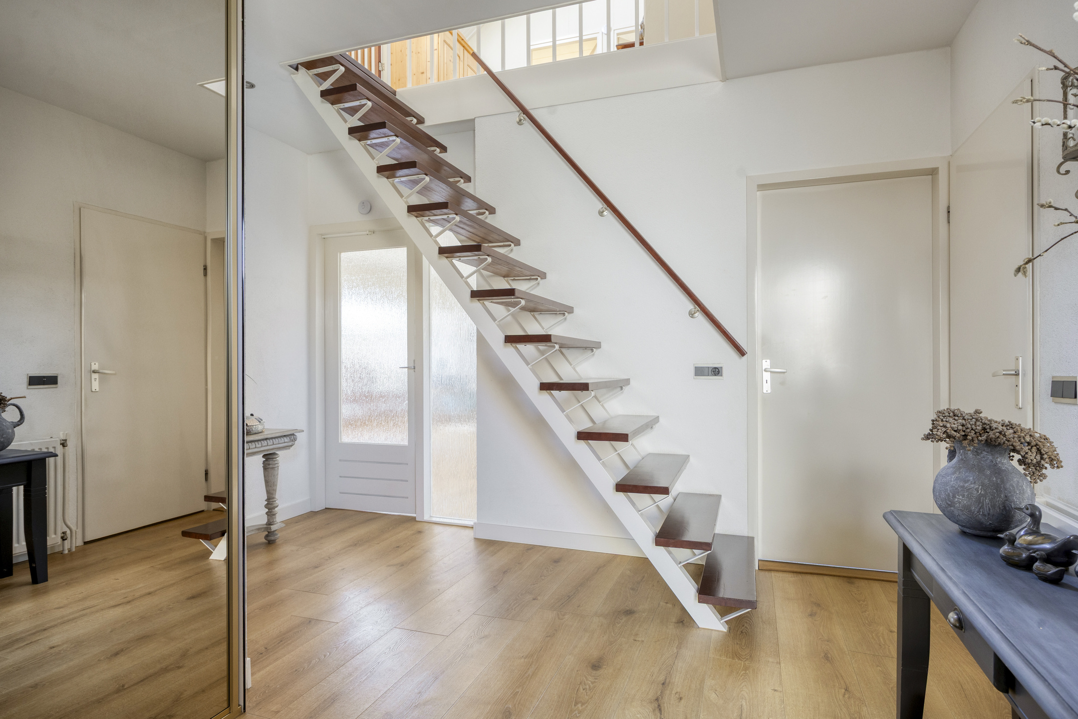 De ruime hal beschikt over een garderobekast (met meterkast), toiletruimte, berging en biedt toegang tot de slaapkamer en badkamer op de begane grond, de woonkamer en de eerste verdieping.