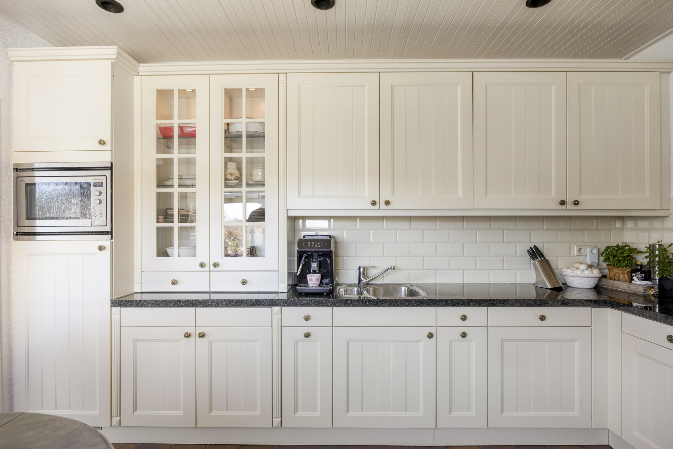De keuken is opgesteld in een praktische L-vorm en uitgerust met diverse inbouwapparatuur, waaronder een inductiekookplaat, afzuigkap, oven, magnetron, vaatwasser en koelkast.