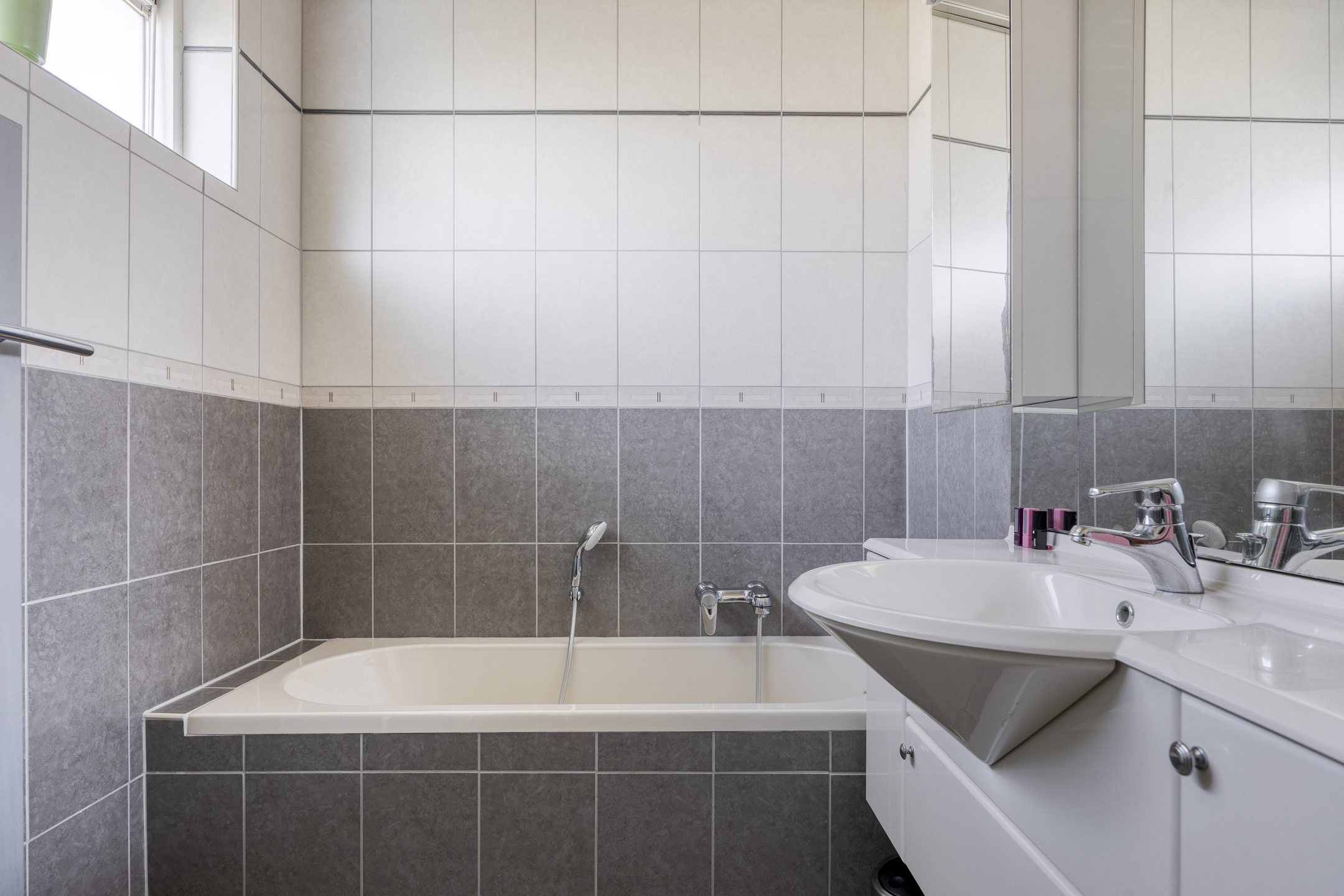 De nette badkamer beschikt over een ligbad, douche, wastafel en handdoekradiator.