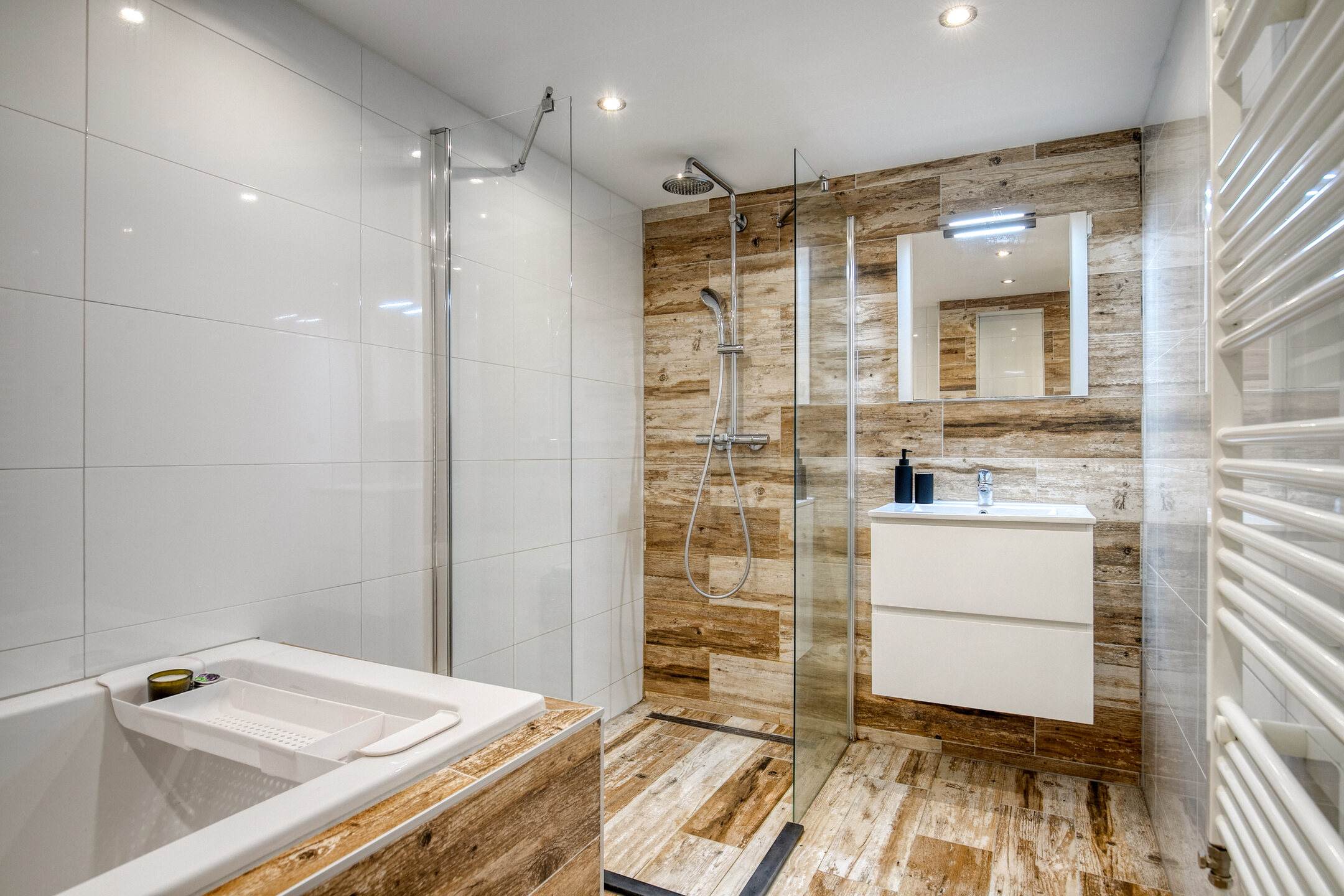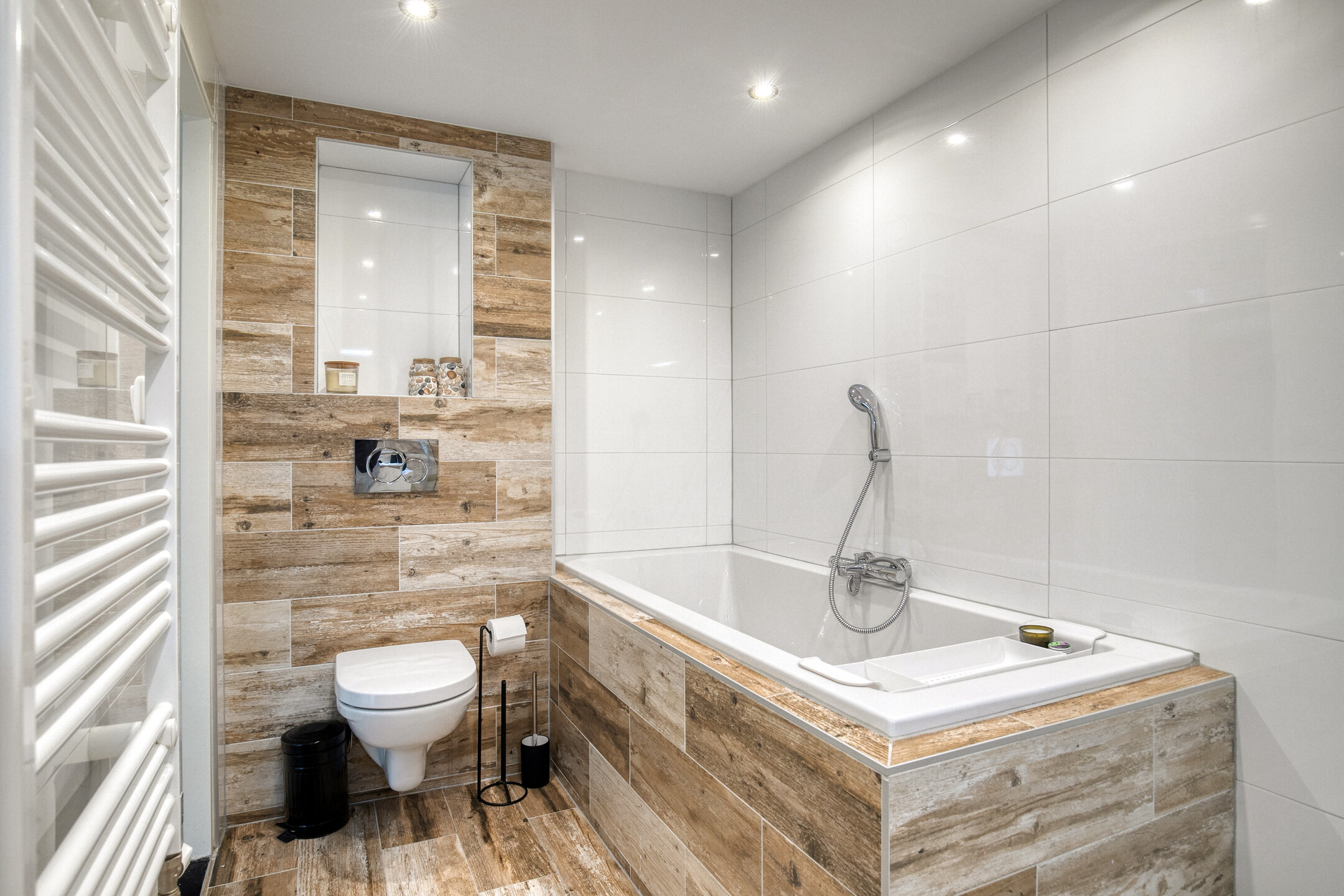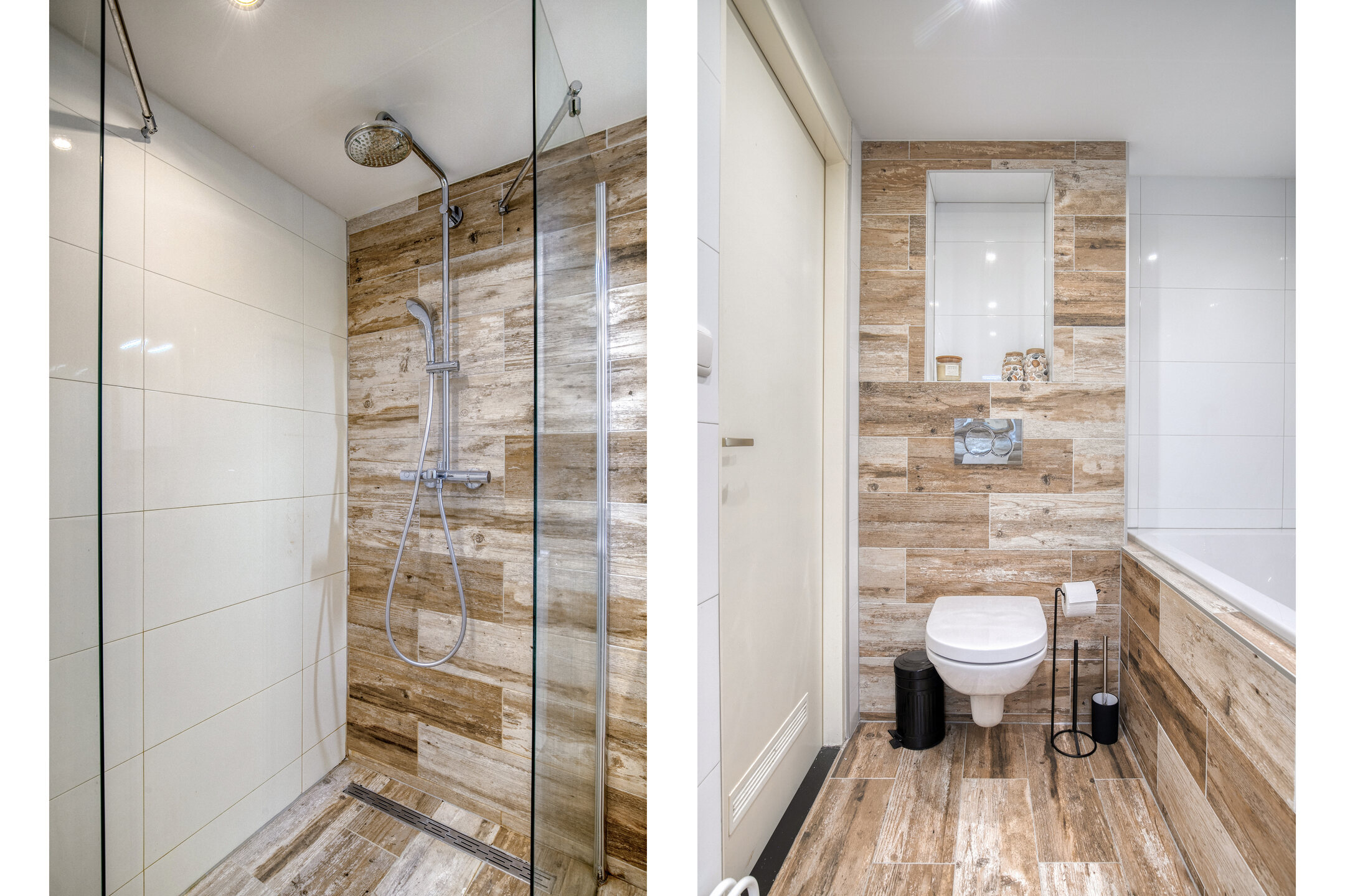 De uitgebouwde badkamer is compleet ingericht met een ligbad, toilet, douche, wastafel met meubel, handdoekradiator en mechanische ventilatie.
