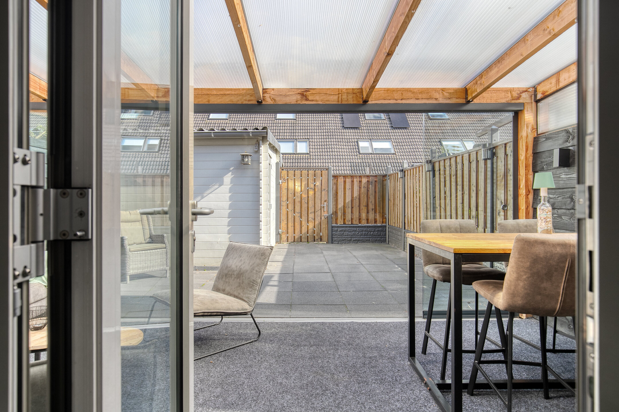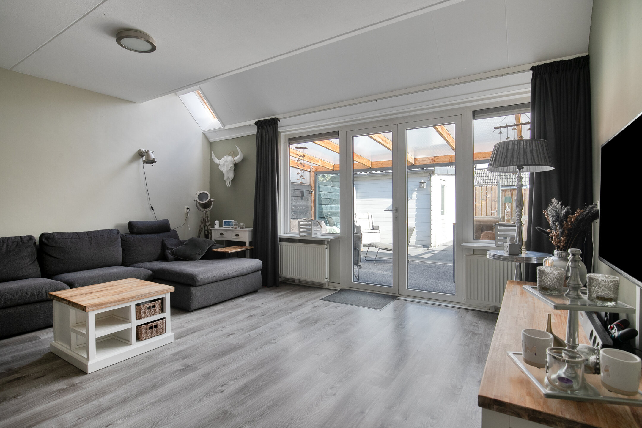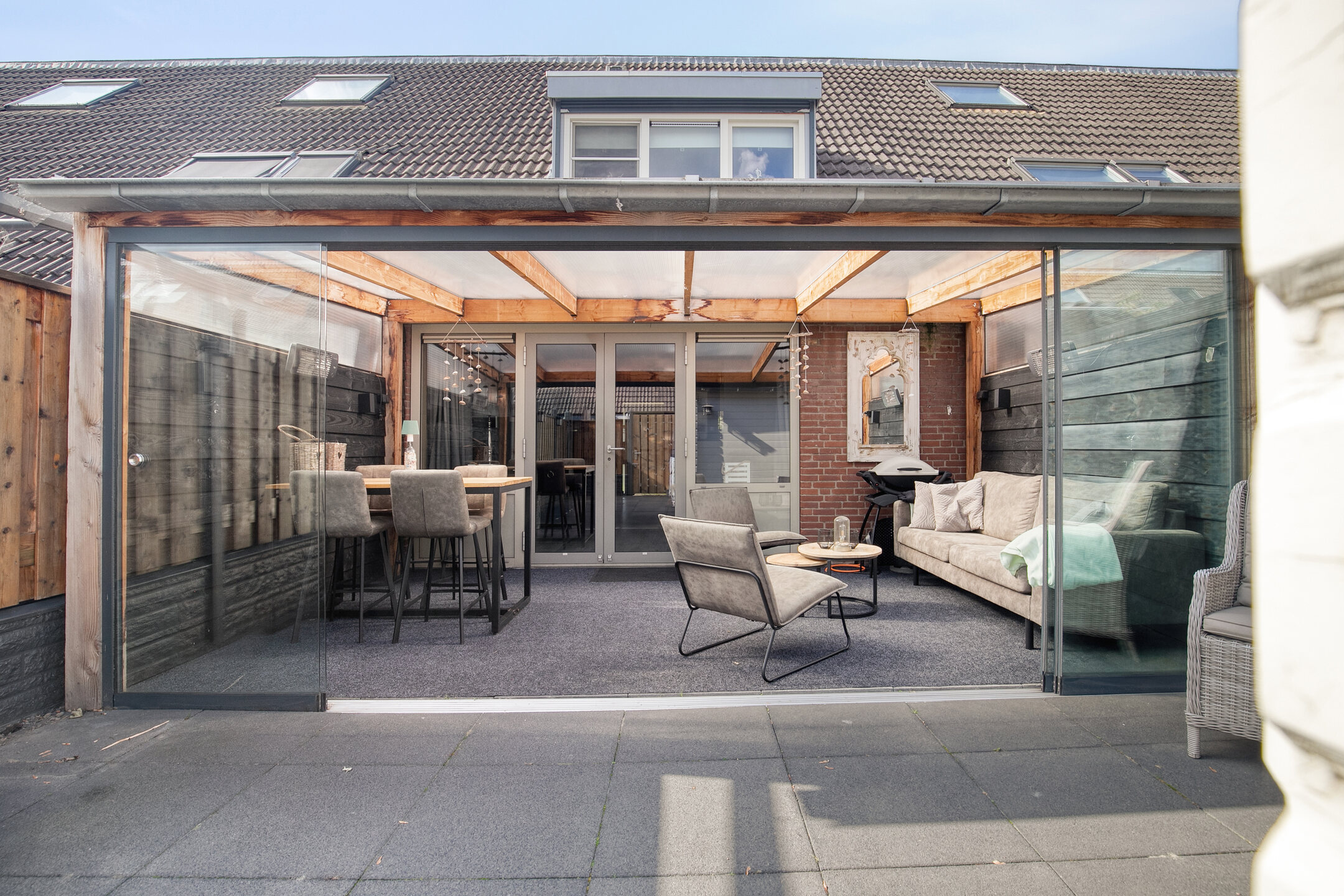 De ruime woonkamer is voorzien van een mooie laminaatvloer en biedt middels openslaande deuren toegang tot de achtertuin. De sfeervolle serre vormt een echte verlenging van de woonkamer en is volledig afsluitbaar met glazen schuifdeuren. De achtertuin is onderhoudsvriendelijk en voorzien van een vrijstaande berging en achterom.