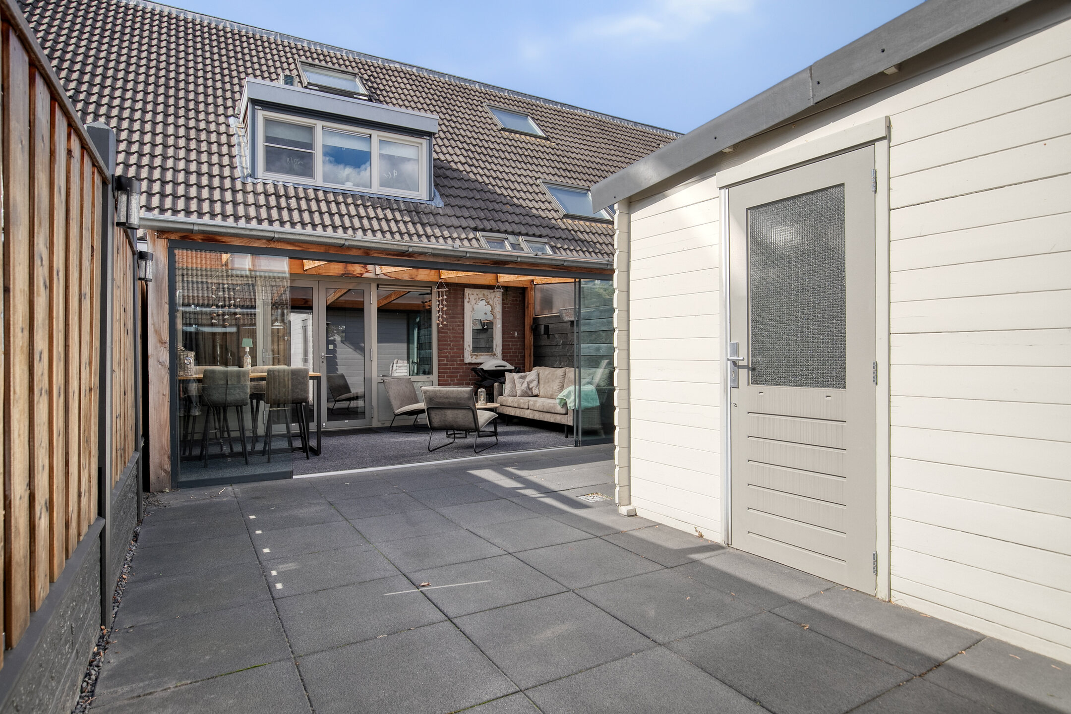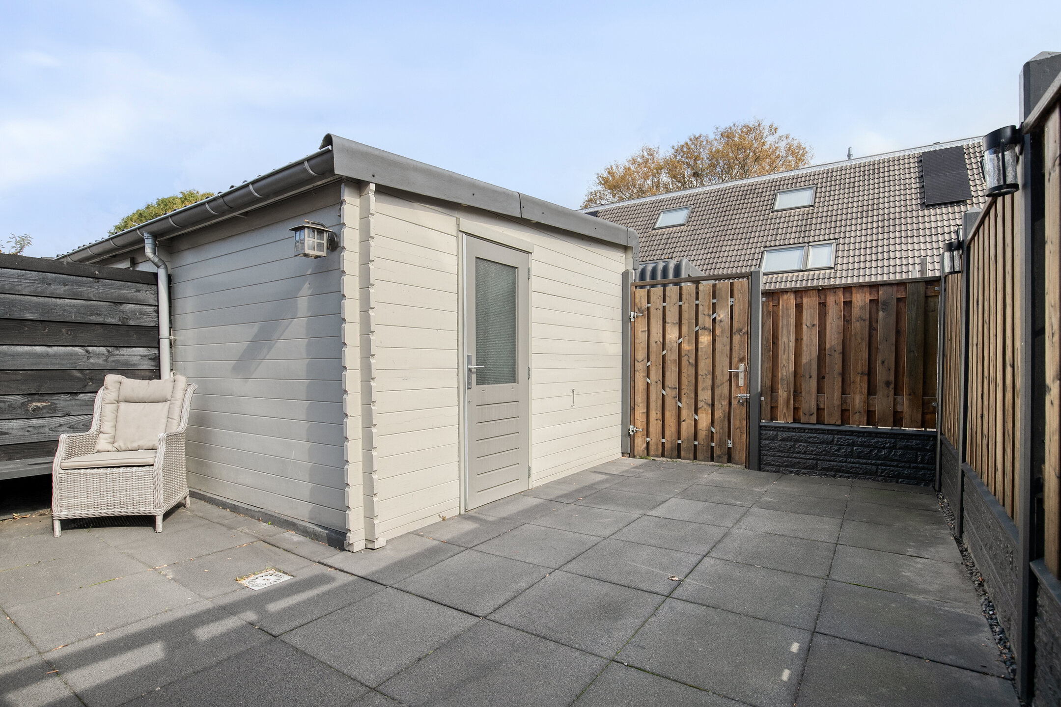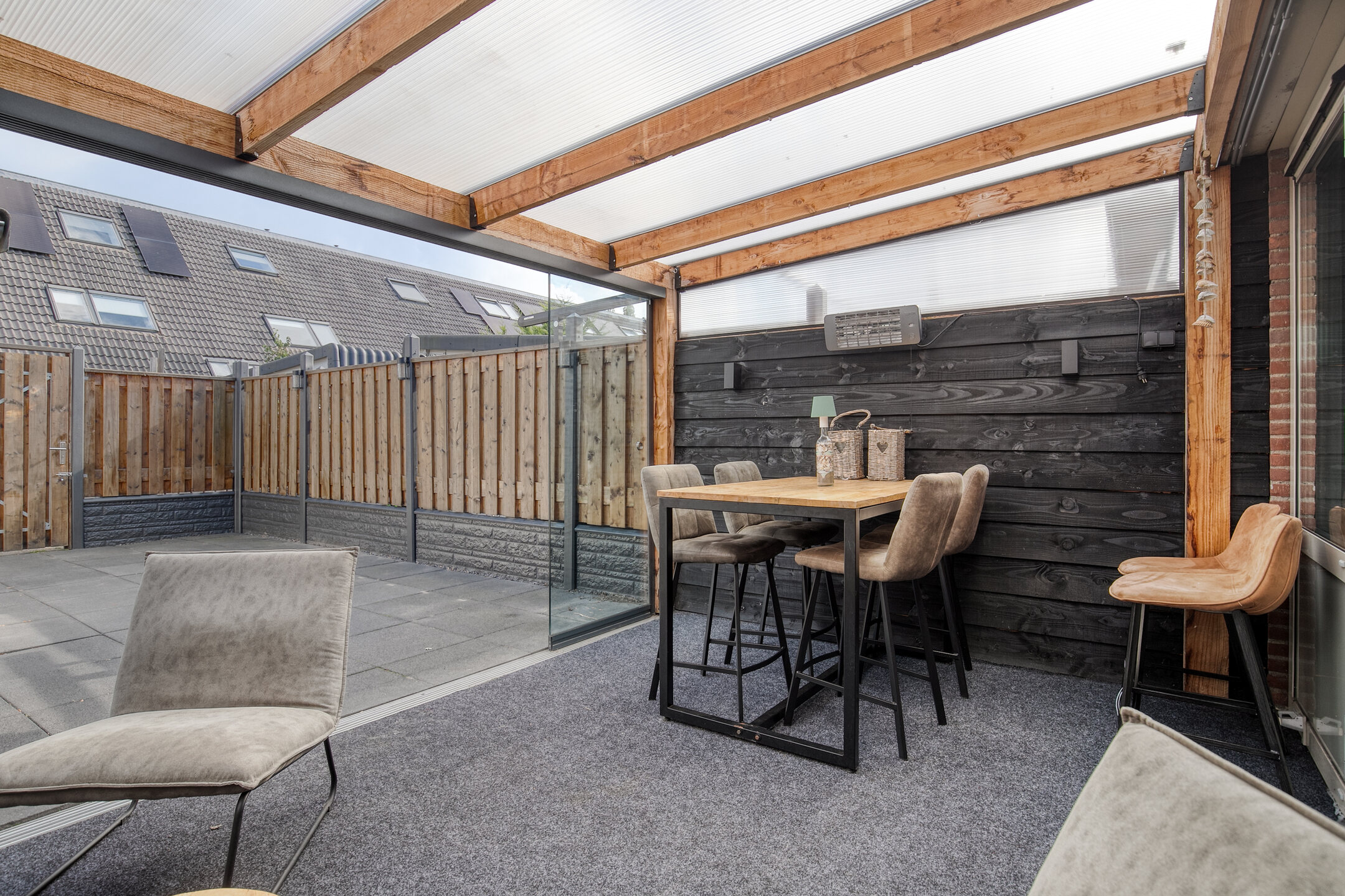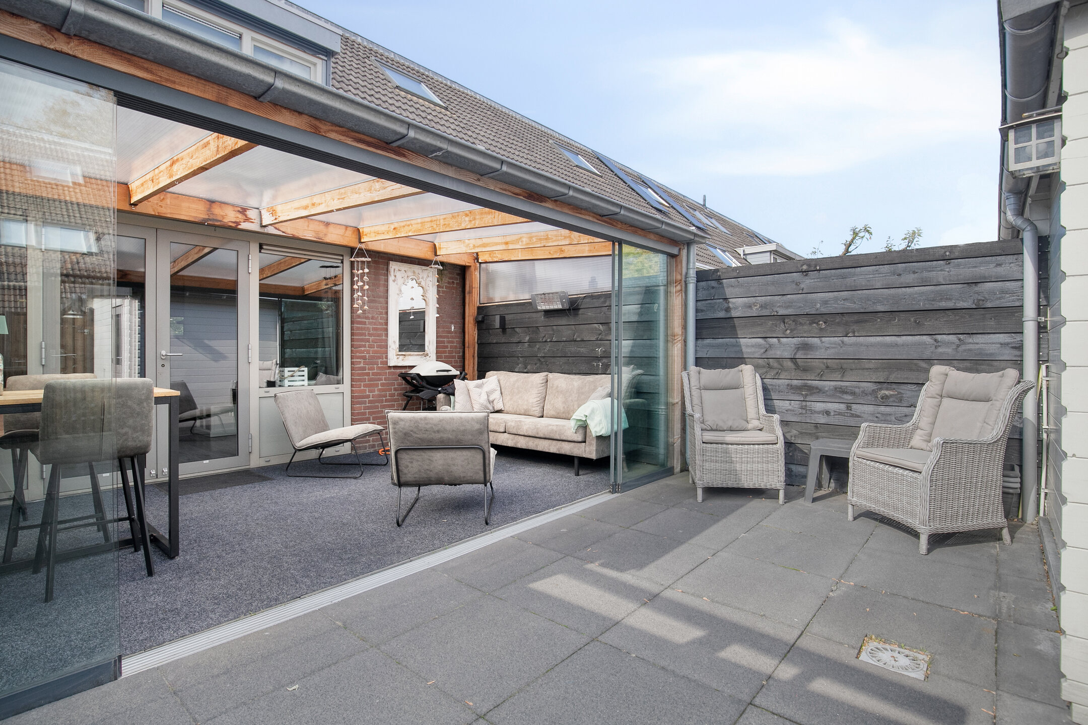 De ruime woonkamer is voorzien van een mooie laminaatvloer en biedt middels openslaande deuren toegang tot de achtertuin. De sfeervolle serre vormt een echte verlenging van de woonkamer en is volledig afsluitbaar met glazen schuifdeuren. De achtertuin is onderhoudsvriendelijk en voorzien van een vrijstaande berging en achterom.