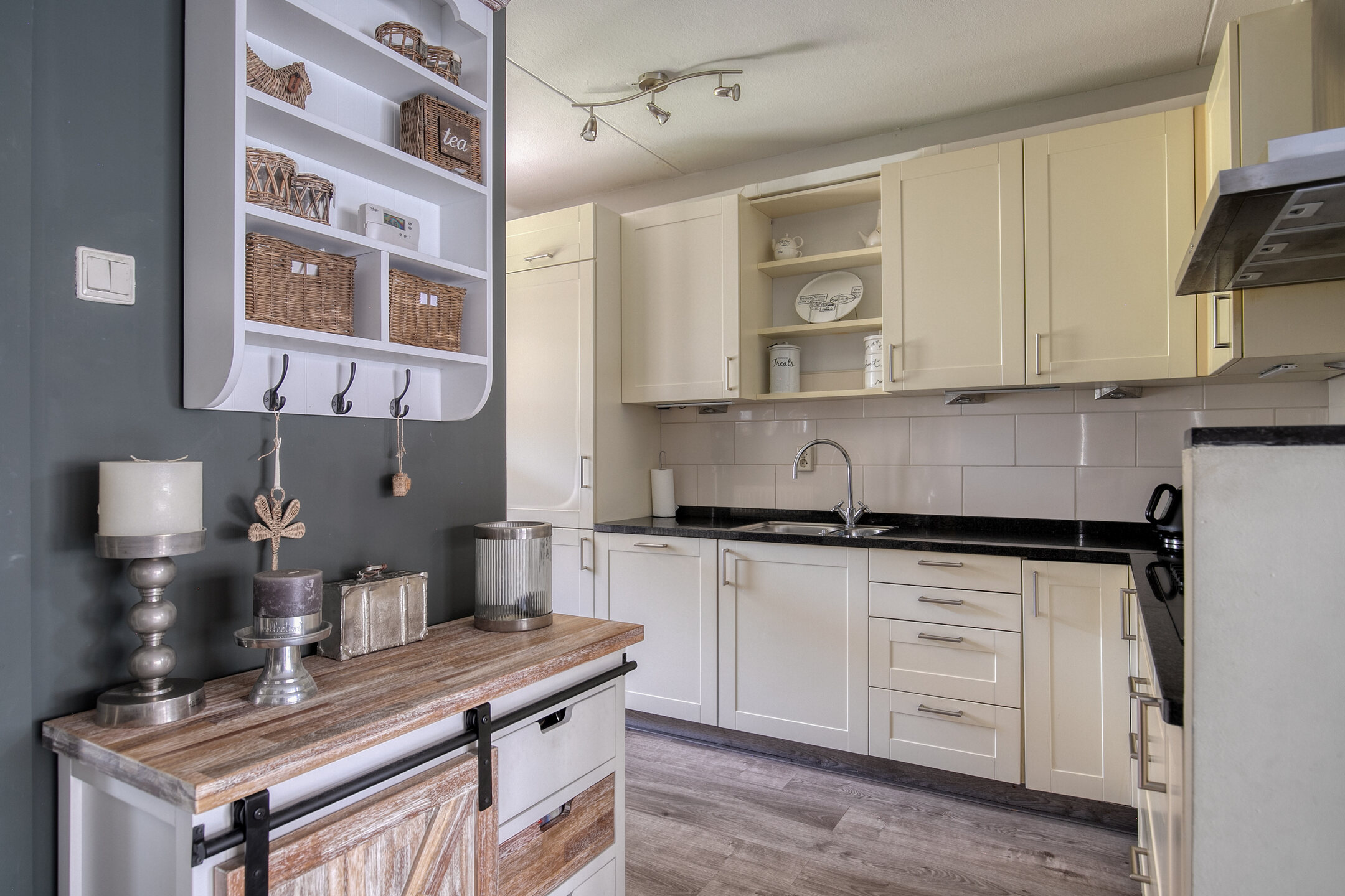 Aan de voorzijde bevindt zich de keuken, uitgerust met een gasfornuis, afzuigkap, vaatwasser, combimagnetron, koel-vriescombinatie en heteluchtoven.
