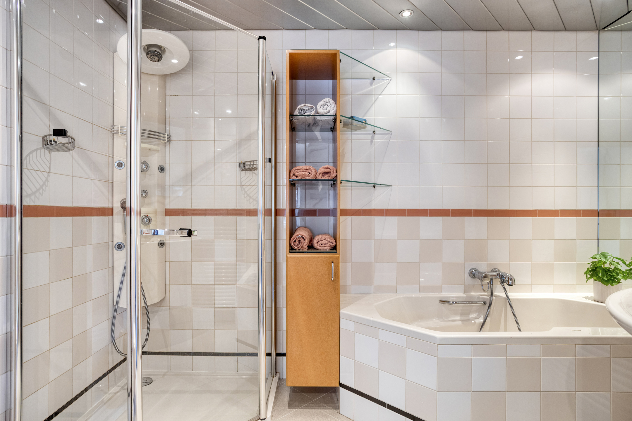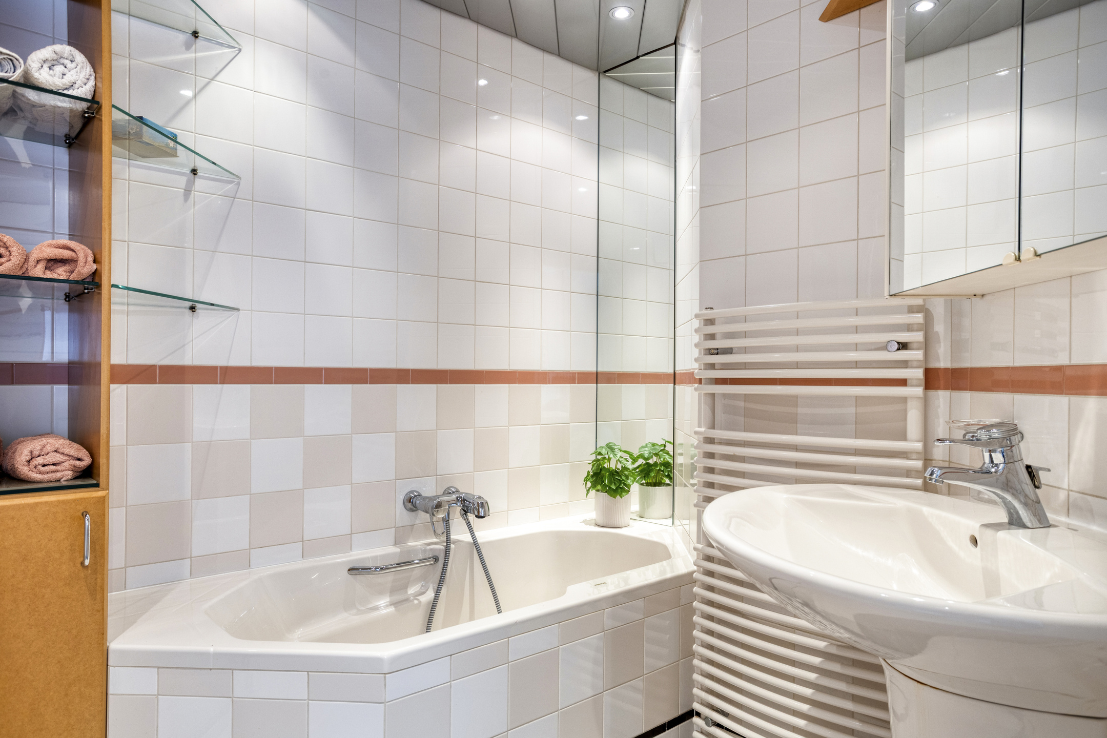 De badkamer is compleet uitgevoerd met ligbad, douche, wastafel, toilet, mechanische ventilatie en comfortabele vloerverwarming.