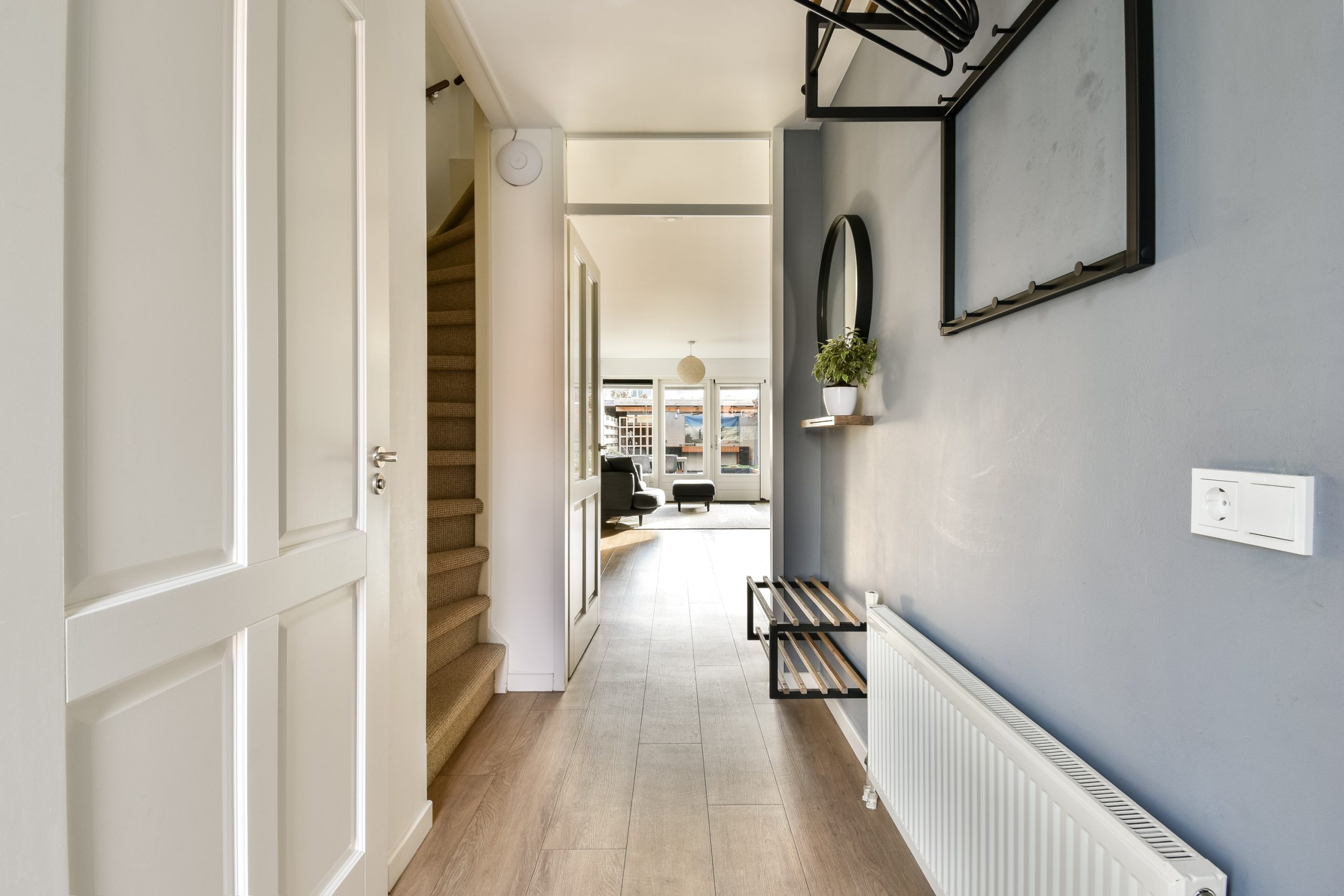 Entree, hal met meterkast, modern toilet, trapopgang naar de eerste verdieping en toegang tot de woonkamer.