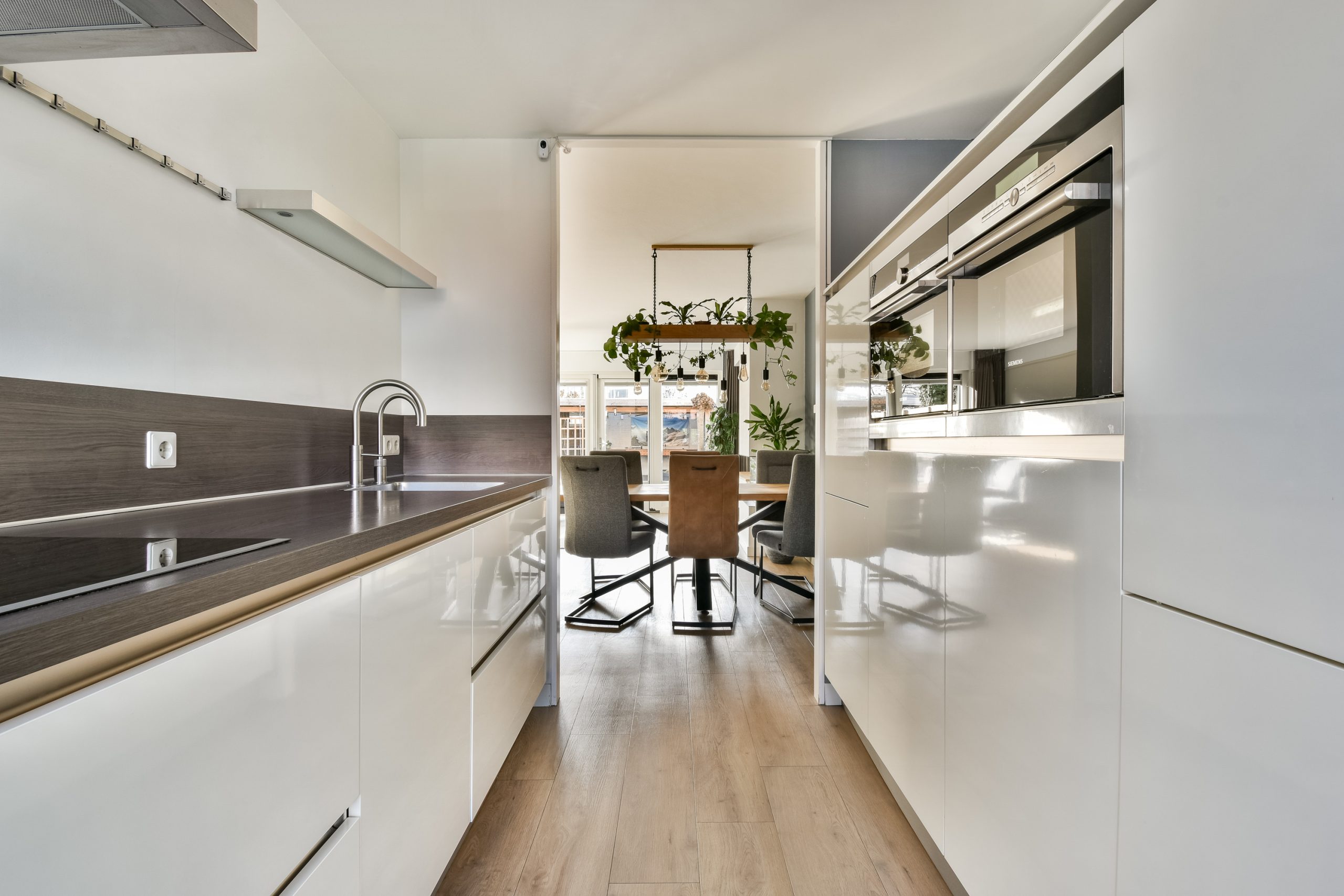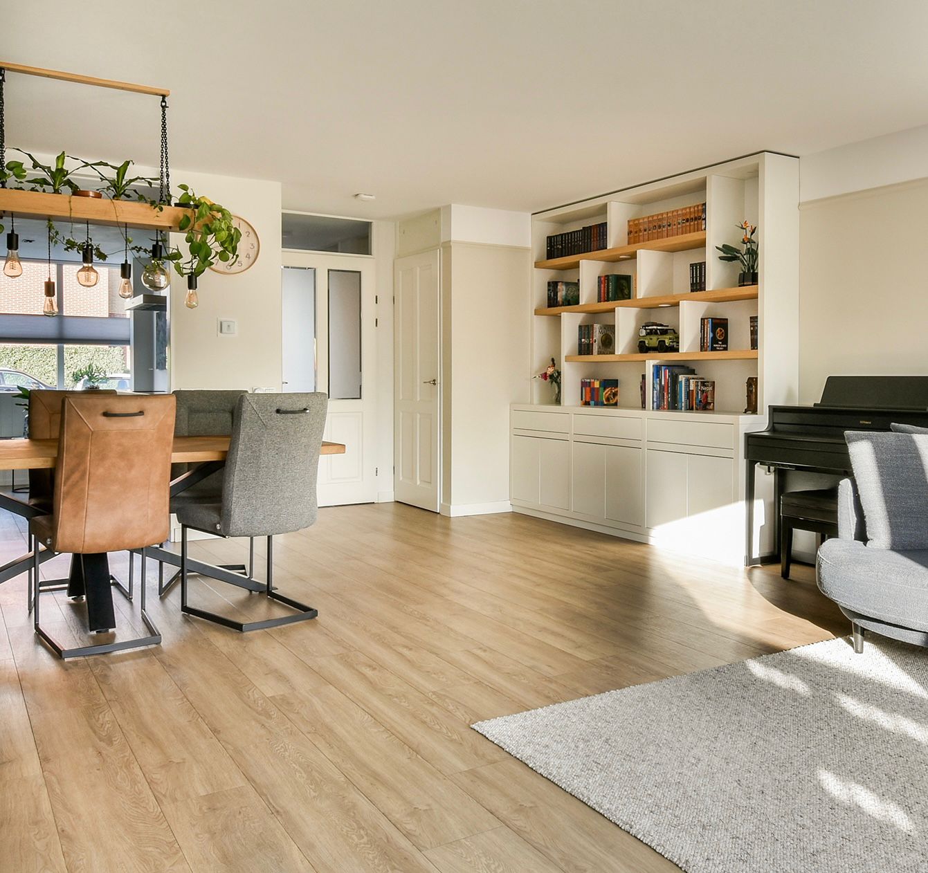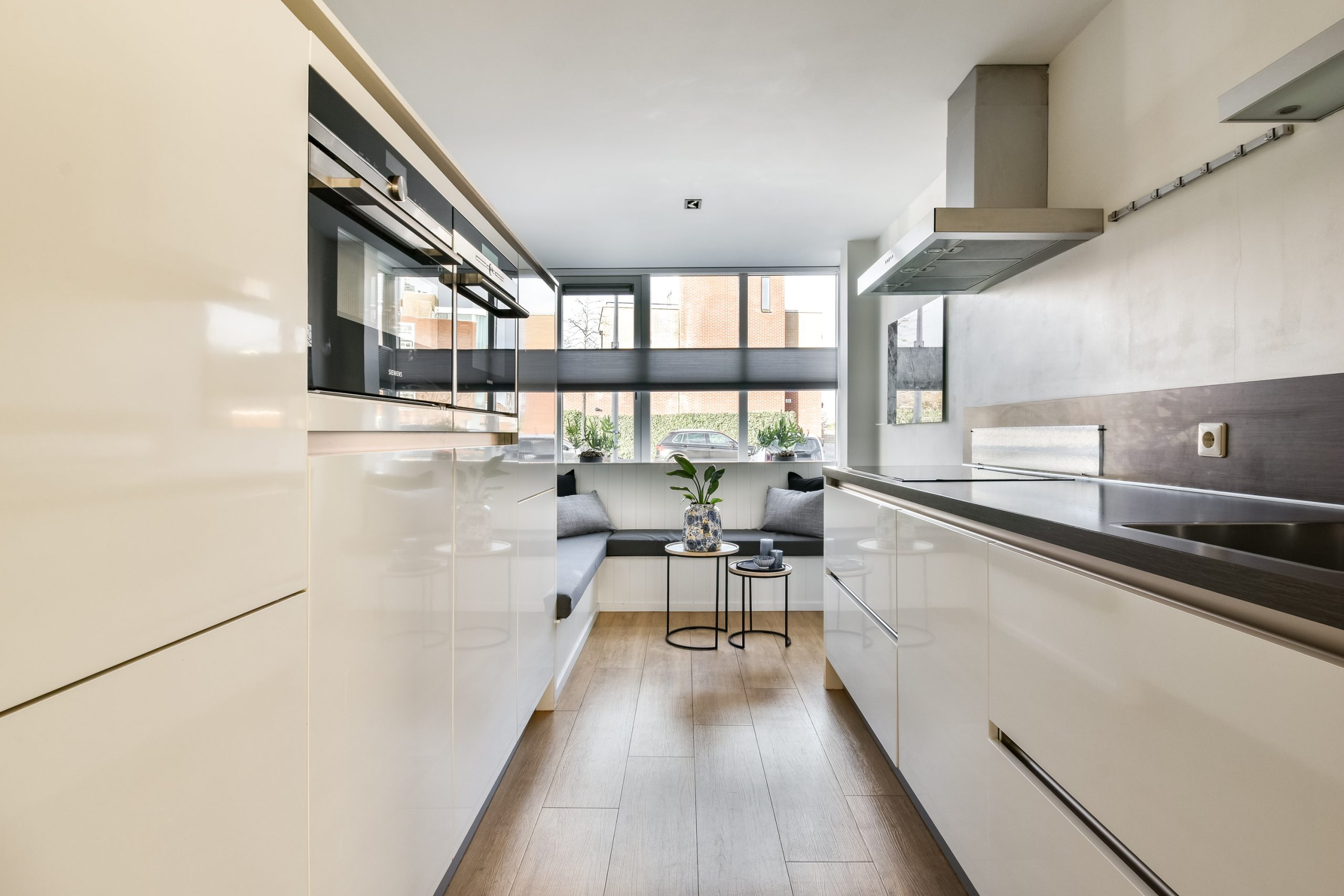 Aan de voorzijde ligt de nette open keuken met een ingebouwd zitje bij de erker. Een heerlijke plek om de dag te beginnen. De keuken is praktisch ingedeeld, goed onderhouden en compleet uitgerust met een inductiekookplaat, afzuigkap, vaatwasser, combi-oven, stoomoven, koelkast met vriesvak en een Quooker kraan inclusief boiler. Een verzorgde keuken waar functionaliteit en gezelligheid perfect samenkomen.