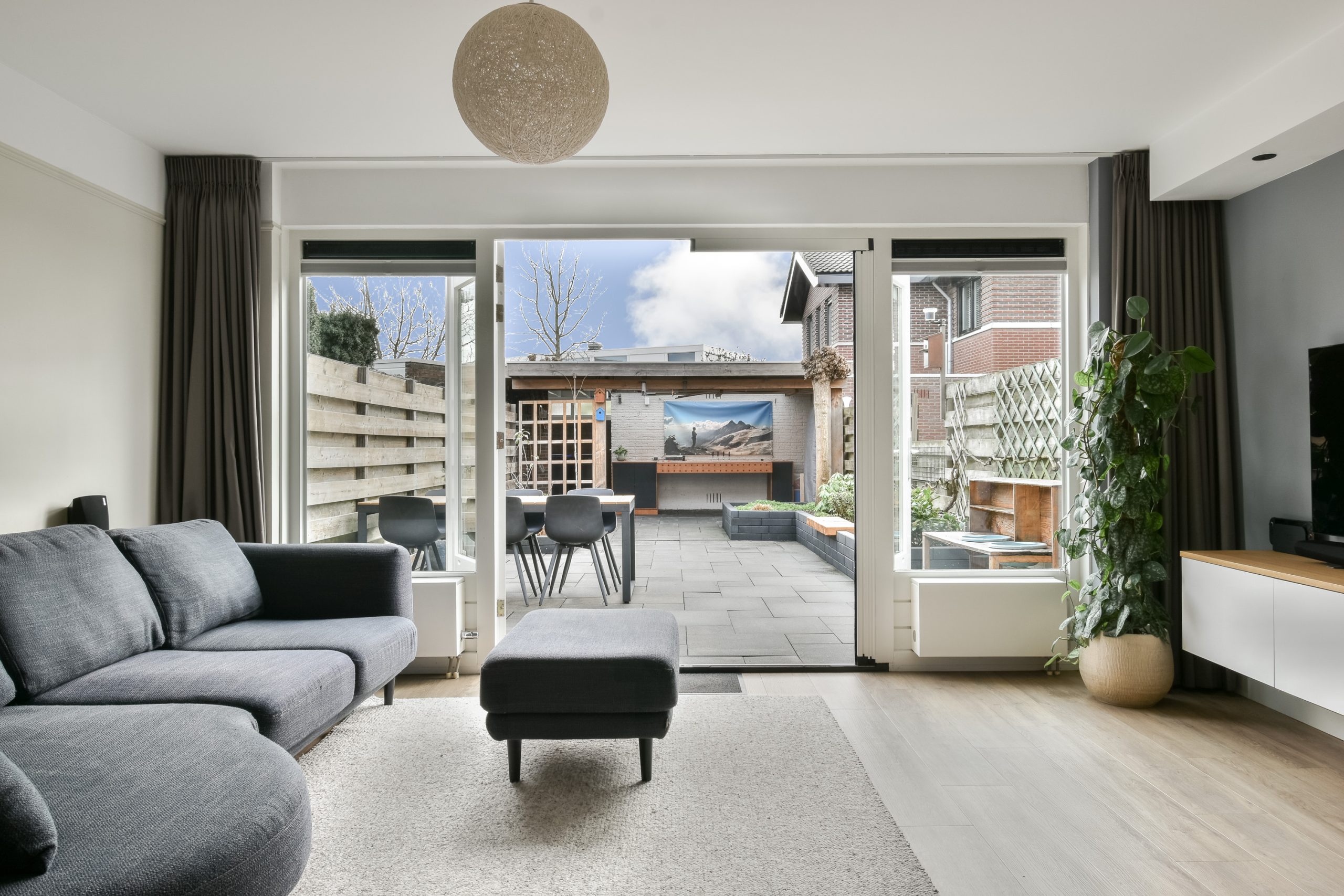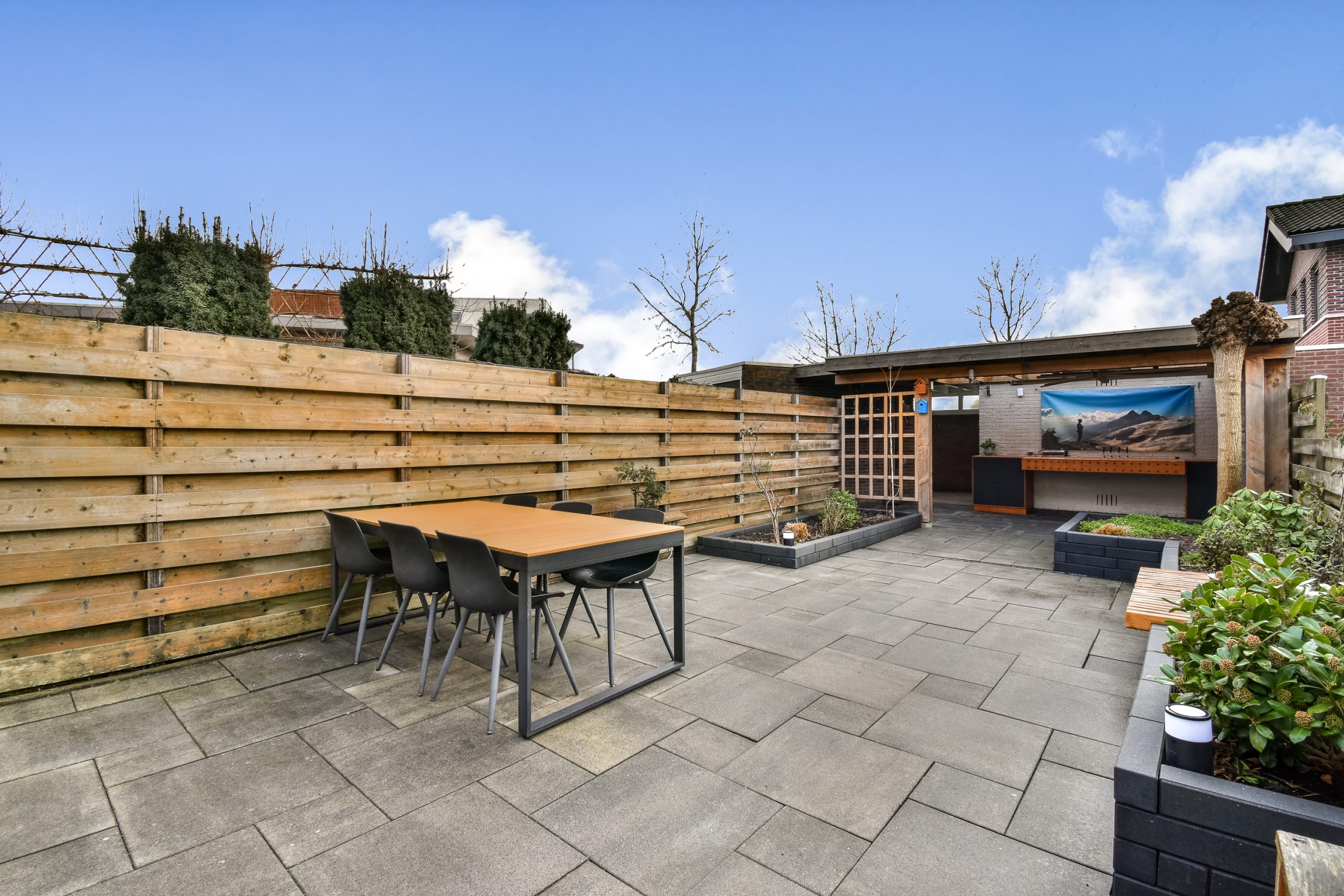 Via openslaande deuren, voorzien van een plissé hor, bereik je de achtertuin op het zuidoosten. Ook is er een zonnescherm aanwezig voor extra comfort op zonnige dagen. De achtertuin is met een diepte van 14 meter uitzonderlijk ruim en biedt volop mogelijkheden. Je vindt hier een extra grote overkapping, een schuur, extra ruimte naast de schuur én een eigen achterom met extra brede doorgang, waarbij zowel de deur als het zijpaneel geopend kunnen worden. Ideaal voor het stallen van bijvoorbeeld een scooter, motor, bakfiets of het eenvoudig binnenrijden van een aanhangwagentje. De tuin is onderhoudsvriendelijk aangelegd en biedt veel privacy.