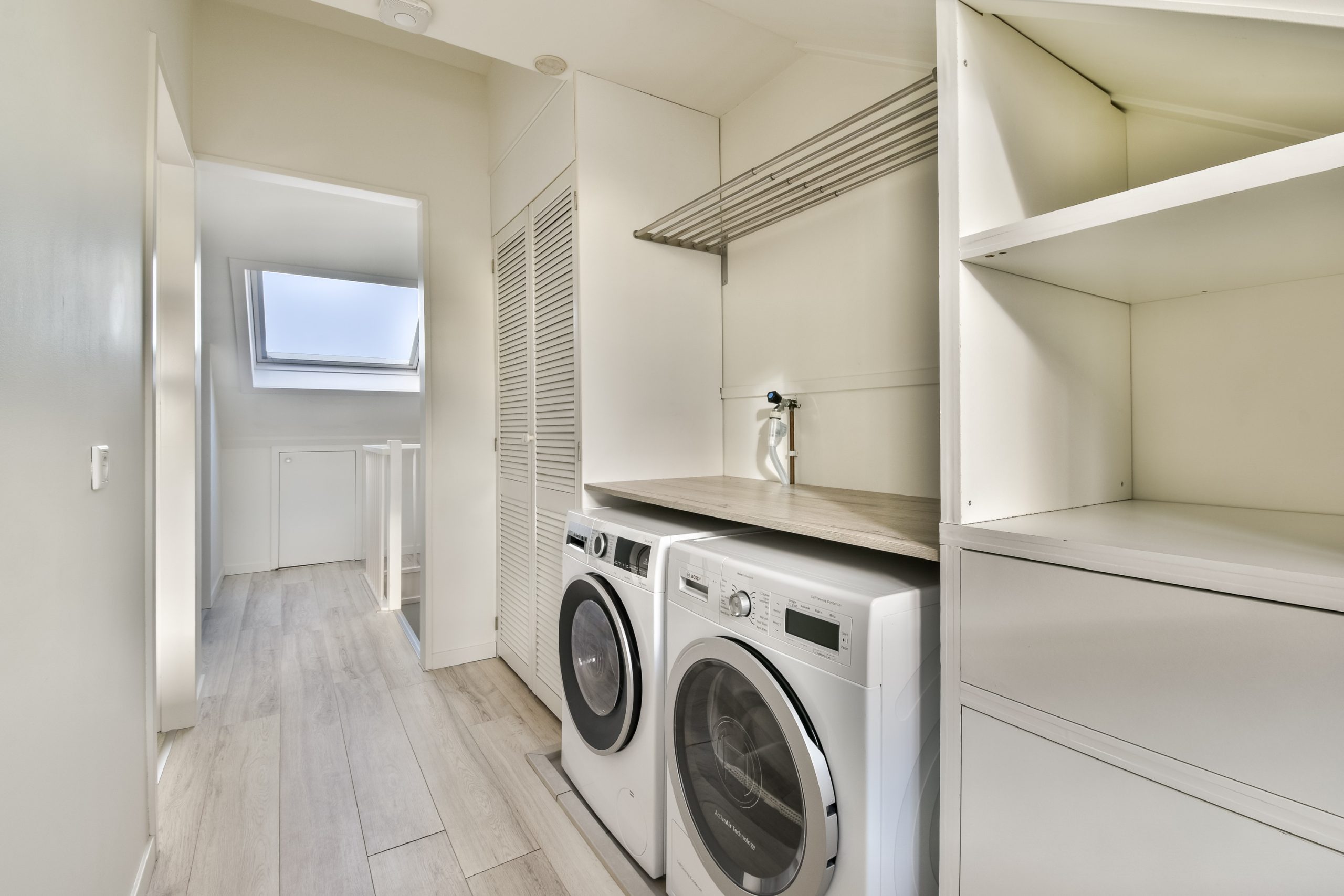 Op de overloop zijn de aansluitingen voor de wasmachine en droger netjes weggewerkt in een op maat gemaakte inbouwkast. Ook de cv-ketel is fraai weggewerkt in een kast met louvredeuren. Daarnaast is er volop praktische bergruimte aanwezig.