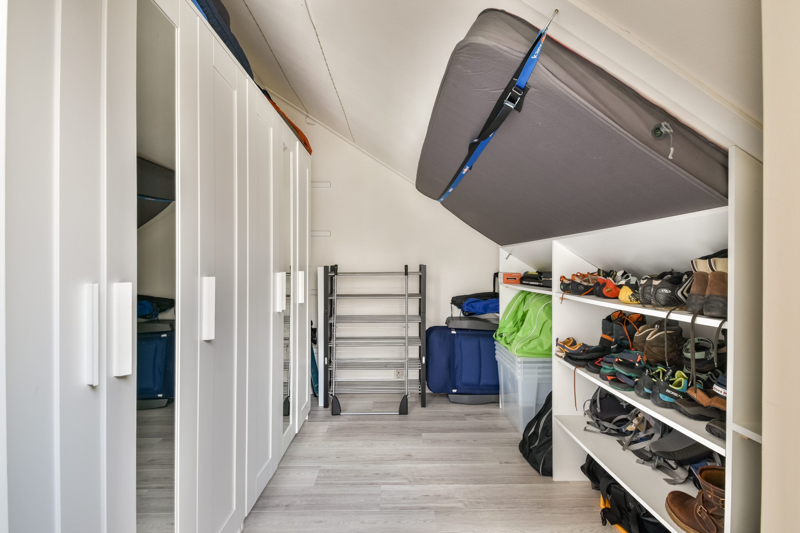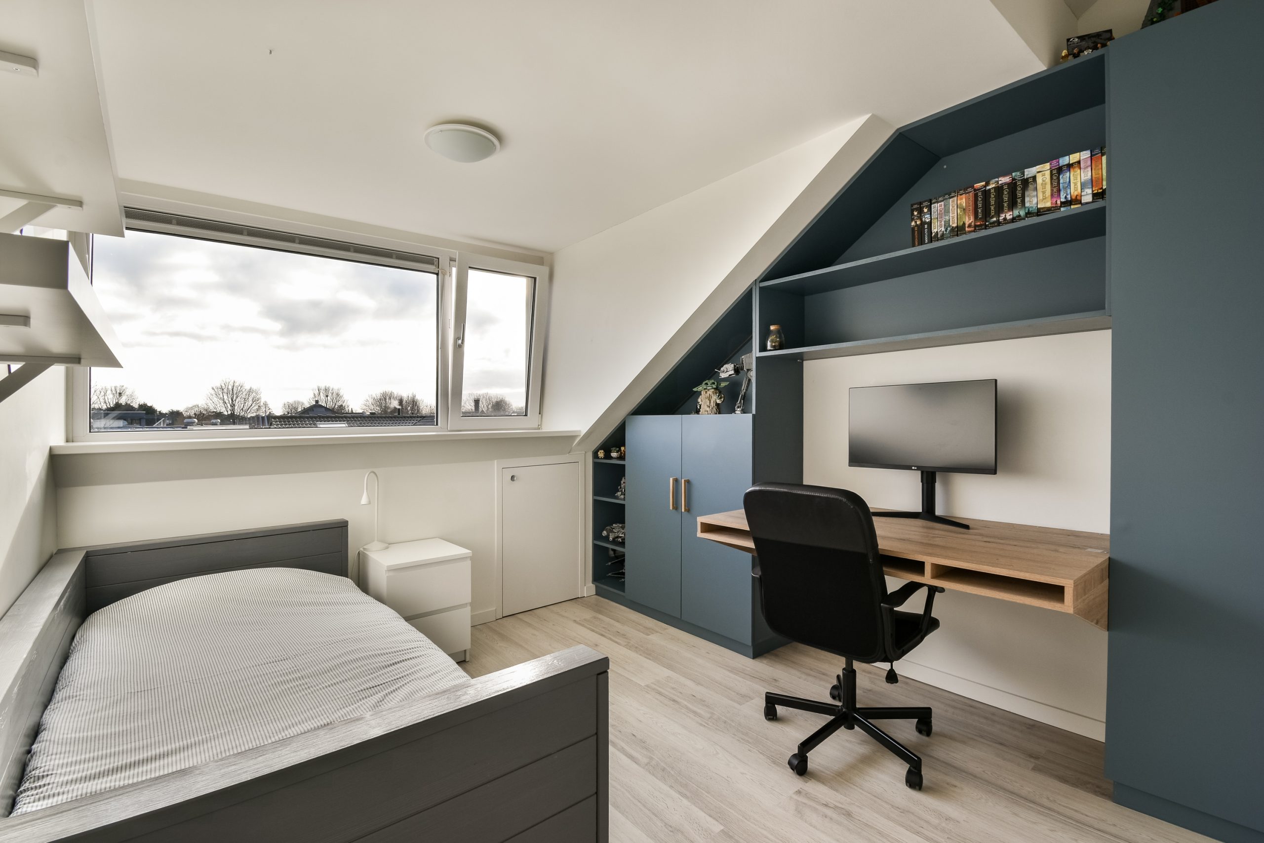 Op deze verdieping bevindt zich de ruime vierde slaapkamer met dakkapel. De gehele dakkapel is voorzien van een elektrisch rolluik en de ramen zijn uitgerust met horren.
