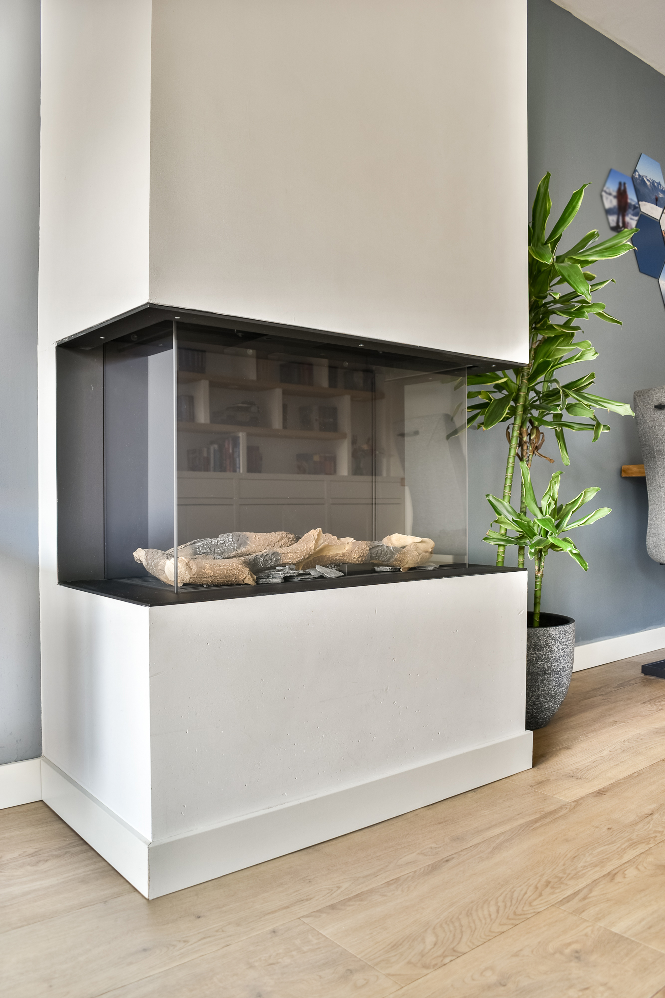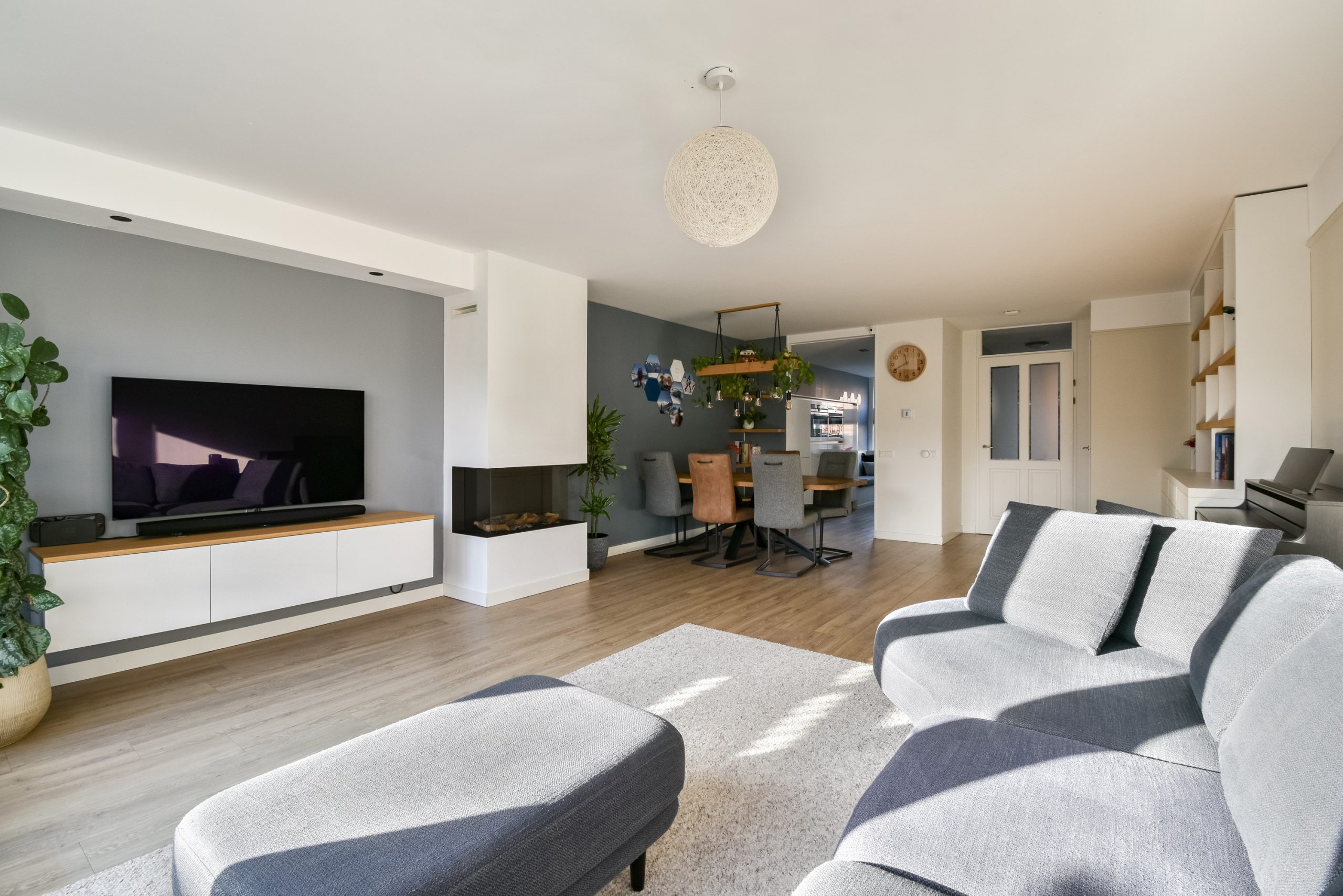 Bij binnenkomst valt direct de lichte en ruime woonkamer op. De uitbouw zorgt voor extra leefruimte en de gezellige gashaard maakt het geheel sfeervol en warm. Onder de trap bevindt zich een praktische kast voor extra bergruimte. Op de gehele begane grond ligt een fraaie PVC vloer met comfortabele vloerverwarming.