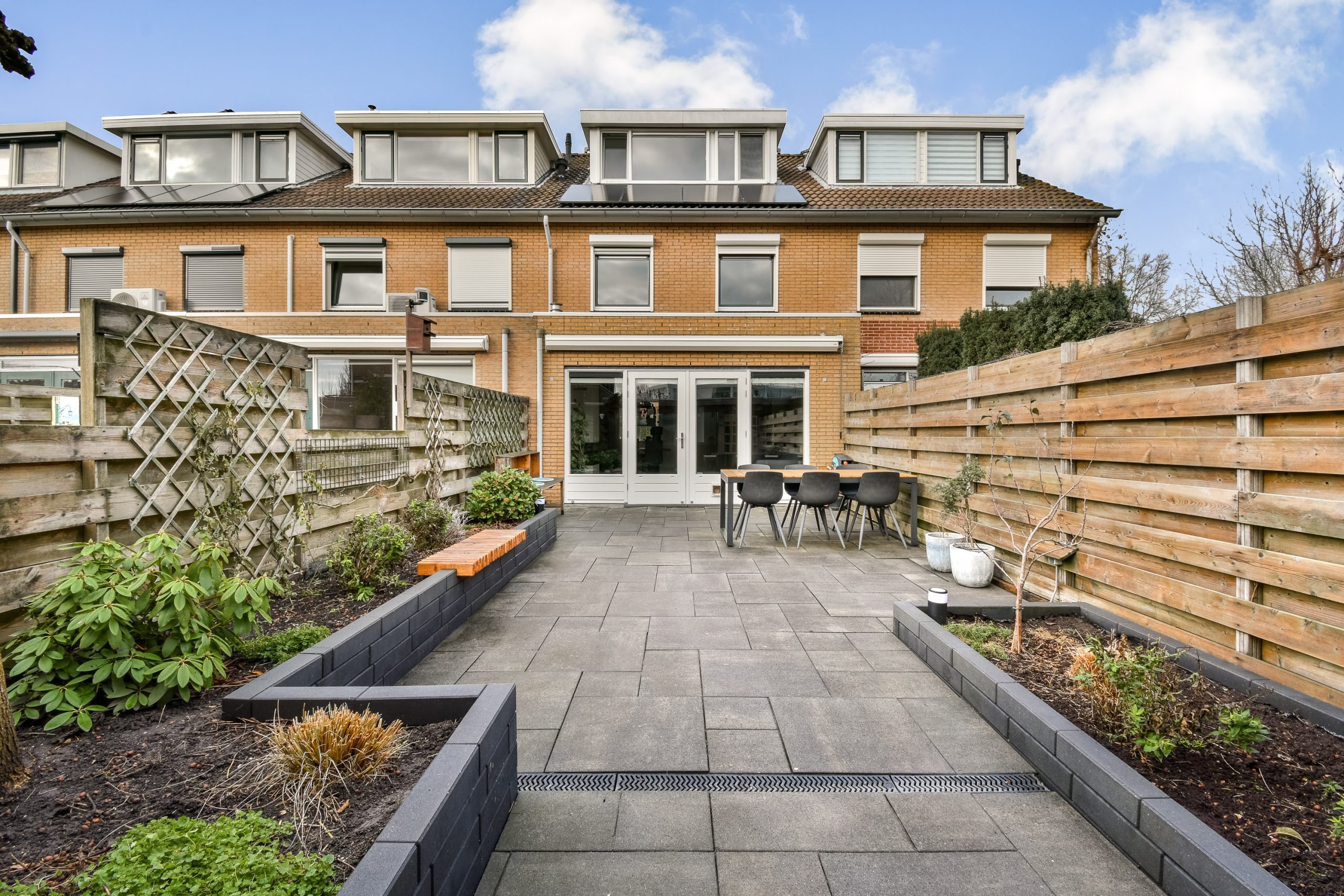 - Zeer diepe achtertuin van ruim 14 meter met grote overkapping en achterom