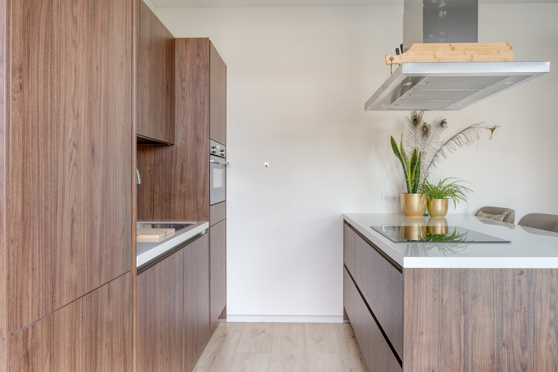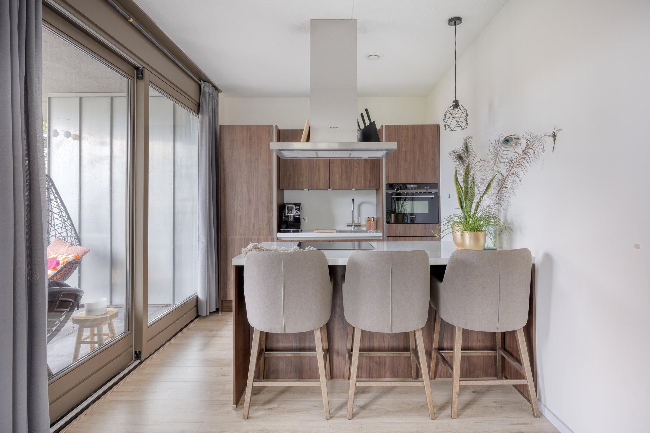 De lichte en ruime woonkamer heeft grote ramen die zorgen voor veel lichtinval en een fijn uitzicht. De moderne open keuken is uitgerust met Siemens inbouwapparatuur, waaronder: inductiekookplaat, afzuigkap, combi-oven, heetwaterkraan, koel-vriescombinatie en vaatwasser.