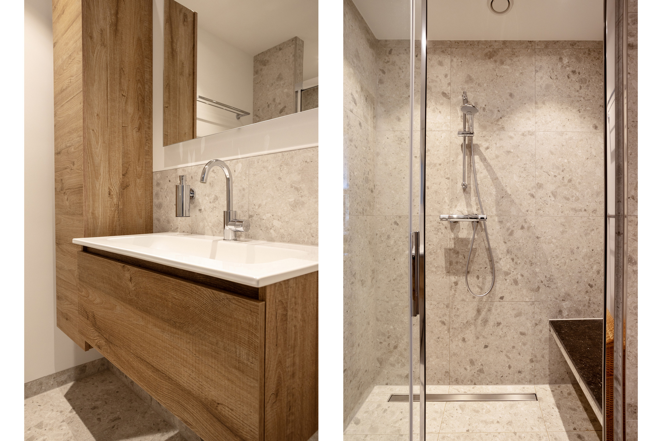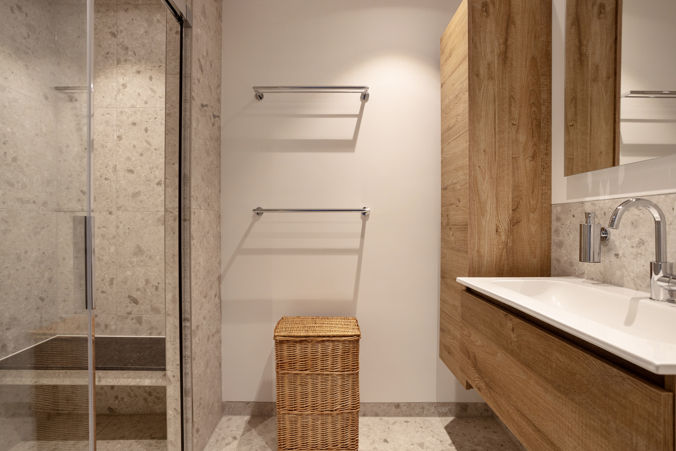 De moderne badkamer is voorzien van een douche, vloerverwarming, wastafelmeubel en verlichte spiegel met verwarming.