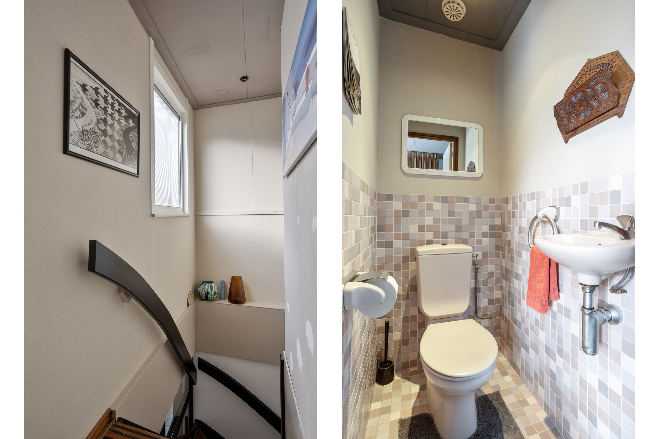 Door de geplaatste kunststof dakopbouw is er extra woonruimte gecreëerd. De overloop biedt toegang tot een tweede toilet en de derde slaapkamer. Deze ruime kamer is voorzien van een wastafel en een nette laminaatvloer.
