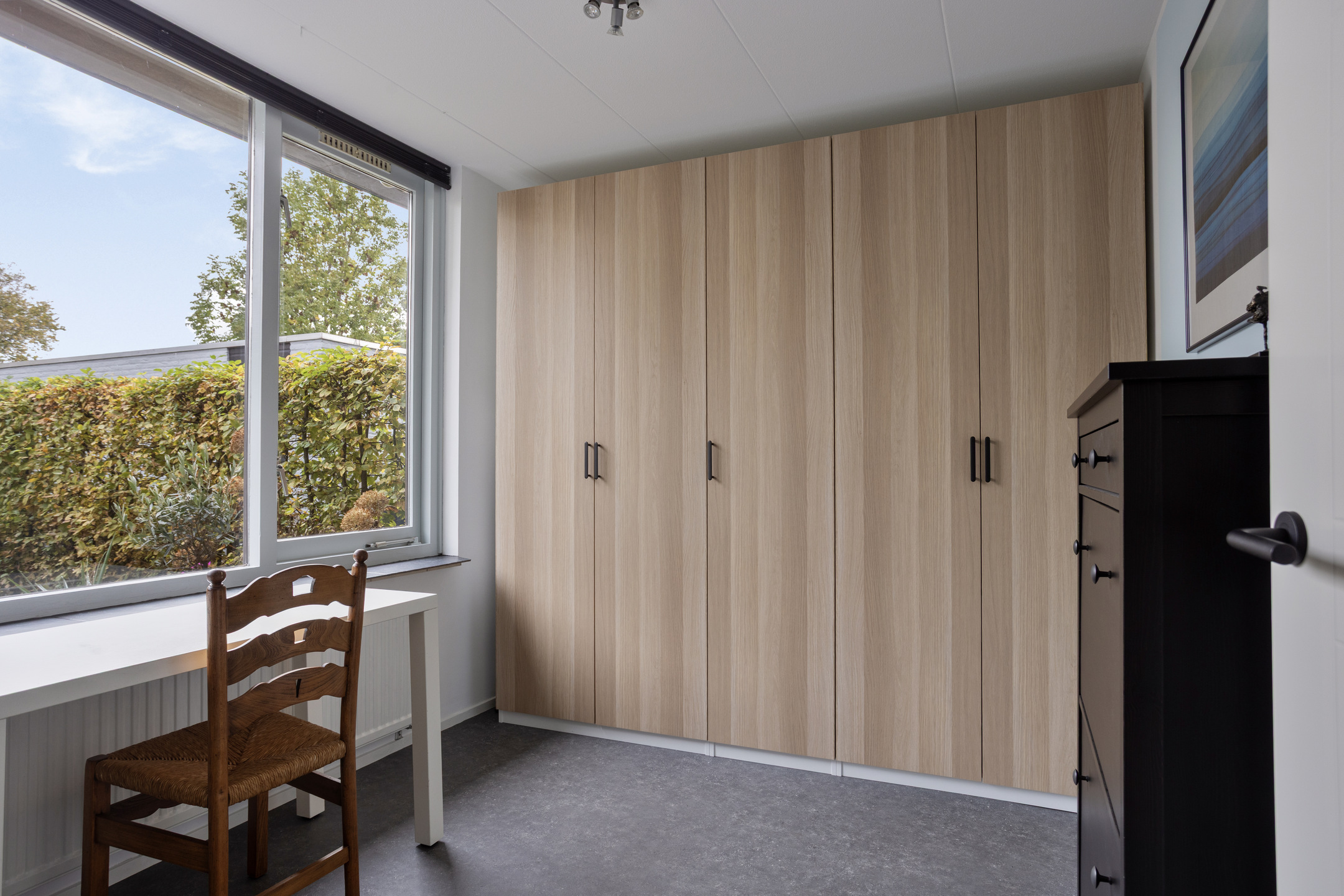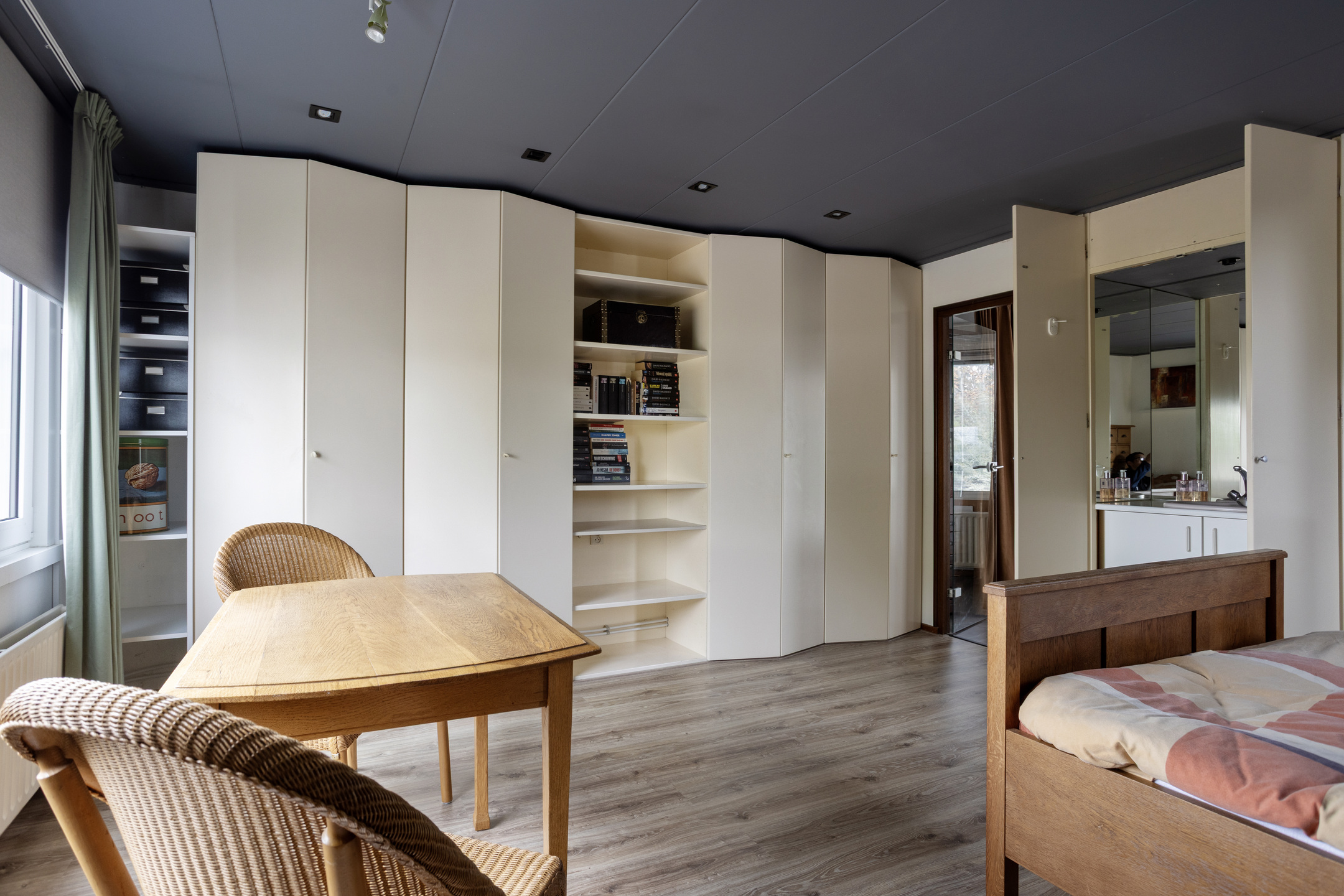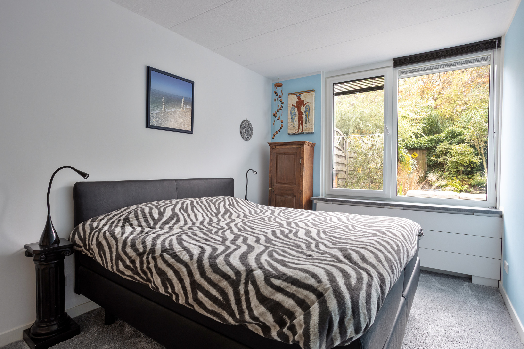 De hoofdslaapkamer bevindt zich aan de achterzijde en beschikt over vaste kasten en uitzicht op de tuin.
