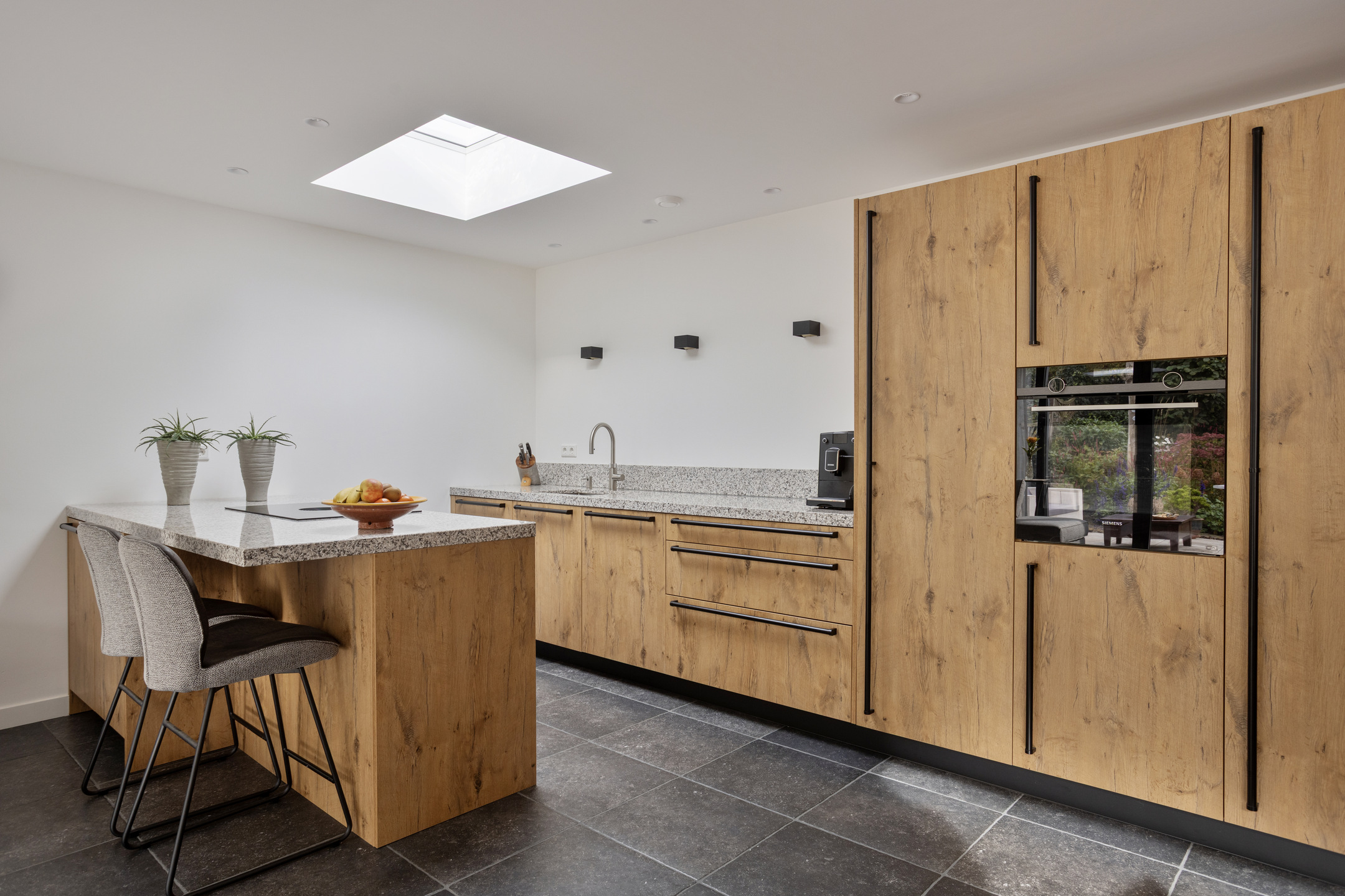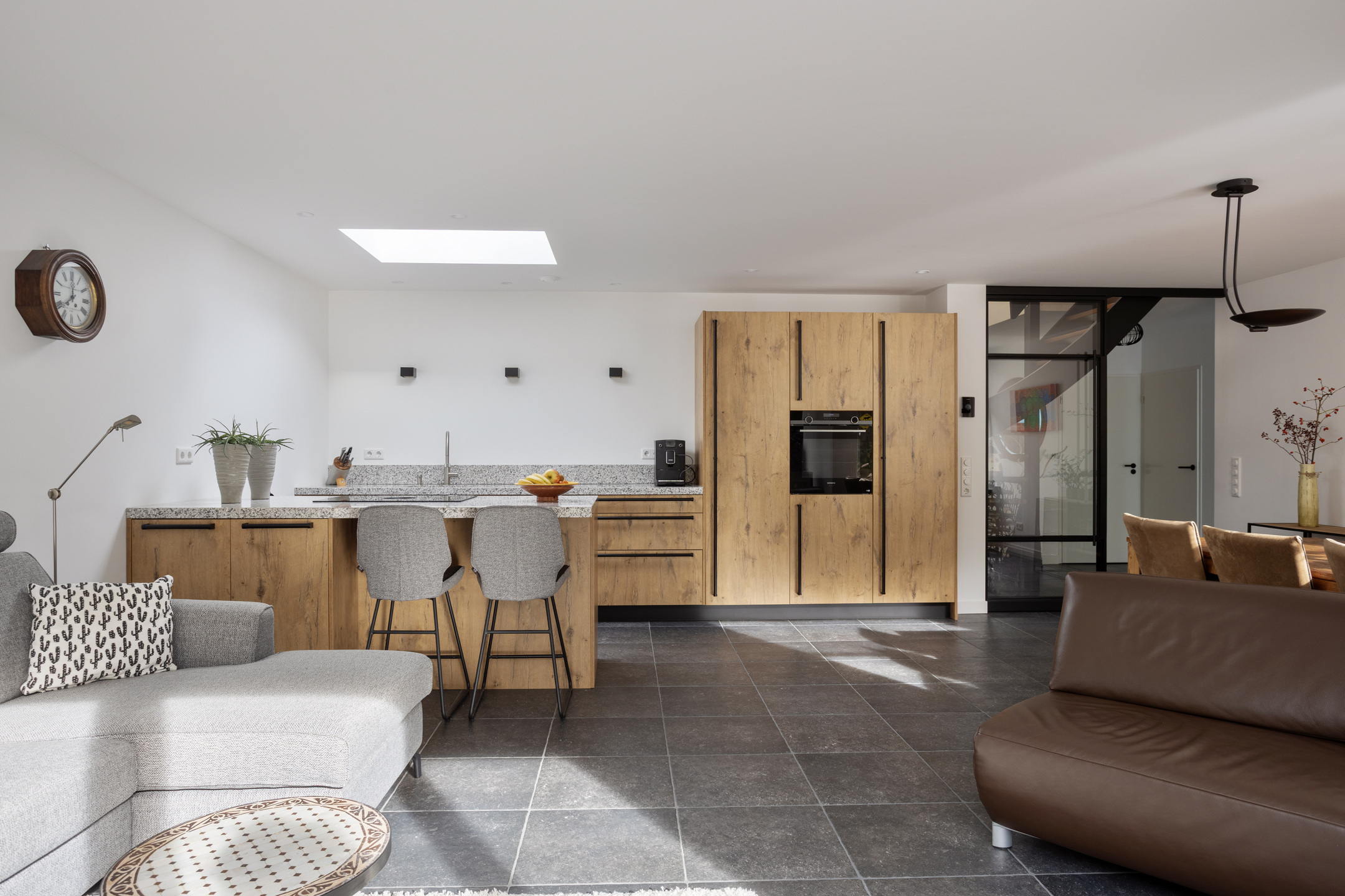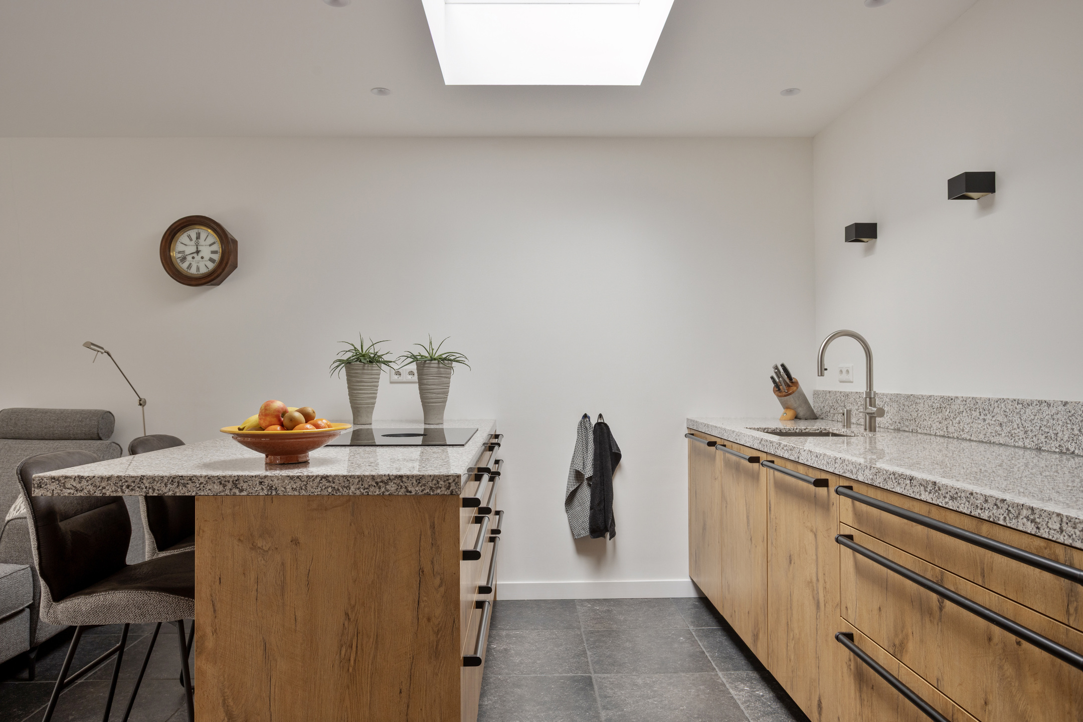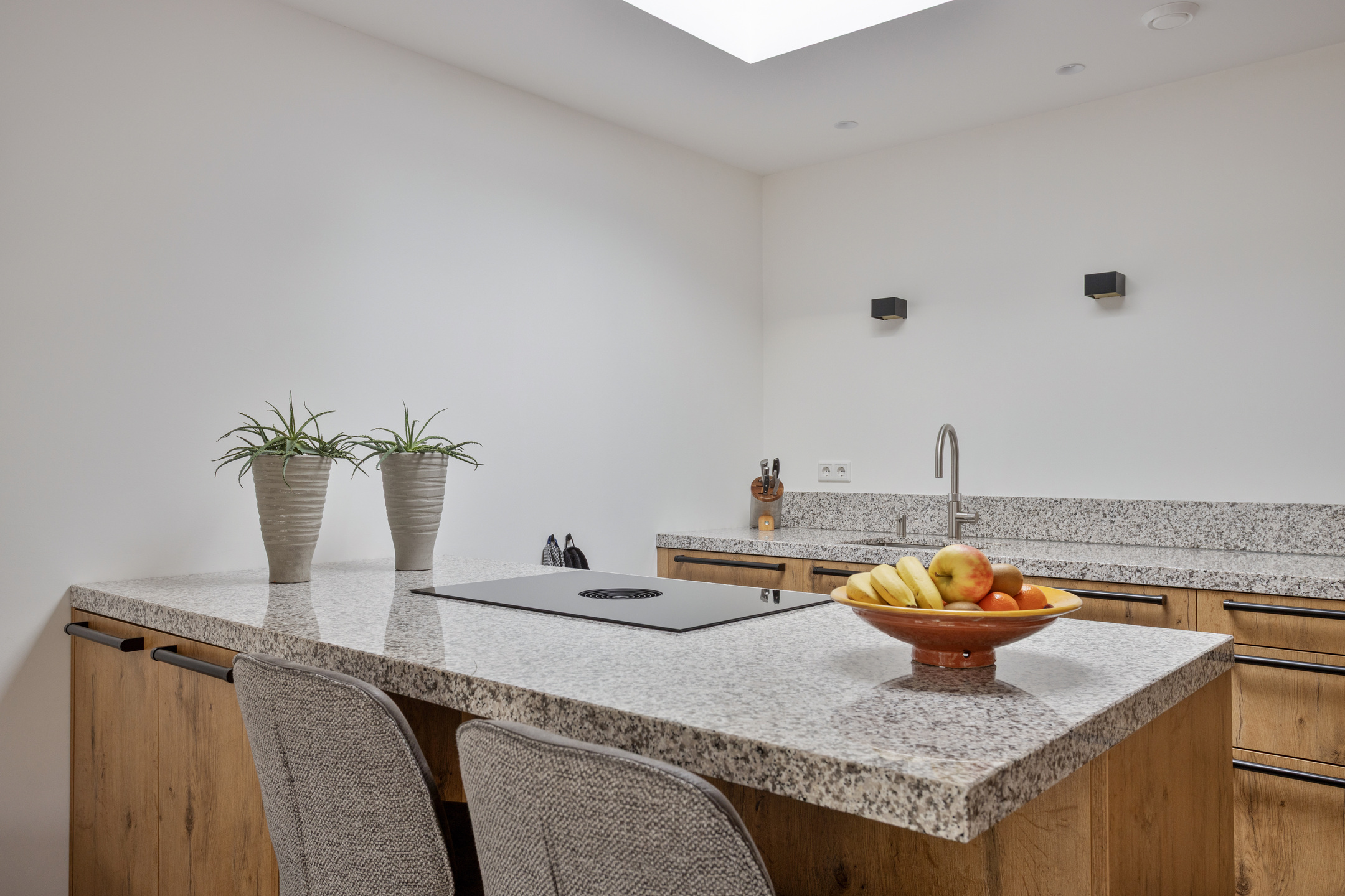De open keuken met kookeiland is uitgerust met een inductiekookplaat met Bora-afzuigsysteem, vaatwasser, oven, koelkast, vriezer en Quooker. Dankzij de lichtkoepel is er aangenaam veel daglicht.