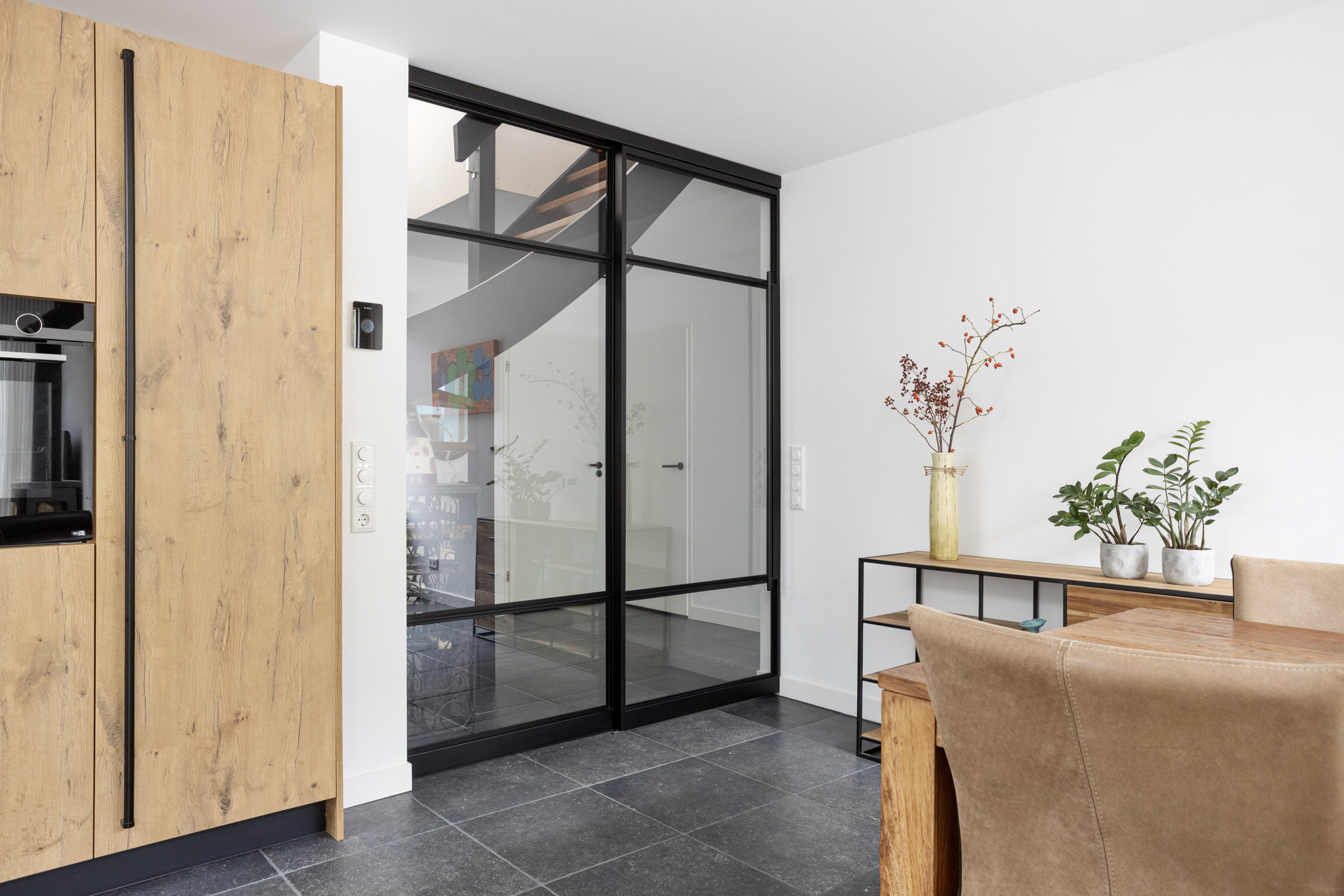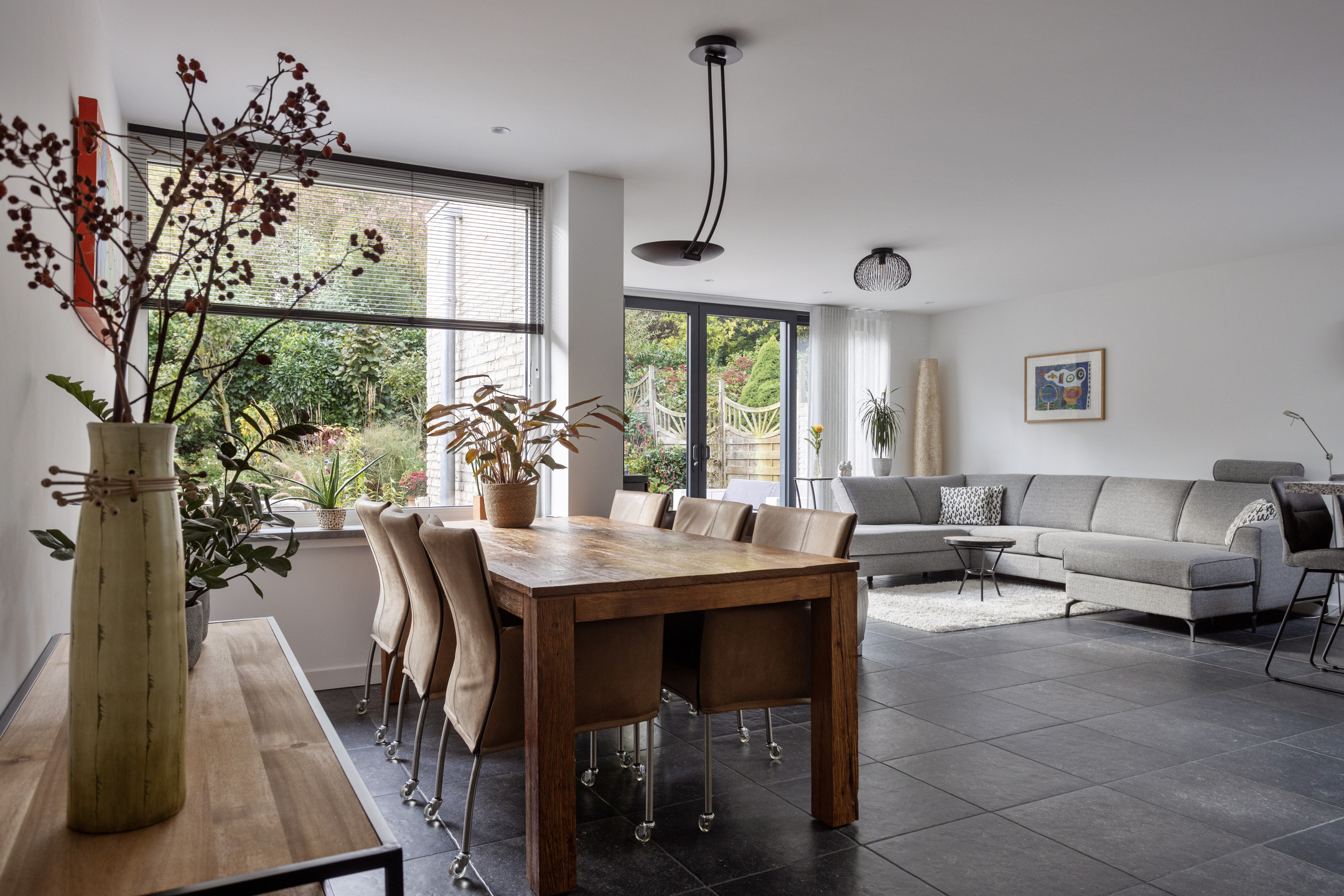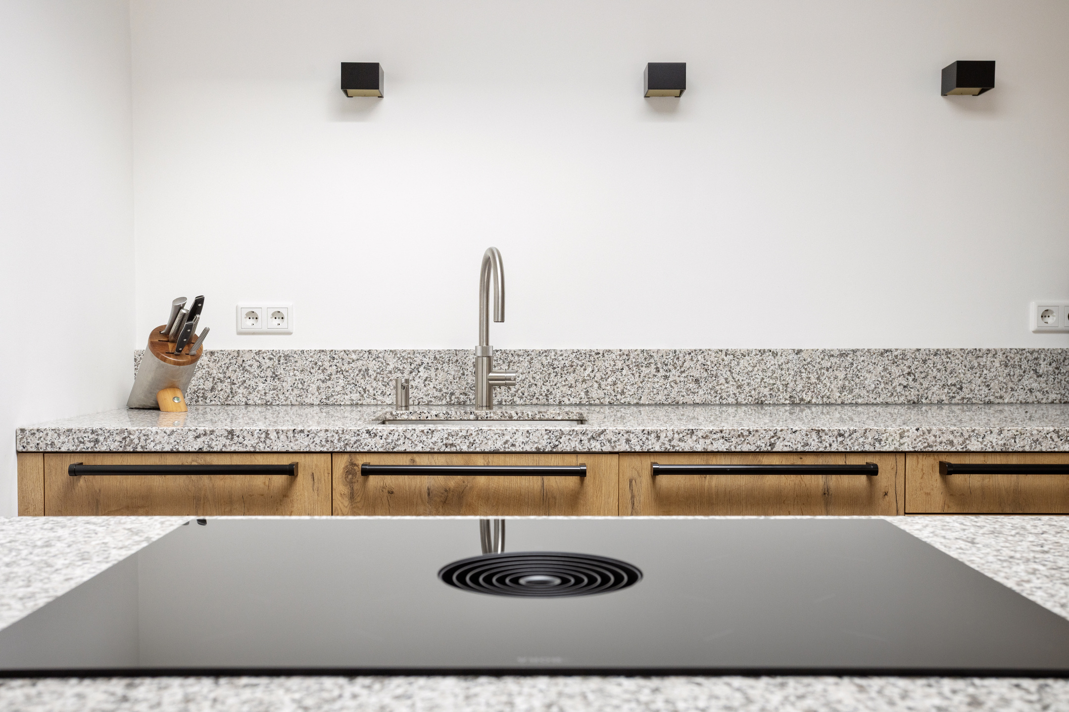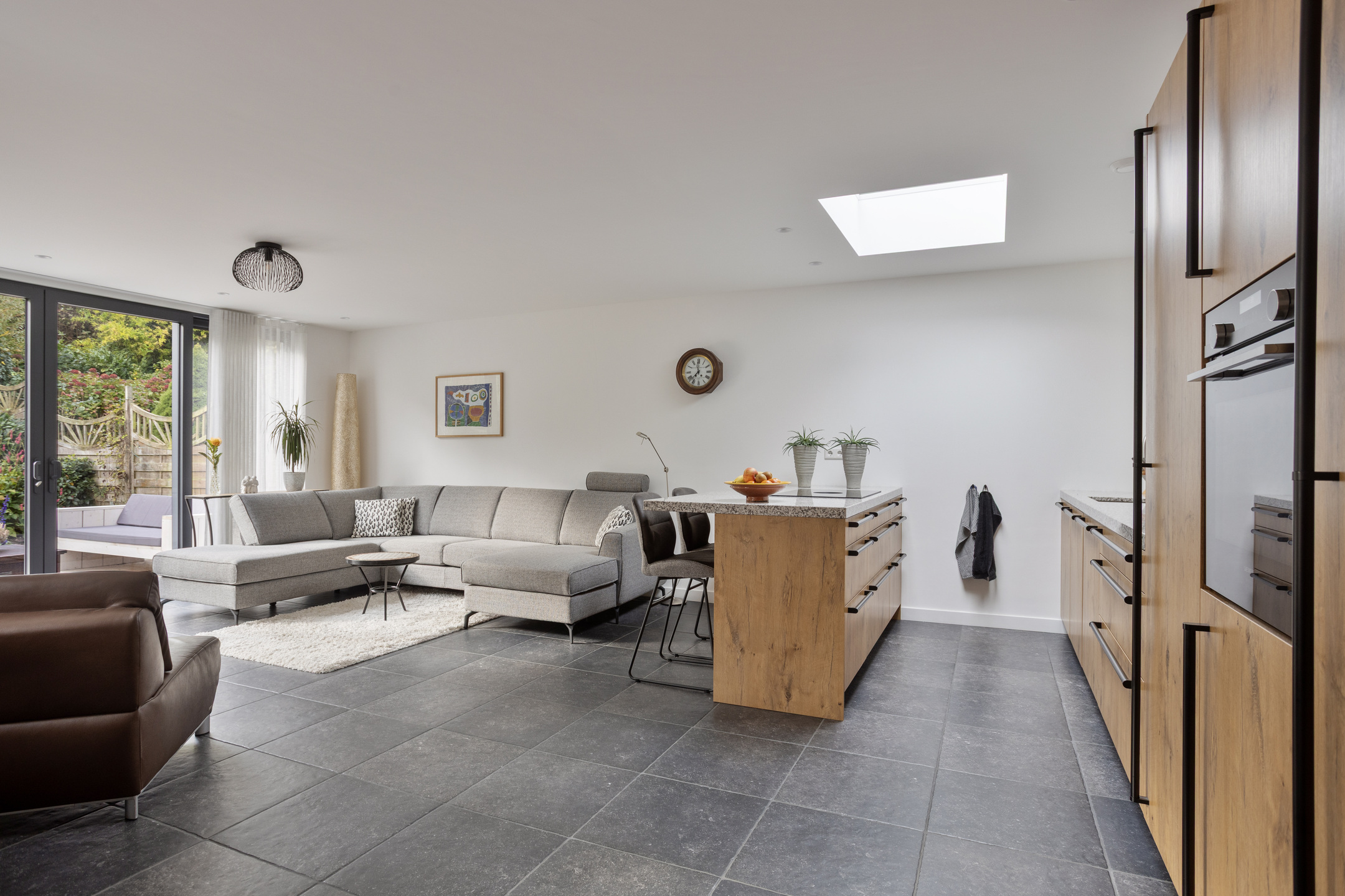 De open keuken met kookeiland is uitgerust met een inductiekookplaat met Bora-afzuigsysteem, vaatwasser, oven, koelkast, vriezer en Quooker. Dankzij de lichtkoepel is er aangenaam veel daglicht.