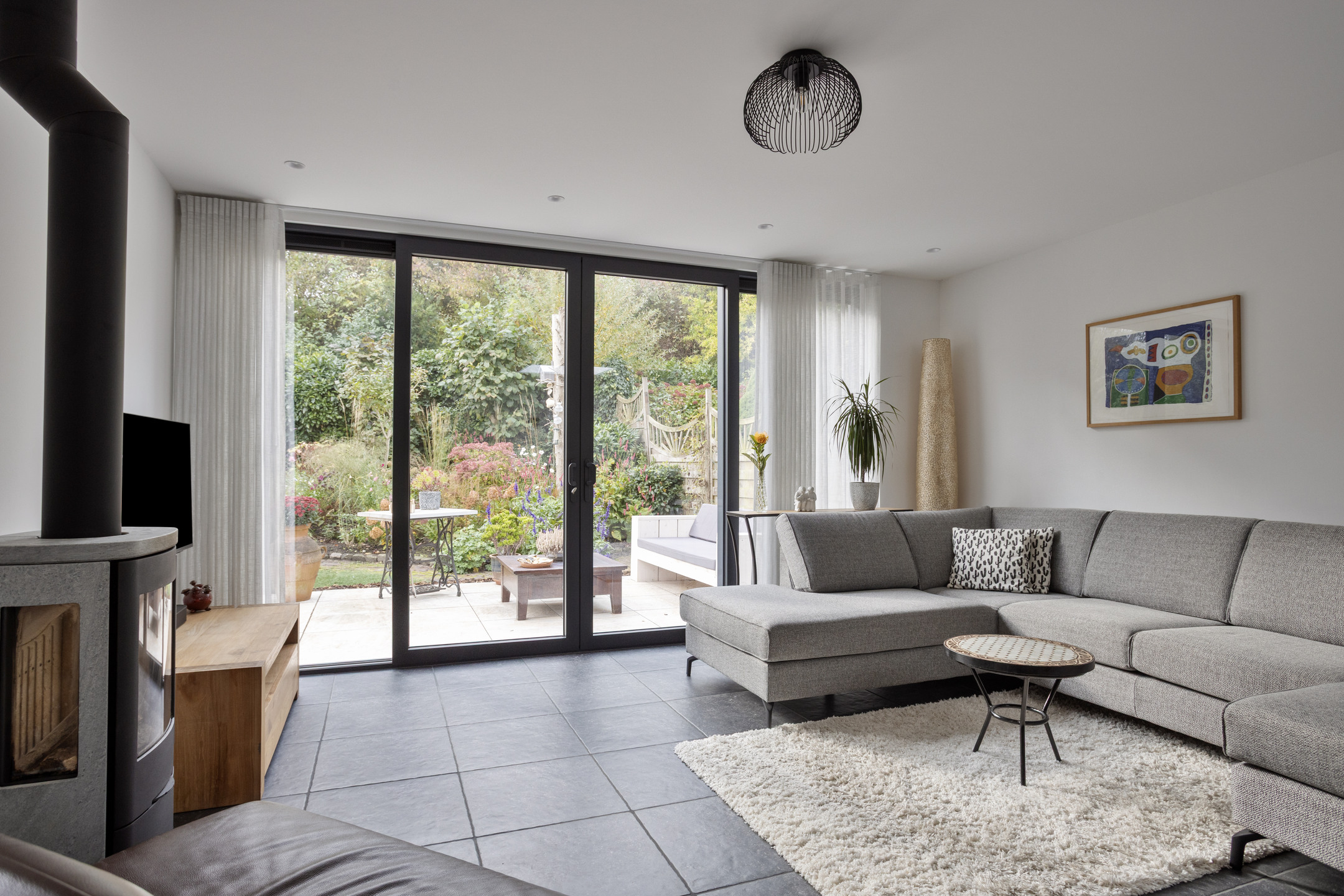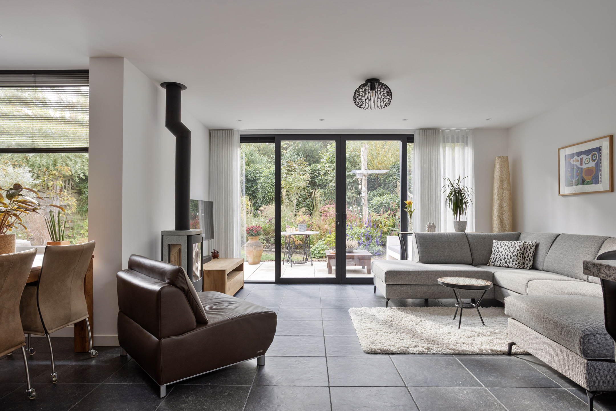 De sfeervolle woonkamer is voorzien van een plavuizen vloer met vloerverwarming, een gezellige haard en een schuifpui naar de fraai aangelegde achtertuin, gelegen op het zuiden.