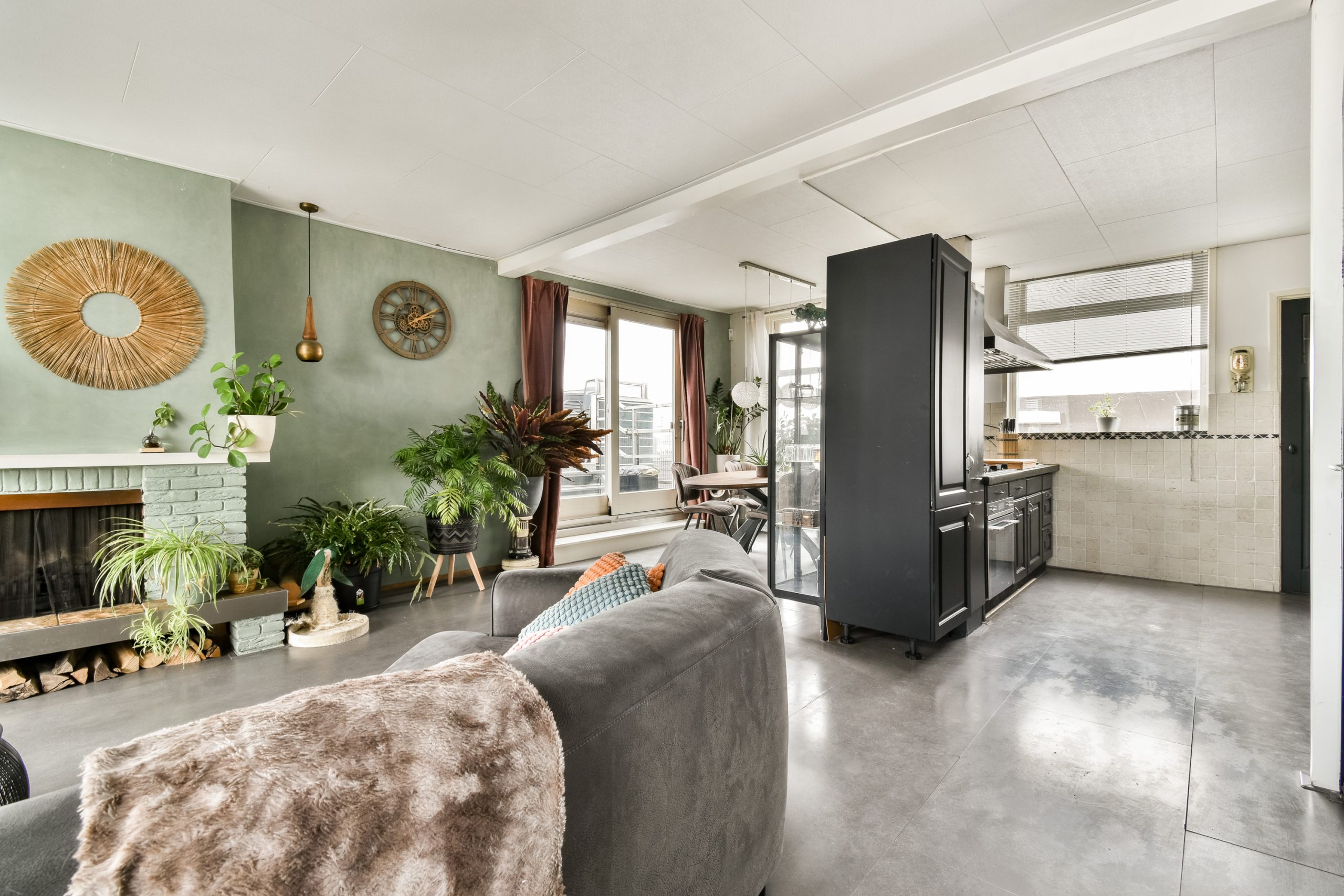 De lichte woonkamer is voorzien van een natuurstenen vloer en een gezellige gashaard. Via de schuifpui stap je het dakterras op met vrij uitzicht, waar je in de avonduren heerlijk kunt genieten van de ondergaande zon.
