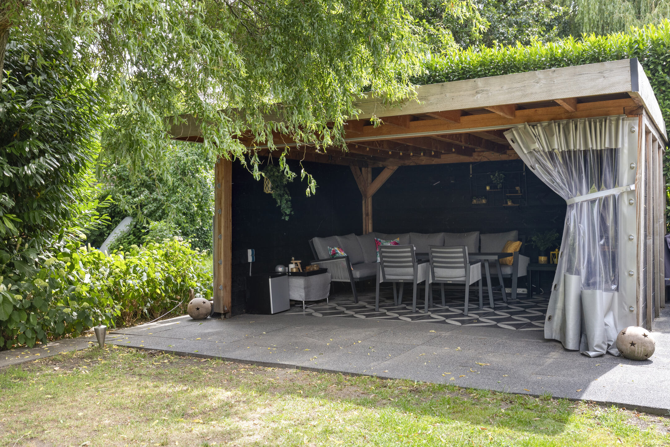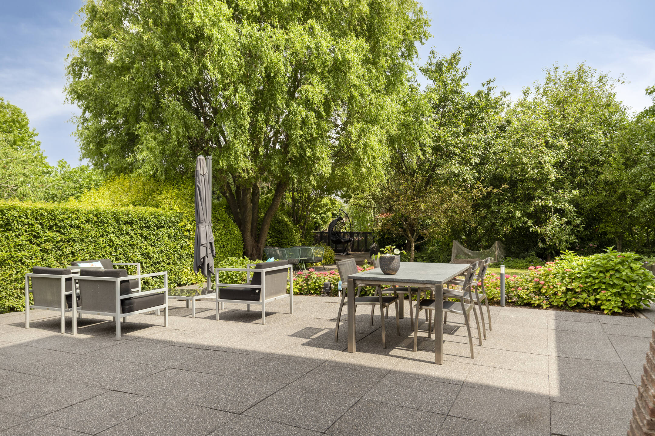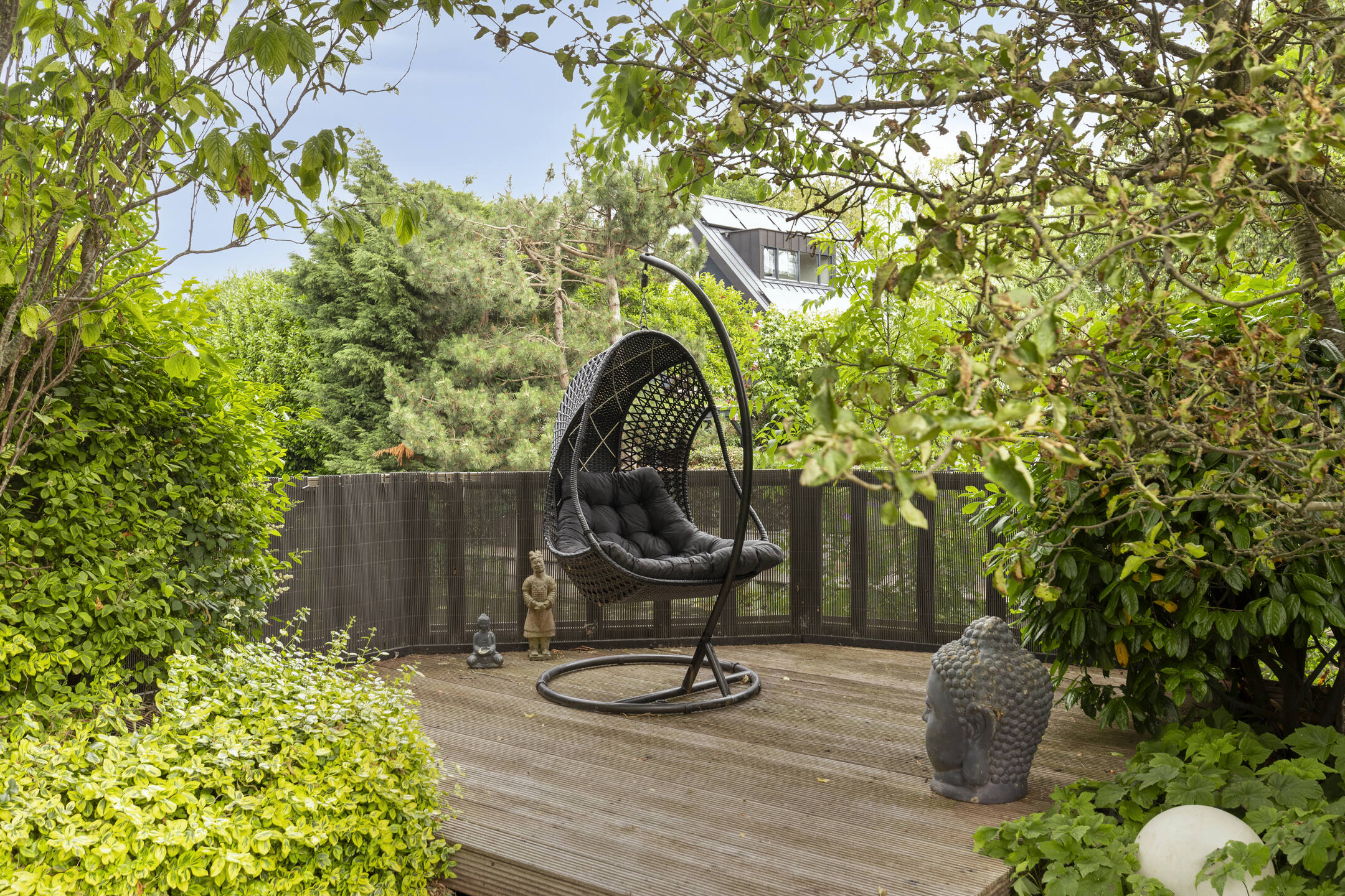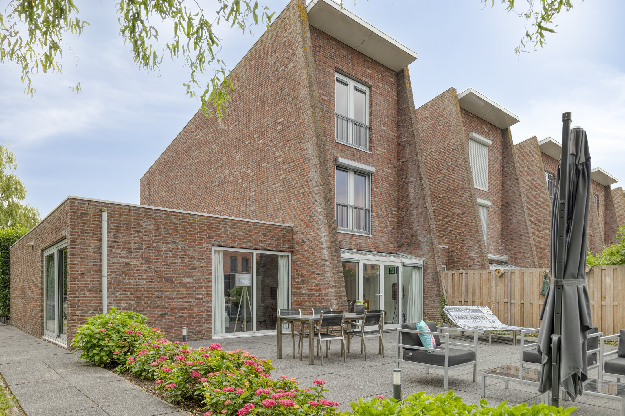 De zonnige achtertuin op het westen is fraai aangelegd en beschikt over meerdere terrassen, een stijlvolle overkapping en een vlonder aan de singel — een heerlijke plek om te ontspannen tot in de late uurtjes. Aan de voorzijde is parkeergelegenheid voor drie auto’s op eigen terrein en directe toegang tot de garage.