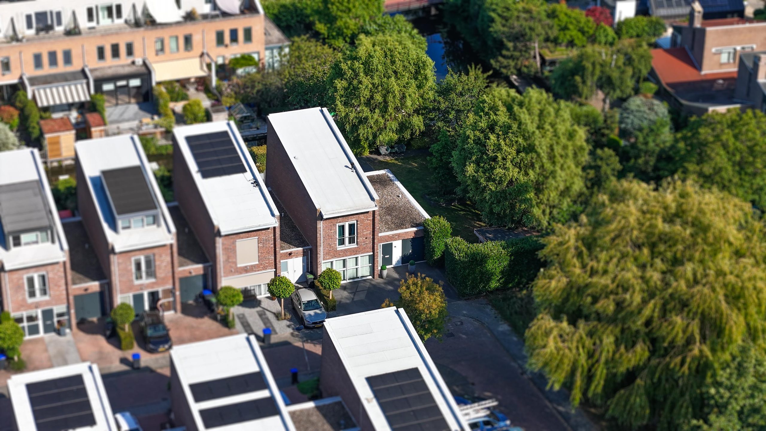 The sunny west-facing backyard is beautifully landscaped and includes multiple terraces, a stylish covered seating area and a wooden deck by the canal — an ideal place to relax well into the evening. At the front of the property, there is private parking for three cars on the driveway, as well as direct access to the garage.