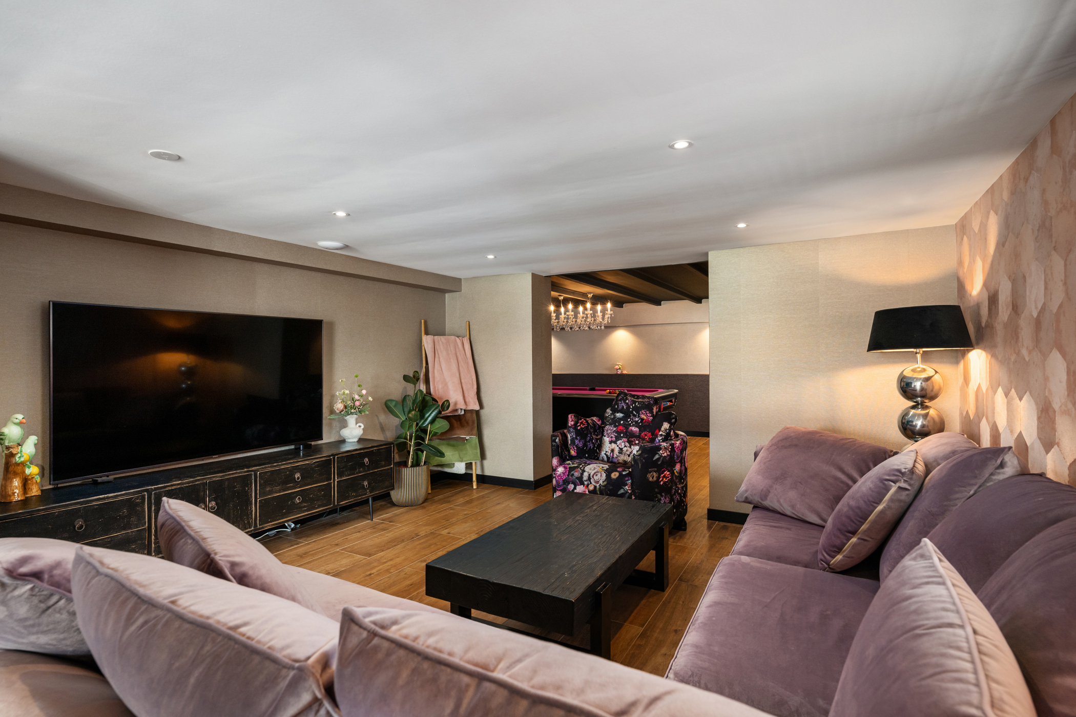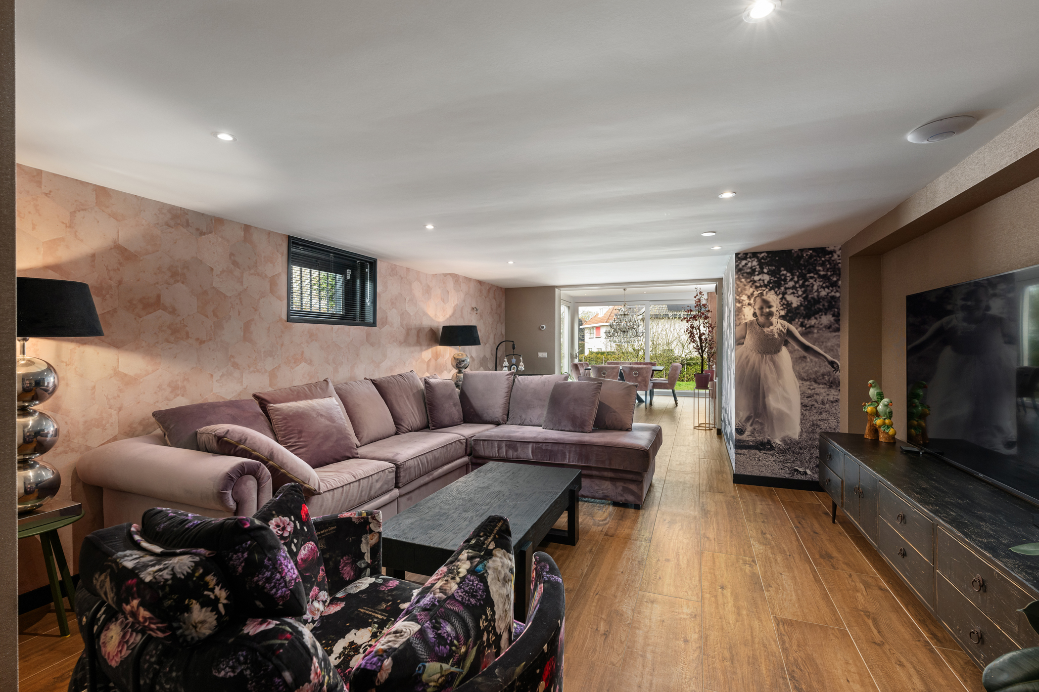 Via de entree in de zijgevel bereik je het souterrain, waar zich de indrukwekkende living bevindt.