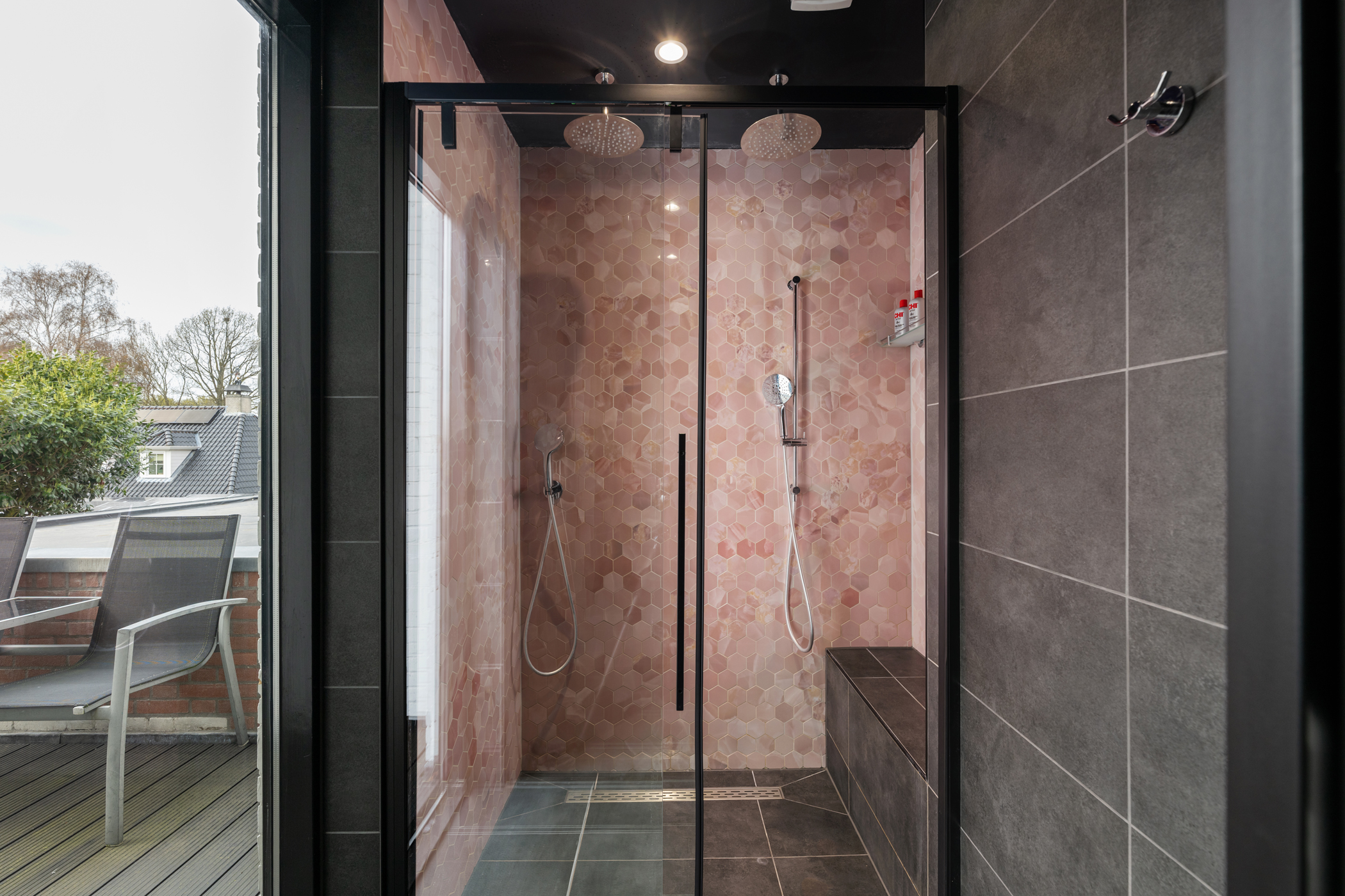 De luxe en moderne badkamer is zeer compleet uitgevoerd met een ligbad, sunshower, dubbele inloopdouche, dubbele wastafel en een verlichte spiegel.