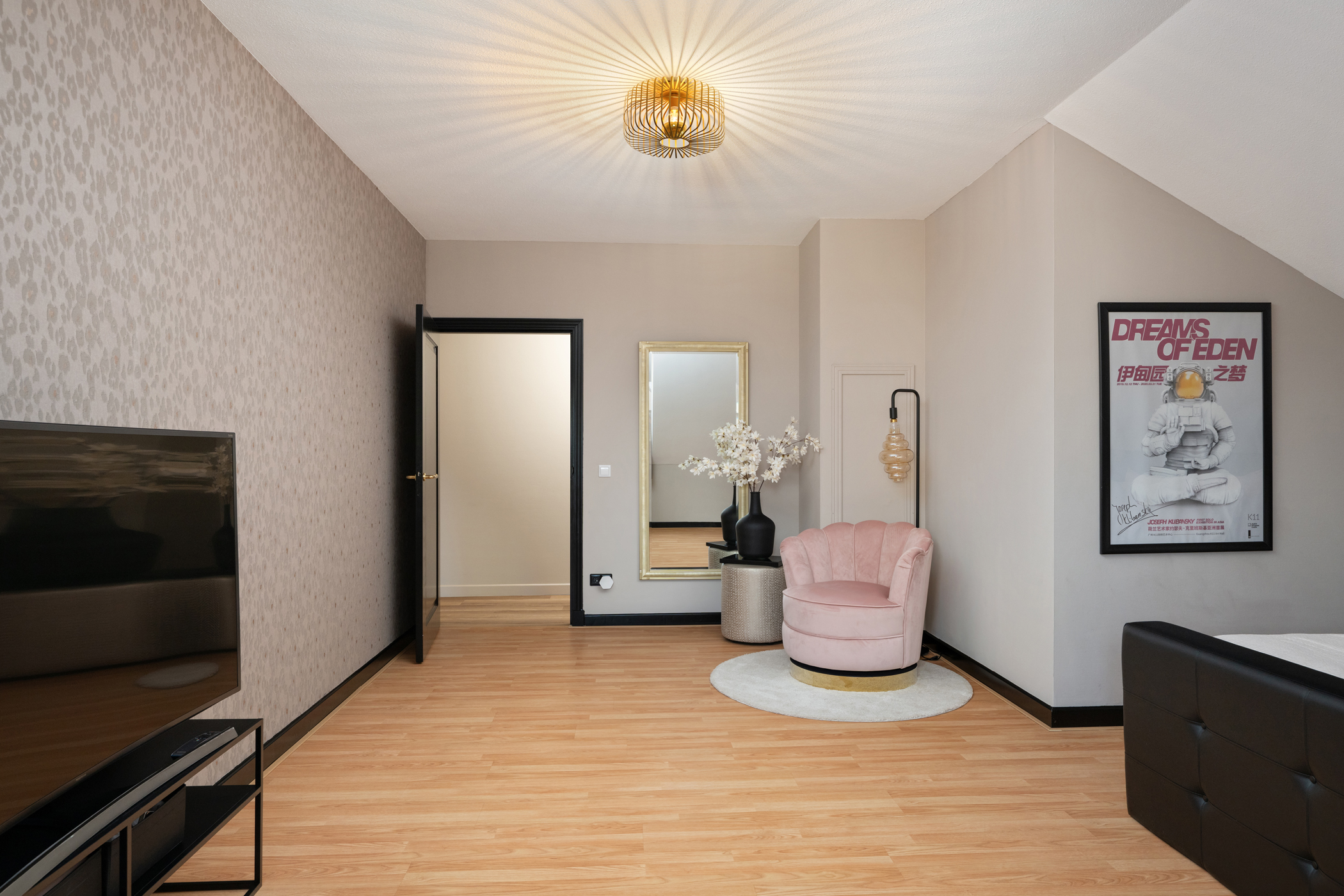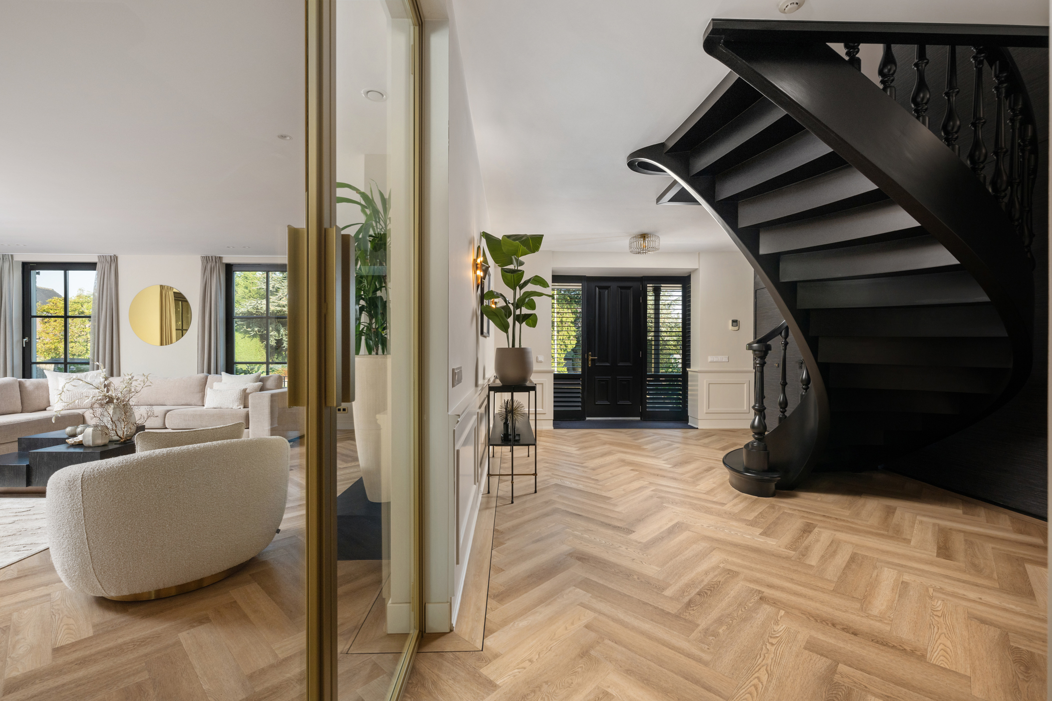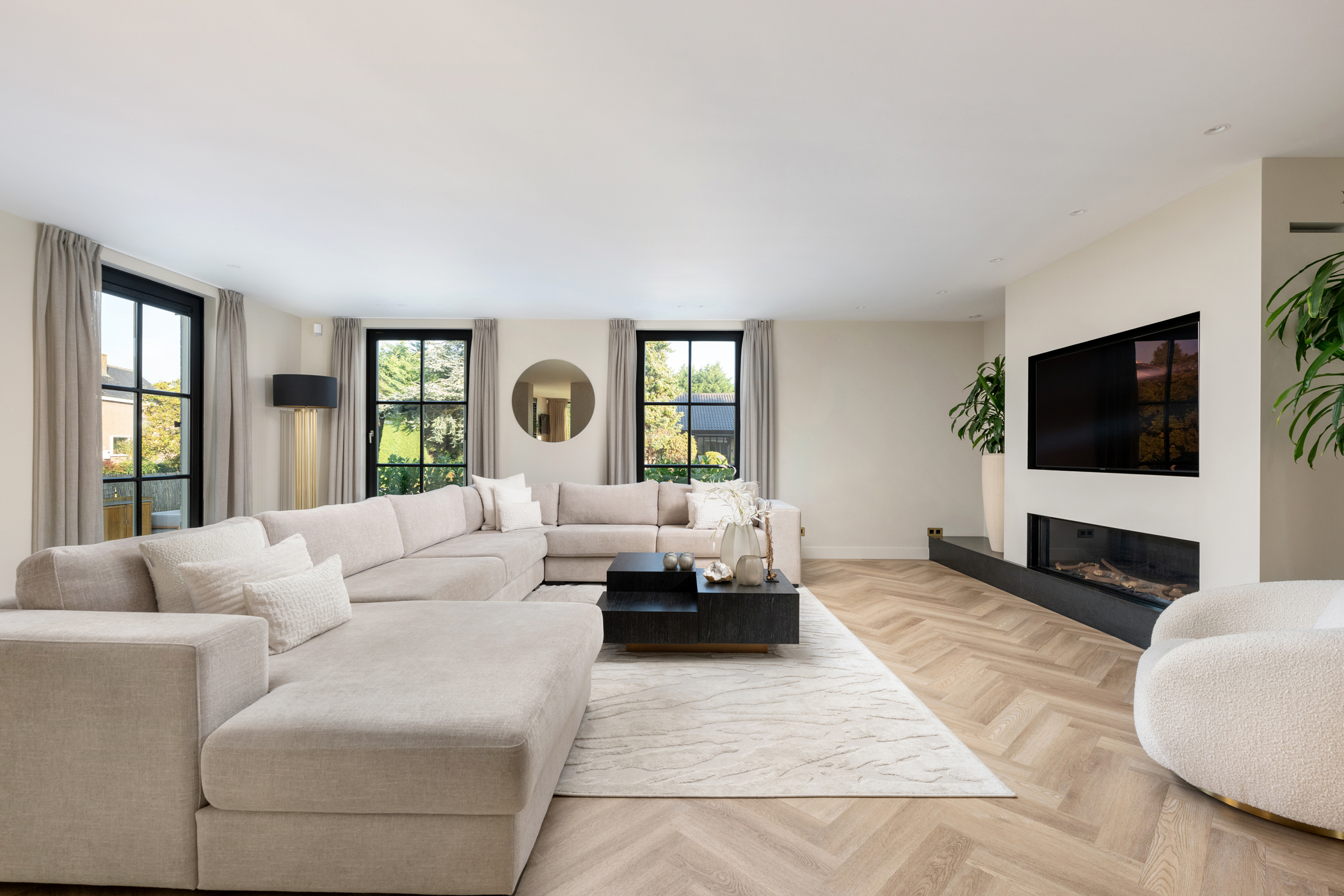 De royale woonkamer heeft een sfeervolle elektrische haard, screens, rolluiken en airconditioning, en een pvc-vissengraatvloer met vloerverwarming. Dankzij de grote raampartijen is de woonkamer licht en prettig ruim.