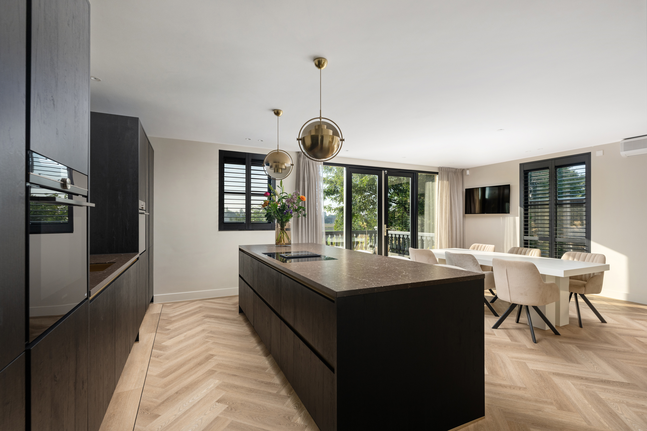 De moderne leefkeuken is voorzien van een stijlvol kookeiland en hoogwaardige inbouwapparatuur, waaronder inductiekookplaat met geïntegreerde afzuiging, combimagnetron, oven met stoomfunctie, koelkast, vriezer, vaatwasser en heetwaterkraan. Via openslaande deuren is het ruime, zonnige terras van ca. 29 m² bereikbaar.
