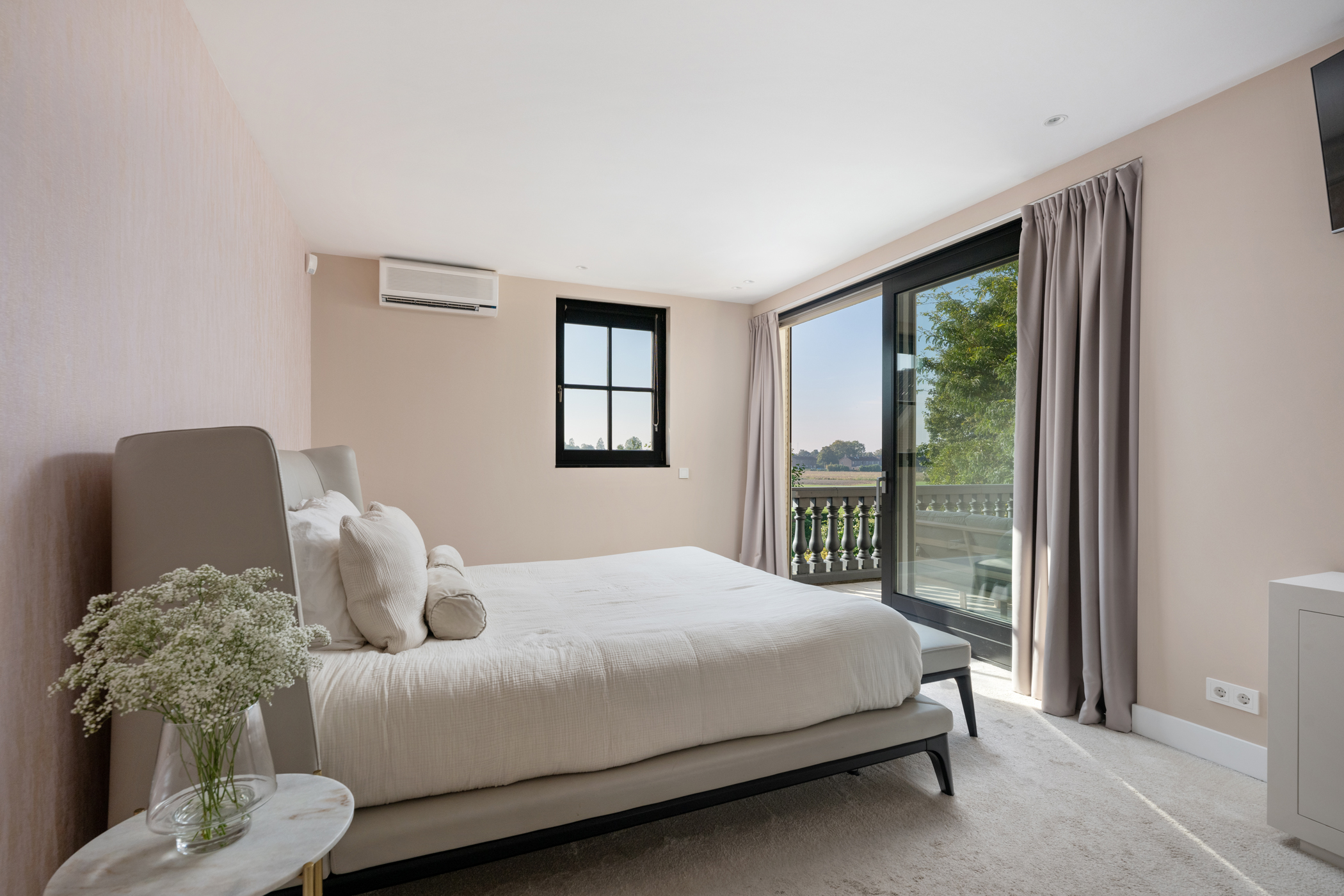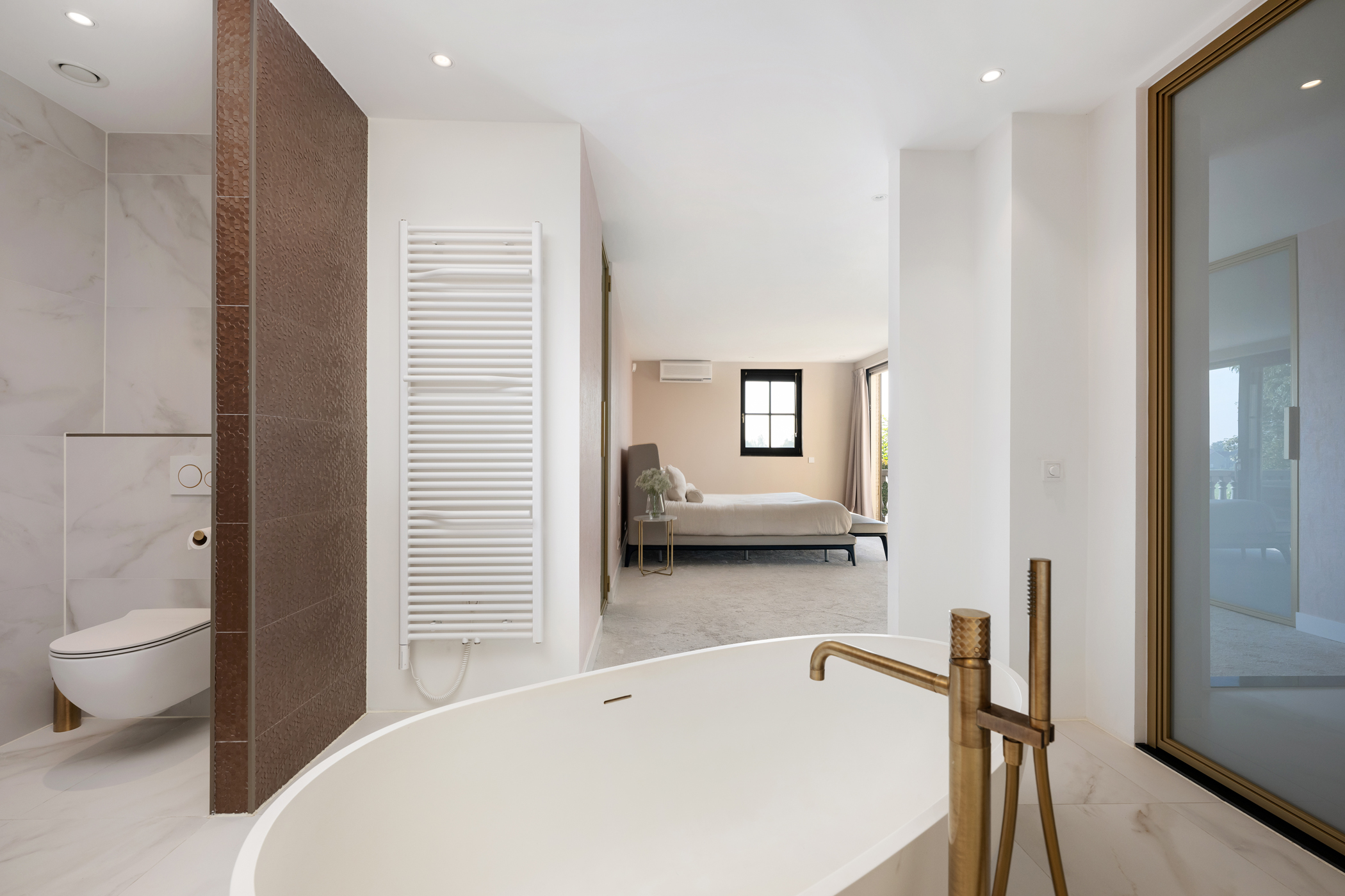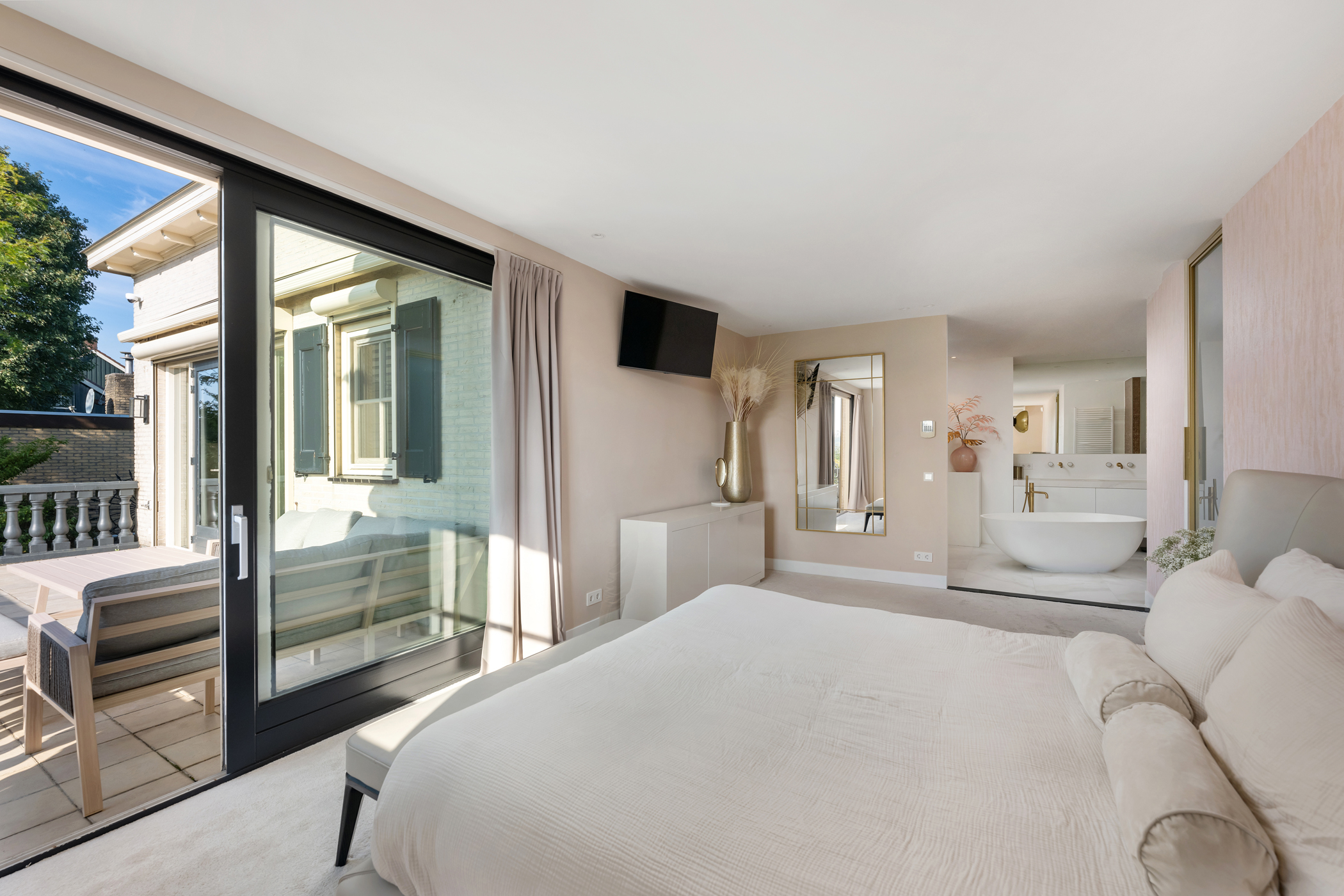 De master bedroom op de begane grond heeft een moderne ensuite badkamer met ligbad, dubbele wastafel, douche en toilet. De slaapkamer beschikt over airconditioning, vloerbedekking en een walk-in closet, en biedt via een schuifpui toegang tot het terras.