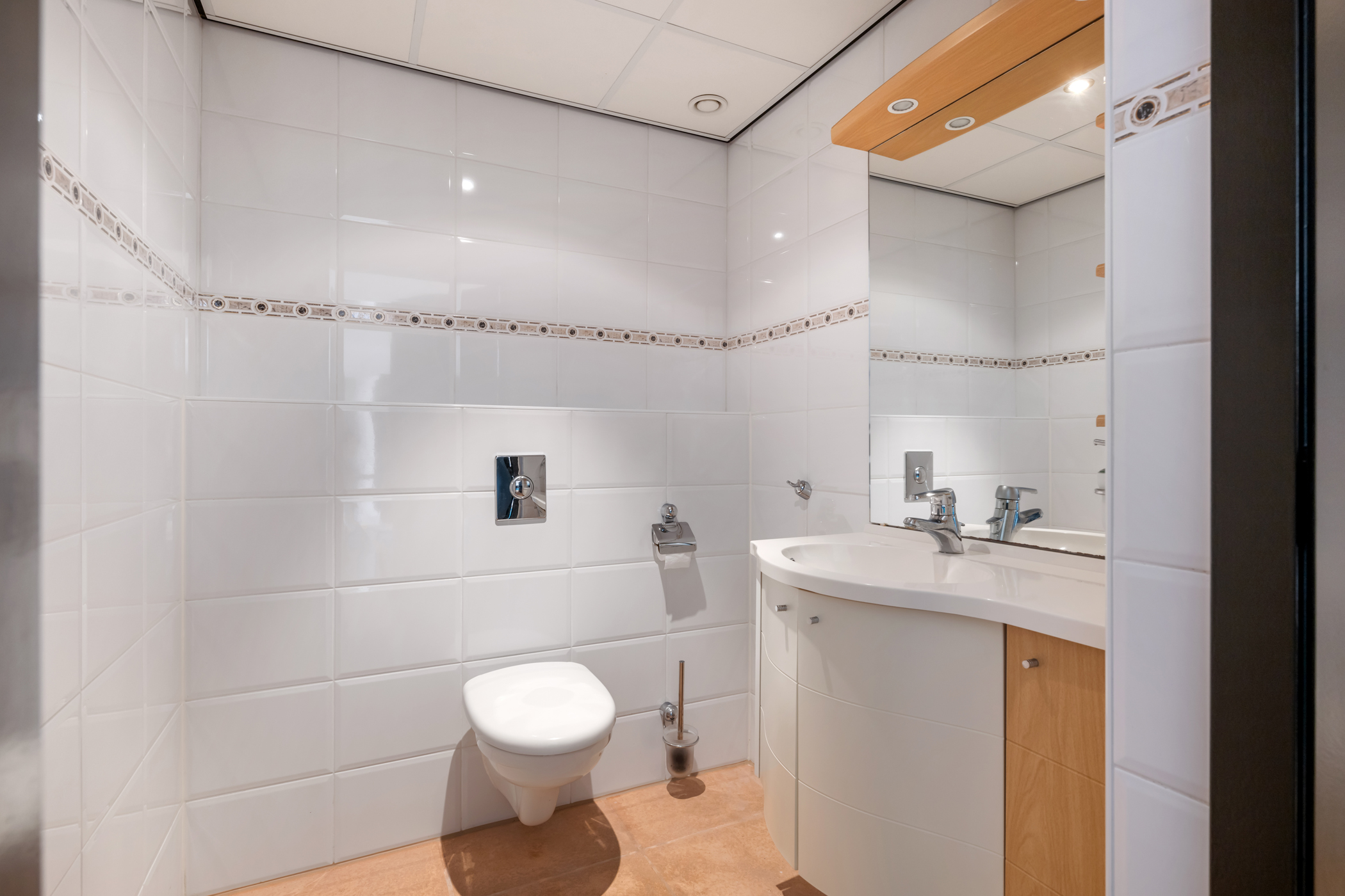 Aan het einde van de overloop bevindt zich de tweede badkamer, voorzien van toilet, wastafel en douchecabine.