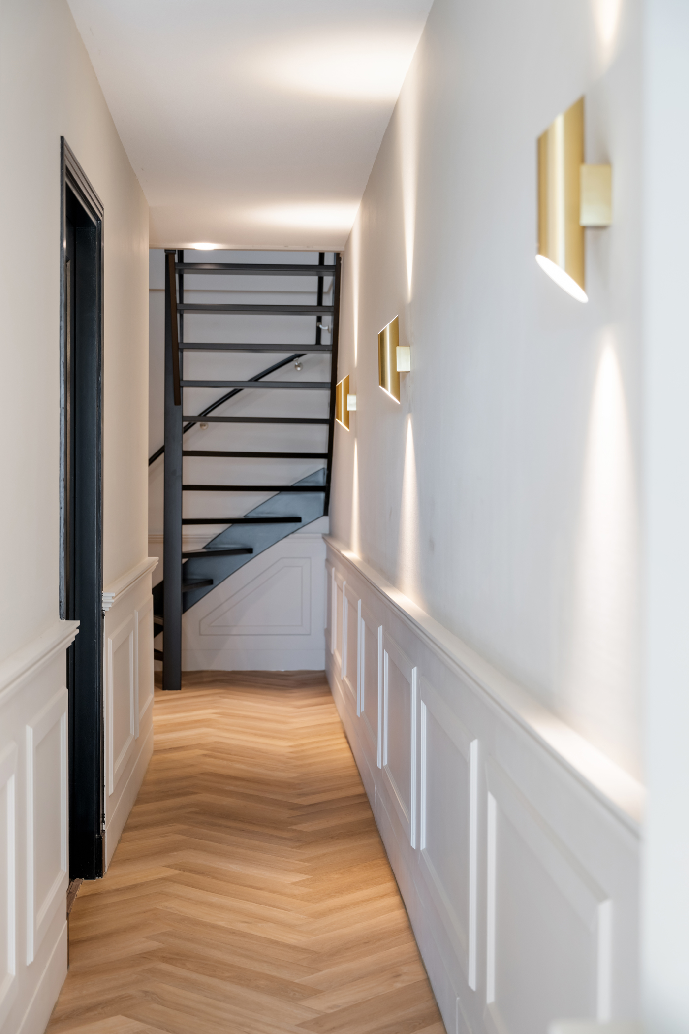 Lange gang met toegang tot een kantoorruimte met schuifpui naar de achtertuin en bergruimte.